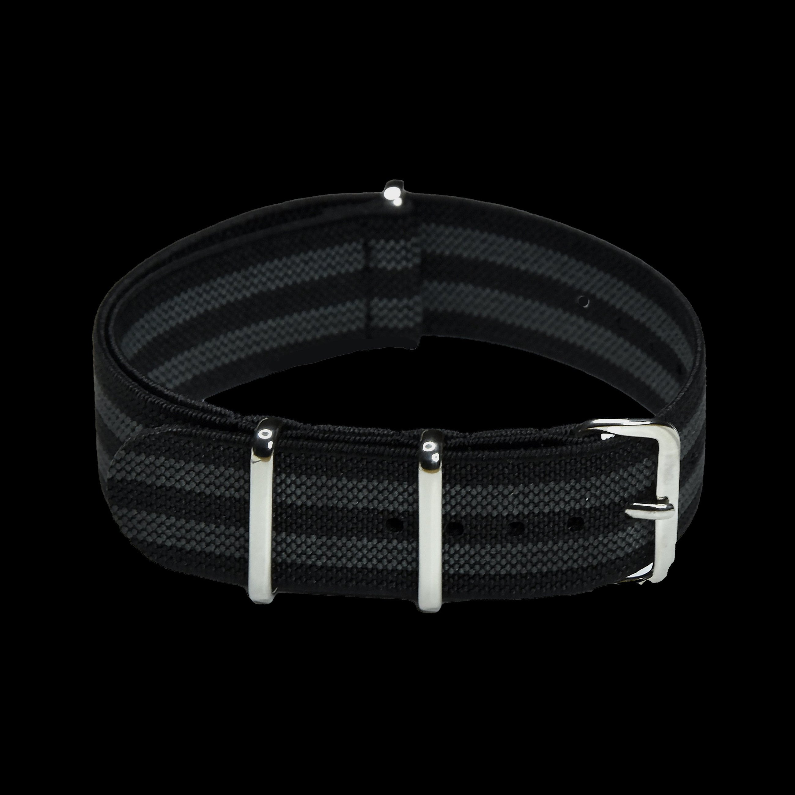 20mm Elasticated “Bond” Black and Grey NATO Militair Horloge Strap – Authentiek Militair Design met hoogwaardig uurwerk en duurzaam ontwerp. Geschikt voor dagelijks gebruik en liefhebbers van militaire stijl.
