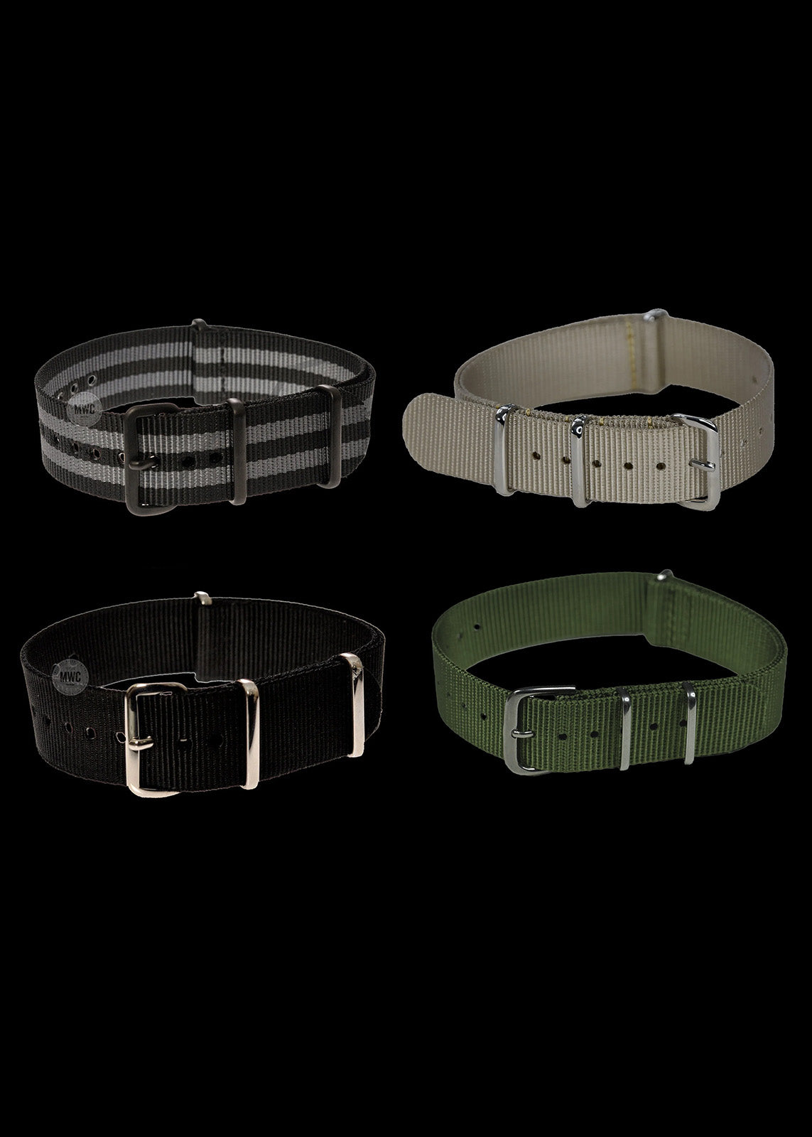 Een leuke set voor jezelf of als cadeau voor een liefhebber! 4 horlogebanden met een breedte van 18mm in de kleuren Olijfgroen, Desert-tan, Zwart en James Bond (zwart met grijze streep). Specificaties: Materiaal: nylon Breedte: 18mm Kleuren: Olijfgroen, Desert-tan, Zwart en James Bond Over Military Watch Company. Military Watch Company is een in Zwitserland gebaseerd horlogebedrijf, opgericht in 1974 door Wolfgang Obrigheimer, die zijn hele leven militaire horloges heeft verzameld, ontworpen en geproduceerd. Sinds de oprichting richt het bedrijf zich uitsluitend op het ontwerpen en produceren van horloges met militaire specificaties. Military Watch Company produceert momenteel voor de defensies van verschillende landen horloges alsmede het re-produceren van de exacte horloges gebruikt door militairen in de jaren 1930-1980.