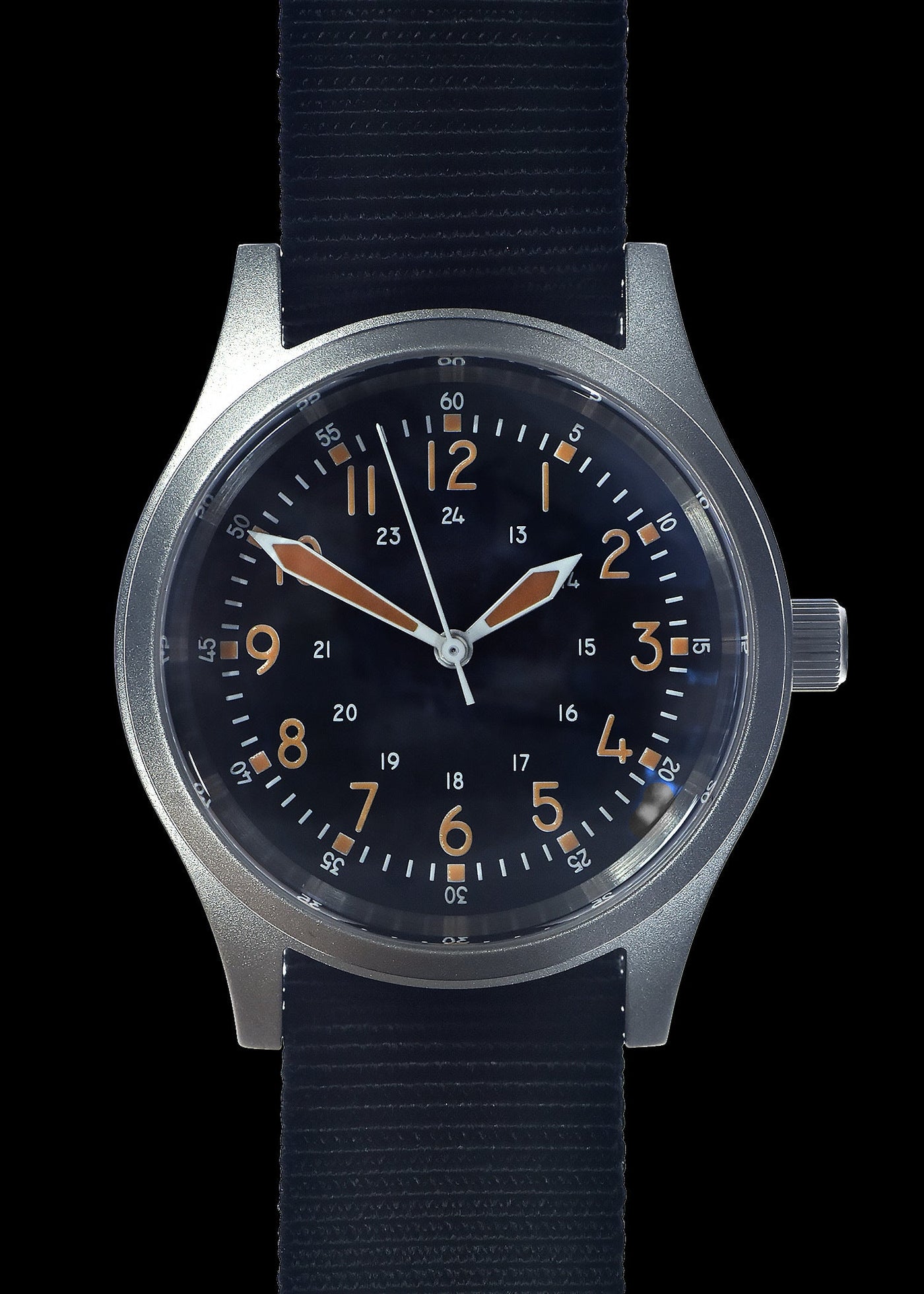 A-17 U.S 1950s Korean War Pattern 100m/330ft Water Resistant Militair Horloge with Shatter and Scratch Resistant Box Sapphire Crystal on a Retro Stainless Steel "Bonklip" Bracelet with a Black Militair Webbing Strap (Automatic) – Authentiek Militair Design
