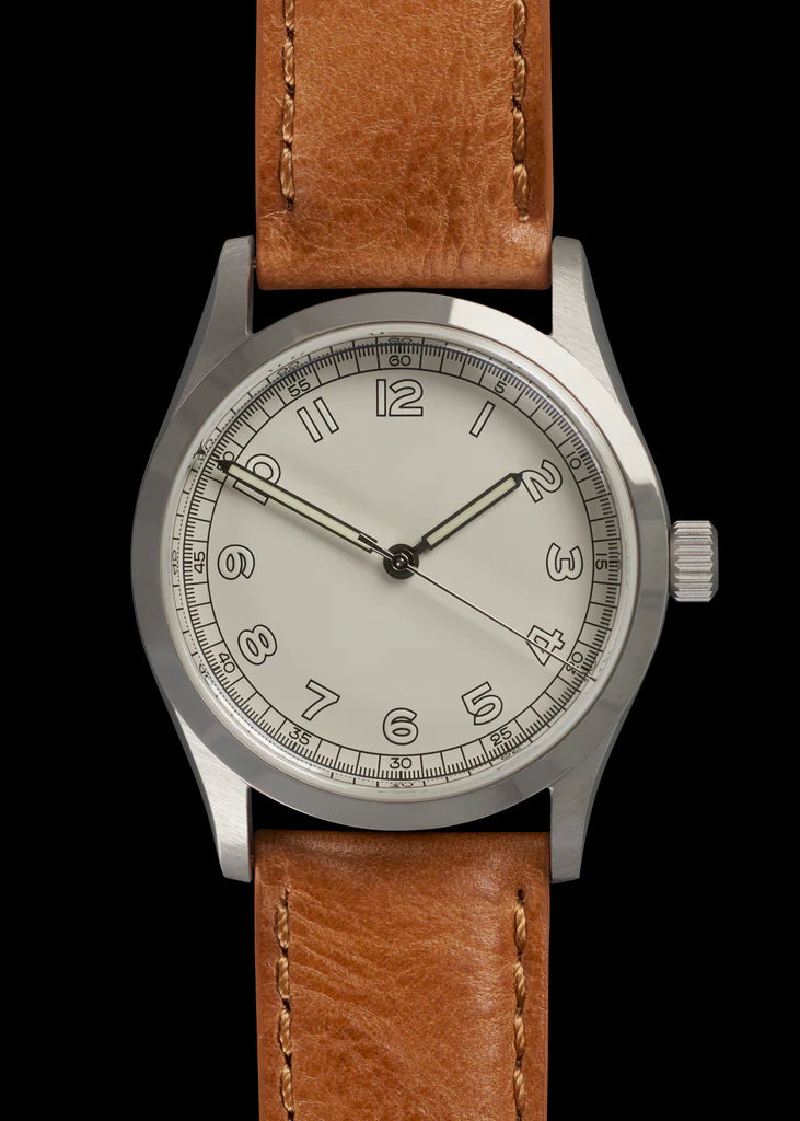 Dit horloge is gebaseerd op een Elvia-horloge uit de jaren 50, met een saffierglas dat er van buiten identiek uitziet als het originele plexiglas. Het wordt aangestuurd door een Ronda R 150 of een gelijkwaardig uurwerk, een geavanceerd automatisch uurwerk met 25 juwelen en een frequentie van 28.800 trillingen per uur (4 Hz). Deze met precisie vervaardigde krachtpatser heeft een aanzienlijke gangreserve van 38 uur, wat zorgt voor duurzame prestaties. Uitgerust met hacking- en handopwindmogelijkheden, is het een voorbeeld van zowel efficiëntie als gemak.