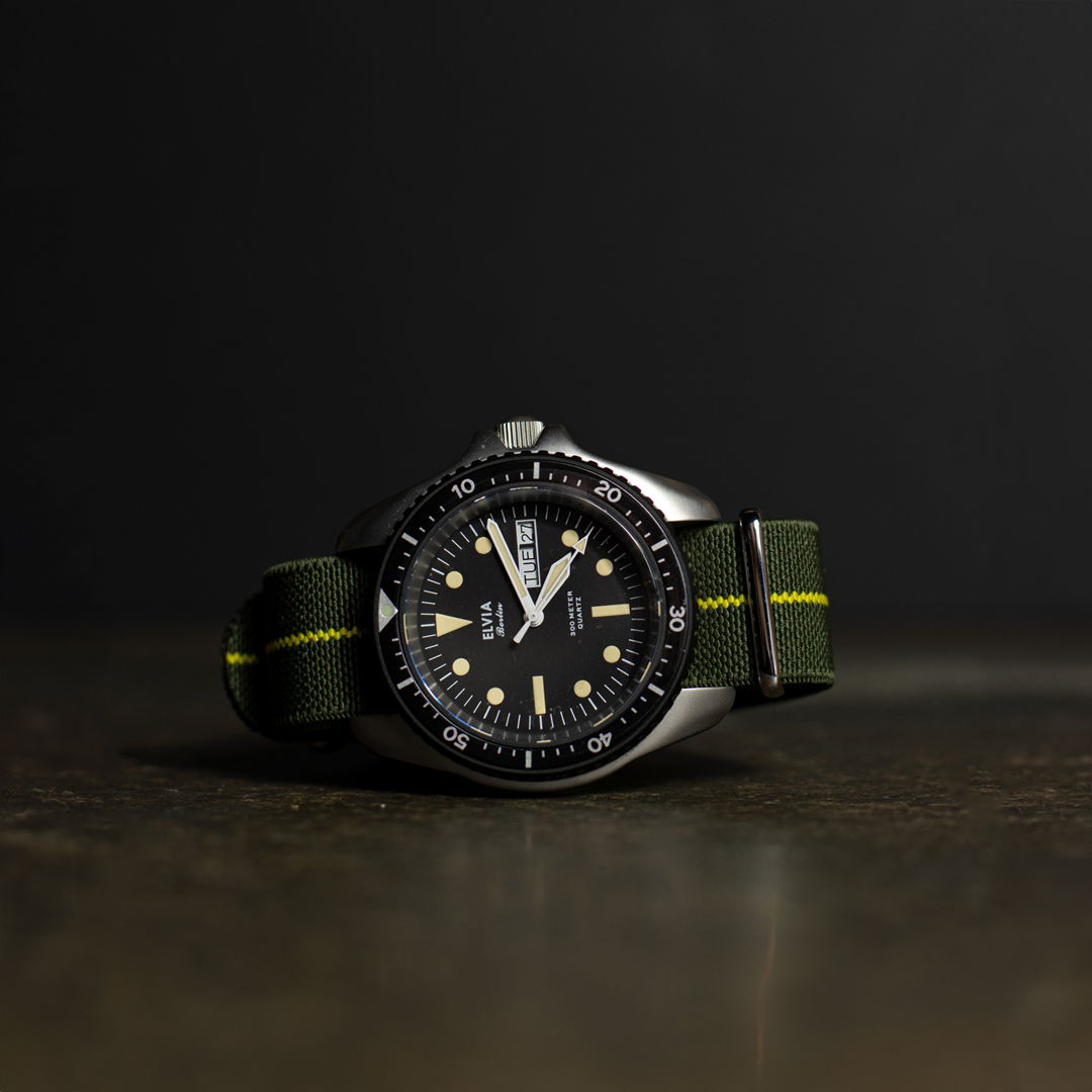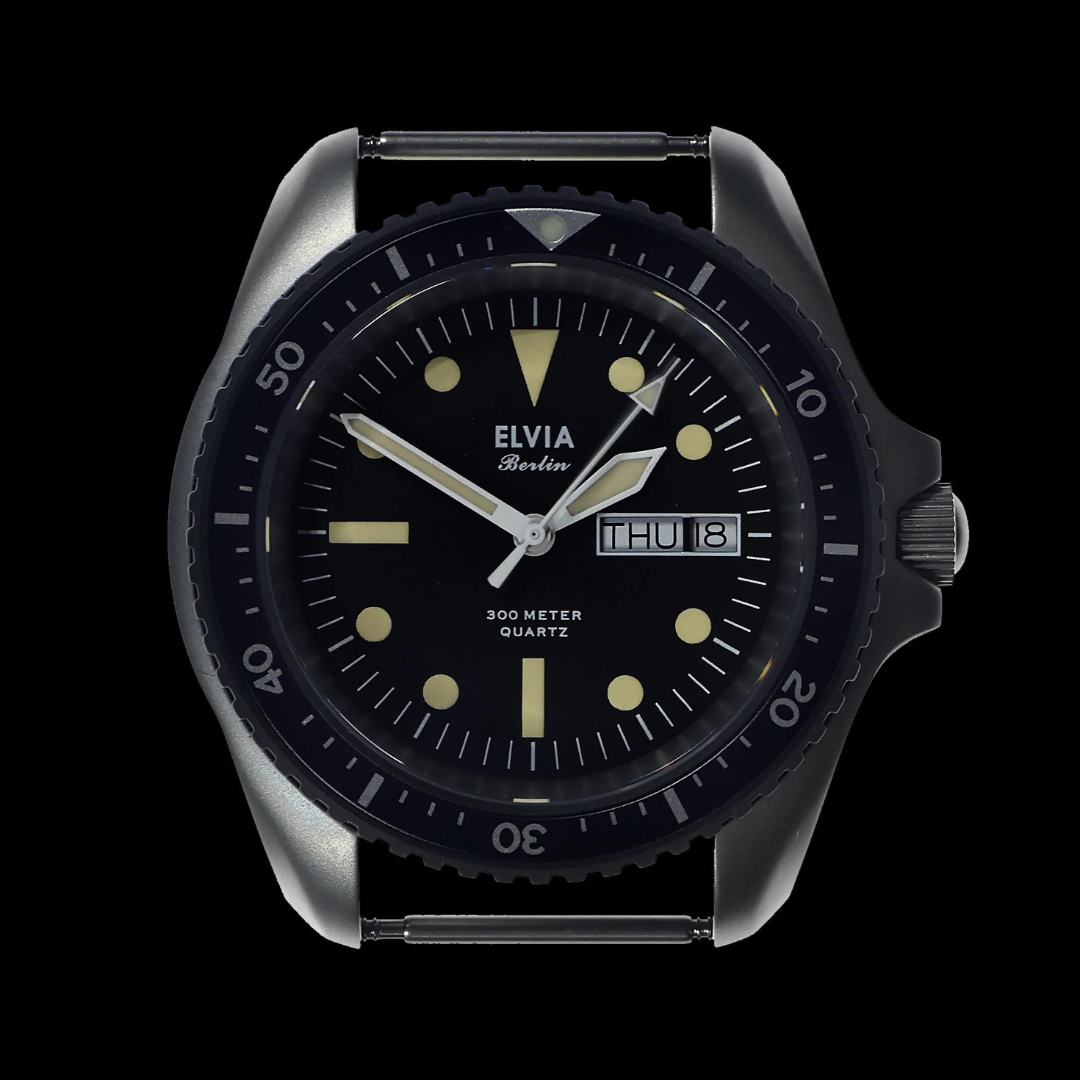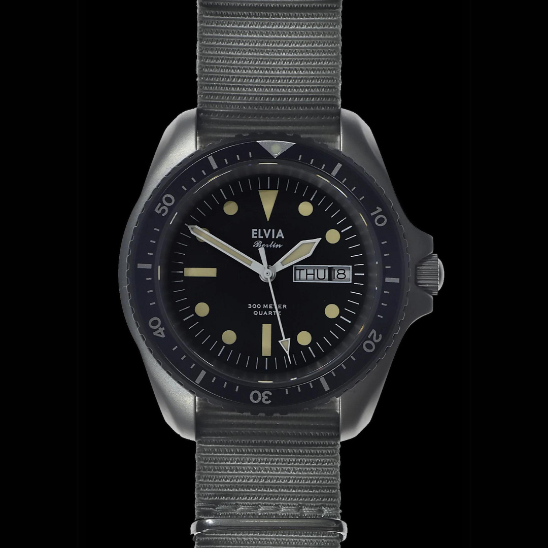 Elvia produceerde in 1970 exclusief horloges voor de MN Marine Nationale (de Franse marine), en dit horloge is volledig in de geest van dit exacte horloge gemaakt. Dit horloge wordt aangedreven door een 24 Juwelen NH35 automatisch uurwerk met een 41 uur gangreserve. Het bekende NH35 uurwerk is een mechanisch uurwerk met een automatische aandrijving dat met 21,600 vibraties per uur, de tijd zeer nauwkeurig weergeeft. Elvia was een officiële militaire leverancier voor de Franse marine tezamen met Tudor, rolex, Heuer, Triton, Beuchat en meer. Dit horloge is exact volgens de originele specificaties gemaakt uit 1970 met een waterdichtheid van 300 meter en anti-reflectieve behandeling op de horlogekast in combinatie met het anti-reflectieve saffierglas. De Day/Date functie is verder interessant te noemen waarbij het horloge de datum zowel als de dag weergeeft. Daarnaast komt het horloge in een luxe lederen horlogedoos tezamen met twee NATO banden. Specificaties: Kast diameter: 40mm (inclusief kroon 45mm) Dikte: 12mm Bandaanzet: veerpennen Wijzerplaat: zwart Kast: roestvrij staal met gezandstraalde finish voor anti-reflectieve eigenschappen Kroon: schroef en sluit kroon Waterdichtheid: 300 meter / 30ATM / 1000ft Uurwerk: Zwitsers Ronda 517 Day/Date uurwerk Batterij: 45 maanden Glas: Saffierglas met antireflectieve coating Lichtgevend materiaal: Luminova Bandje: 1x Elastische Nato band met Frans Militair patroon plus 1 extra standaard NATO band Lunette: 120 kliks lunette