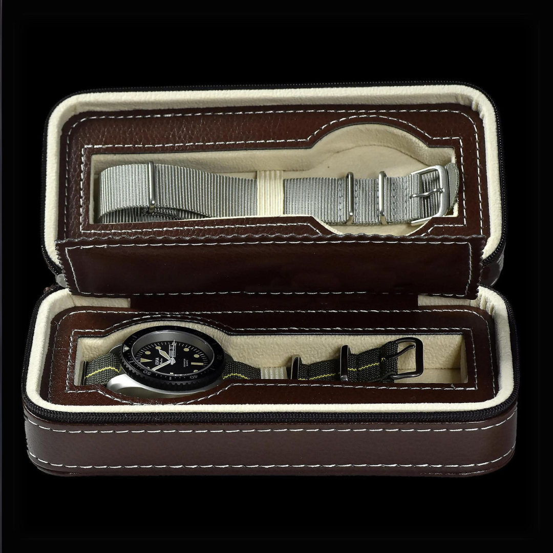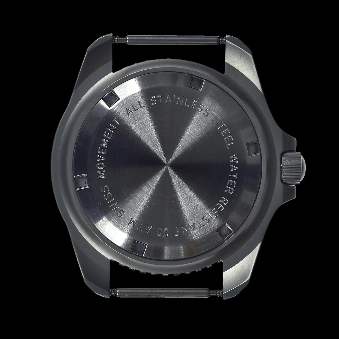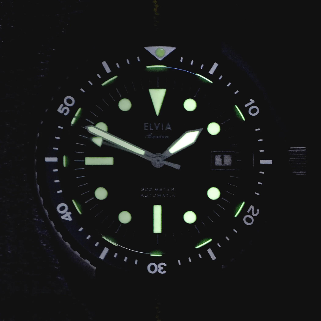 Elvia produceerde in 1970 exclusief horloges voor de MN Marine Nationale (de Franse marine), en dit horloge is volledig in de geest van dit exacte horloge gemaakt. Dit horloge wordt aangedreven door een 24 Juwelen NH35 automatisch uurwerk met een 41 uur gangreserve. Het bekende NH35 uurwerk is een mechanisch uurwerk met een automatische aandrijving dat met 21,600 vibraties per uur, de tijd zeer nauwkeurig weergeeft. Elvia was een officiële militaire leverancier voor de Franse marine tezamen met Tudor, rolex, Heuer, Triton, Beuchat en meer. Dit horloge is exact volgens de originele specificaties gemaakt uit 1970 met een waterdichtheid van 300 meter en anti-reflectieve behandeling op de horlogekast in combinatie met het anti-reflectieve saffierglas. De Day/Date functie is verder interessant te noemen waarbij het horloge de datum zowel als de dag weergeeft. Daarnaast komt het horloge in een luxe lederen horlogedoos tezamen met twee NATO banden. Specificaties: Kast diameter: 40mm (inclusief kroon 45mm) Dikte: 12mm Bandaanzet: veerpennen Wijzerplaat: zwart Kast: roestvrij staal met gezandstraalde finish voor anti-reflectieve eigenschappen Kroon: schroef en sluit kroon Waterdichtheid: 300 meter / 30ATM / 1000ft Uurwerk: Zwitsers Ronda 517 Day/Date uurwerk Batterij: 45 maanden Glas: Saffierglas met antireflectieve coating Lichtgevend materiaal: Luminova Bandje: 1x Elastische Nato band met Frans Militair patroon plus 1 extra standaard NATO band Lunette: 120 kliks lunette