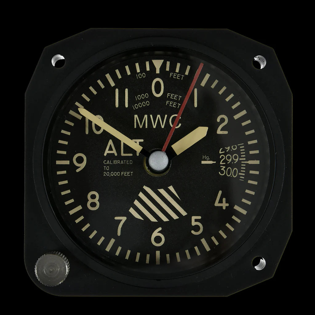 Hoewel dit eigenlijk een volledig functionerende kwartsuurwerkklok is, lijkt het sterk op een hoogtemeterinstrument dat in vliegtuigen wordt gebruikt. Op het eerste gezicht ziet het er zelfs zo authentiek uit dat het bedrijf waarvoor we ze maakten en dat een winkel op een vliegveld heeft, zei dat een van deze klokken zelfs een monteur voor de gek hield die dagelijks aan vliegtuigen werkt, totdat hij er goed naar keek. De klok heeft een replica van een (niet-functionerende) instelknop, een glazen wijzerplaat en twee wijzers. Werkt op één AA-batterij - meegeleverd. SPECIFICATIE Kast: Aluminium en polycarbonaatStil Tik/Zwiep Quartz uurwerkGlazen wijzerplaatPVD wijzerplaat82 mm breed met wijzerplaatbreedte 68 mm, diepte 88,9 mm (breedte 3,23“, wijzerplaatbreedte 2,86” diepte 3,5")