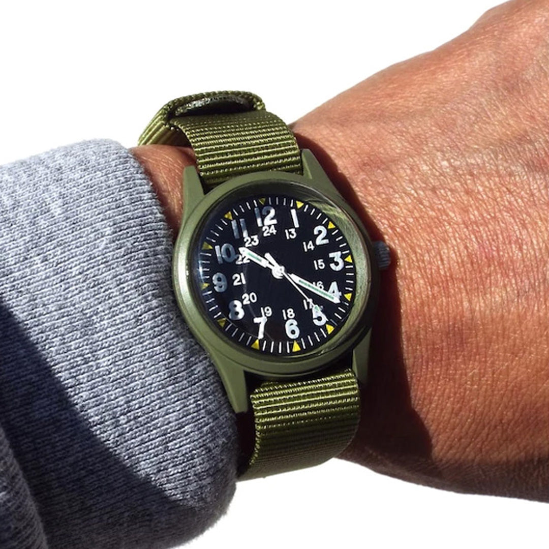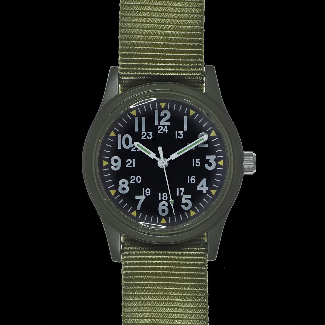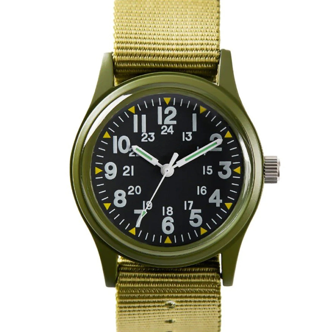 Onze Vietnam horloges zijn identiek aan de horloges gebruikt door het Amerikaanse leger in Vietnam gedurende de 1960 / 1970er jaren. De originele US militaire horloges waren van plastic gemaakt omdat ze steeds per missie werden uitgegeven. Wij hebben dit detail veranderd en het horloge in roestvrij staal gemaakt om de duurzaamheid te vergroten hoewel we het uiterlijk exact hetzelfde hielden. Op een van de afbeeldingen zie je een origineel horloge teruggevonden in Vietnam in 1972 ter vergelijk. Specificaties: Kast diameter: 36mm Dikte: 8mm Bandaanzet: veerpennen Wijzerplaat: zwart Kast: roestvrij staal 316L Achterkant kast: roestvrij staal 316L Waterdichtheid: 30 meter Uurwerk: quartz Bandje: US NATO band Levertijd 1-2 dagen Over Military Watch Company Military Watch Company is een in Zwitserland gebaseerd horlogebedrijf, opgericht in 1974 door Wolfgang Obrigheimer, die zijn hele leven militaire horloges heeft verzameld, ontworpen en geproduceerd. Sinds de oprichting richt het bedrijf zich uitsluitend op het ontwerpen en produceren van horloges met militaire specificaties. Military Watch Company produceert momenteel voor de defensies van verschillende landen horloges alsmede het re-produceren van de exacte horloges gebruikt door militairen in de jaren 1930-1980.