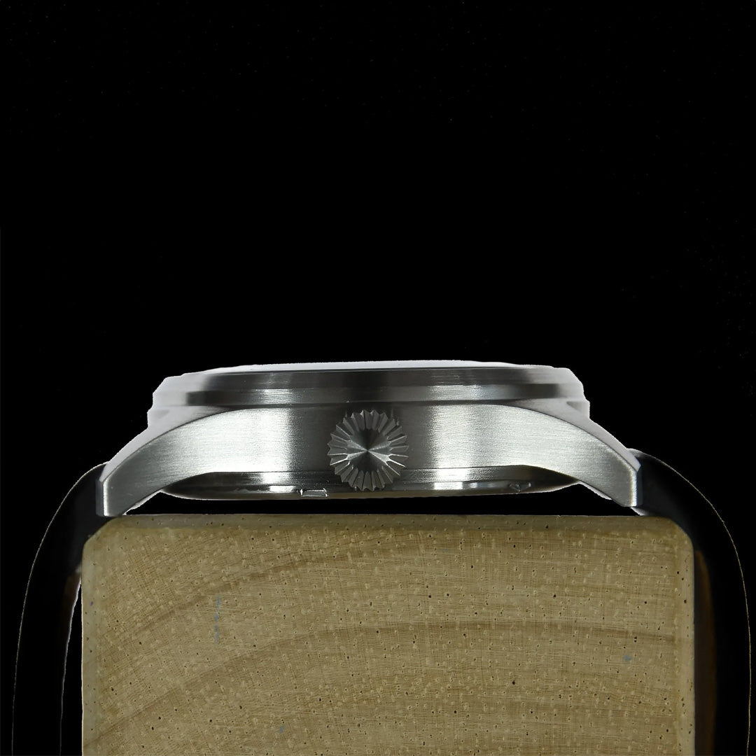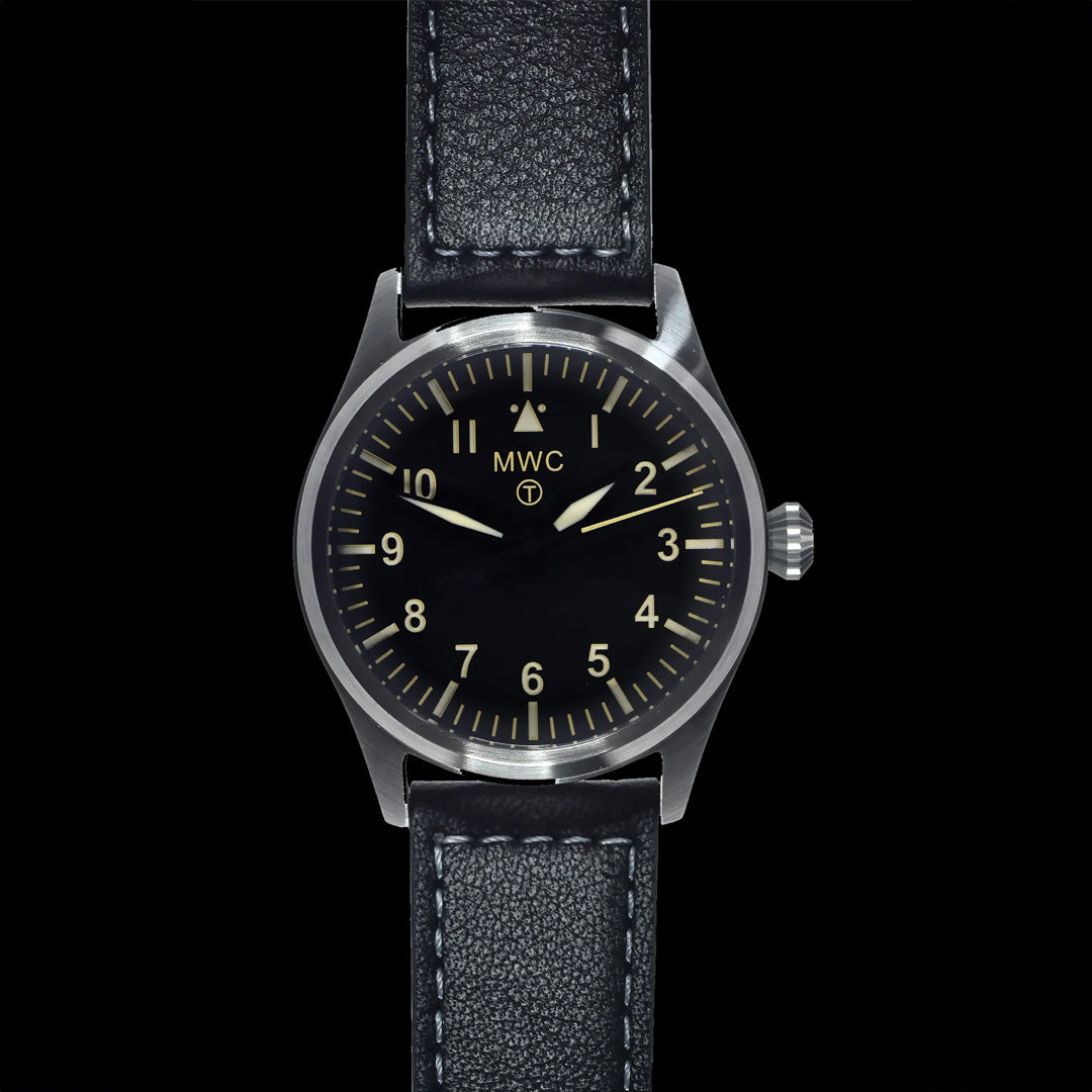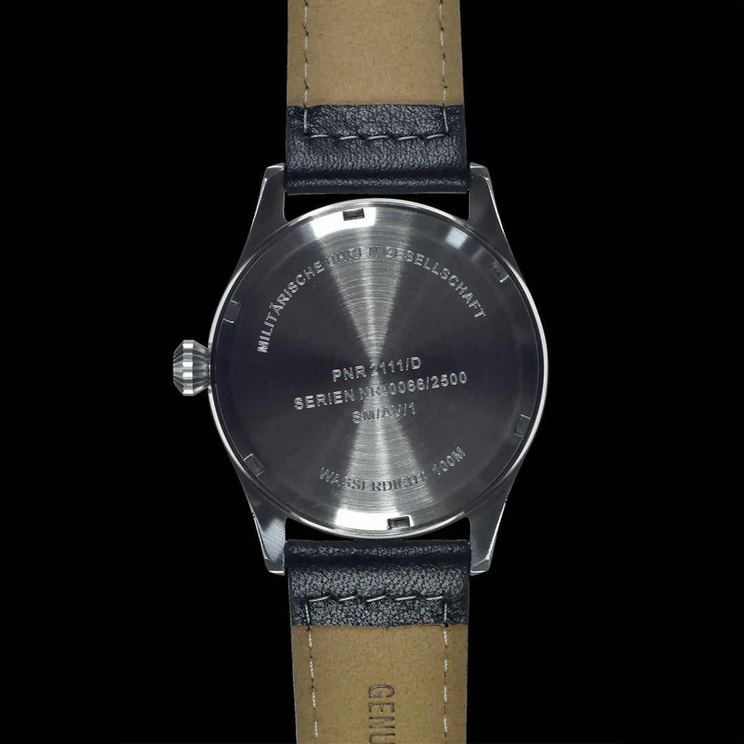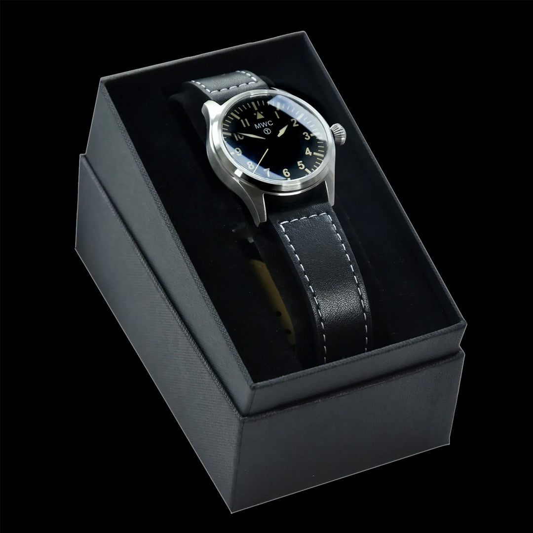 Dit klassieke piloten horloge heeft een kastgrootte van 40mm en een gecompliceerd hybride Quartz uurwerk dat de karakteristieken van een automatisch uurwerk (zoals een vloeiend lopende secondewijzer) combineert met een zeer accuraat quartz uurwerk dat op batterij loopt. Het horloge heeft ook een secondestop zodat de gebruiker deze perfect kan synchronizeren of zelfs de energie kan conserveren in periode dat het niet gebruikt wordt. De wijzerplaat is geïnspireerd op de allereerste piloten horloges waar Amerikaanse militaire piloten mee vlogen op missie in het begin van de 20e eeuw. Specificaties: Kast diameter: 40mm inclusief de kroon Dikte: 11mm Bandaanzet: veerpennen Wijzerplaat: zwart Kast: roestvrij staal 316L Achterkant kast: roestvrij staal 316L met originele militaire markeringen Waterdichtheid: 10TM (100 meter) Uurwerk: VH31 Mechanisch/Quartz Hybride Uurwerk Glas: gehard mineraal glas Lichtgevend materiaal: Luminova Bandje: 20mm lederen horlogeband Over Military Watch Company Military Watch Company is een in Zwitserland gebaseerd horlogebedrijf, opgericht in 1974 door Wolfgang Obrigheimer, die zijn hele leven militaire horloges heeft verzameld, ontworpen en geproduceerd. Sinds de oprichting richt het bedrijf zich uitsluitend op het ontwerpen en produceren van horloges met militaire specificaties. Military Watch Company produceert momenteel voor de defensies van verschillende landen horloges alsmede het re-produceren van de exacte horloges gebruikt door militairen in de jaren 1930-1980.