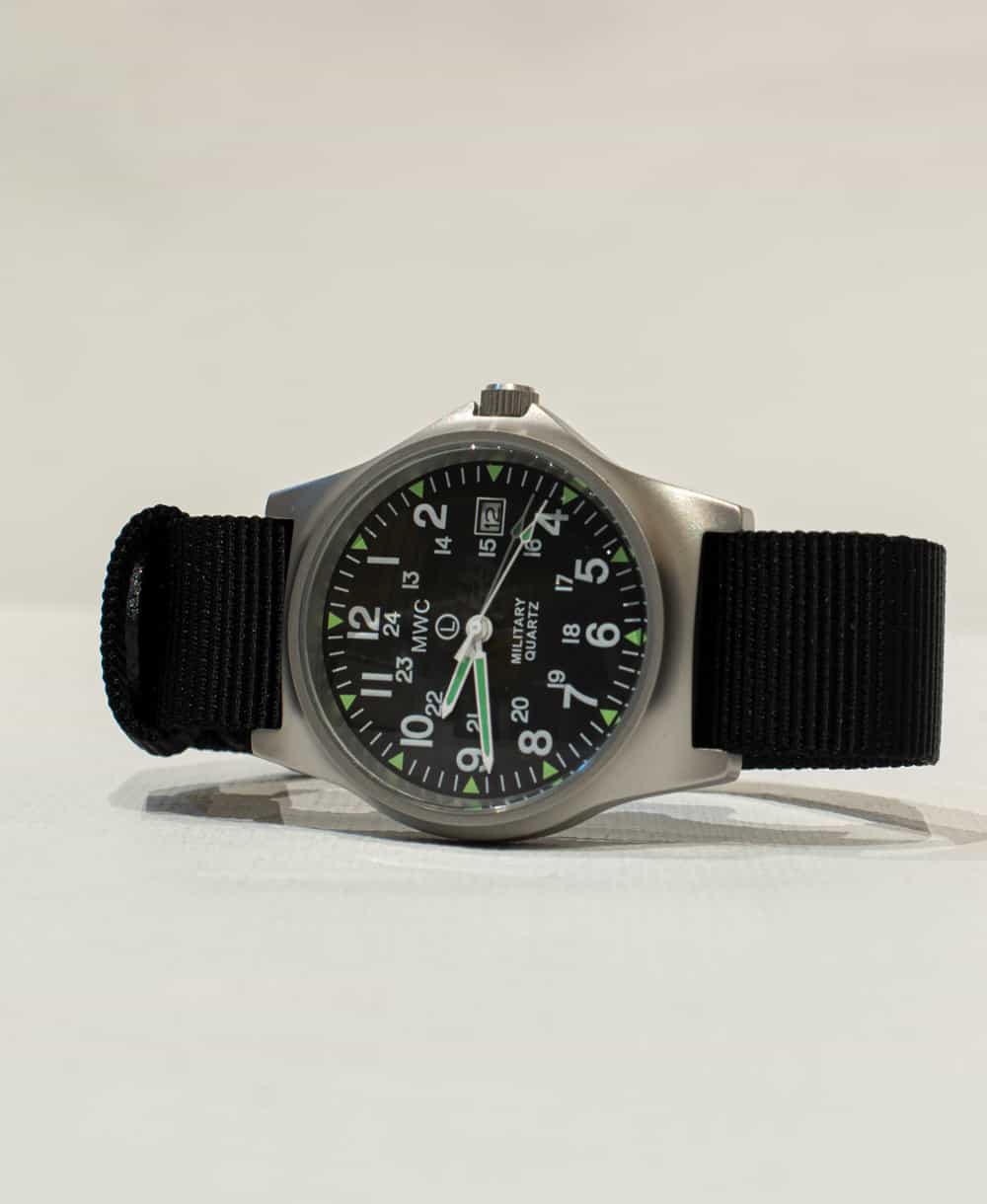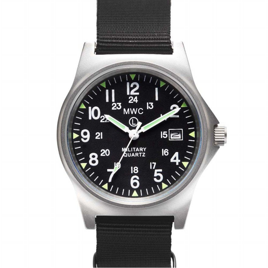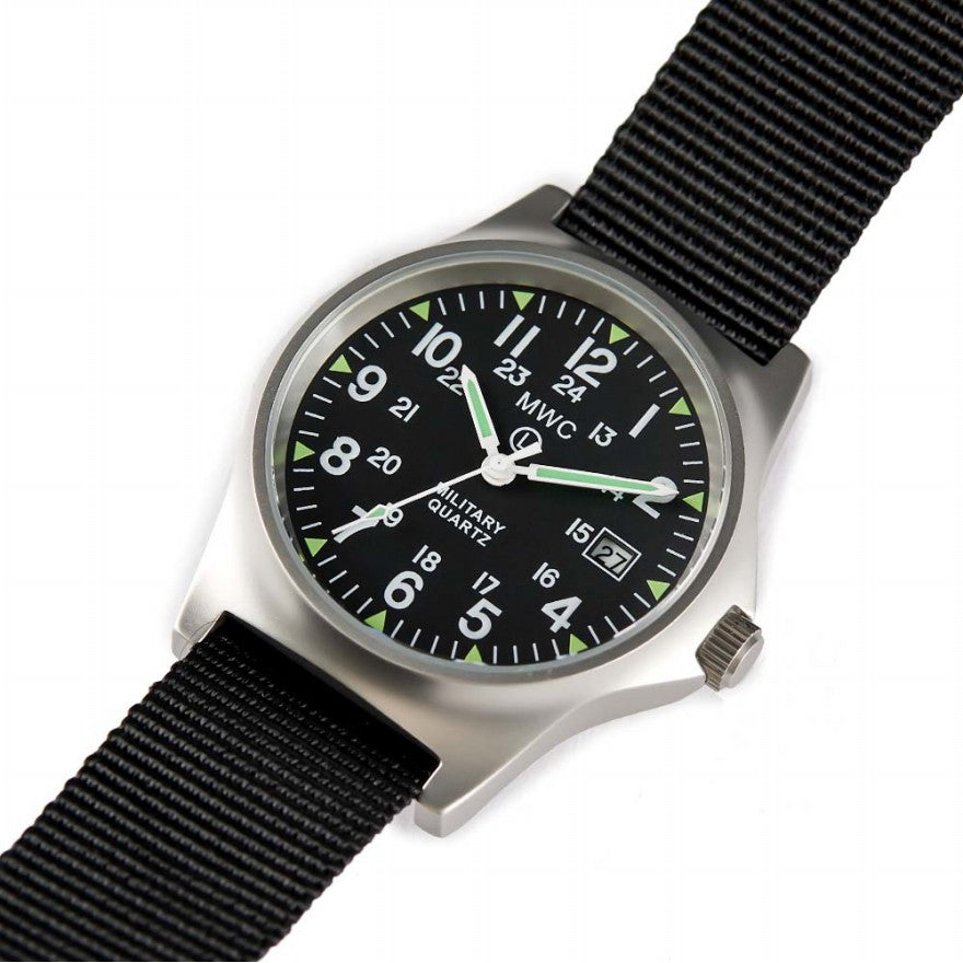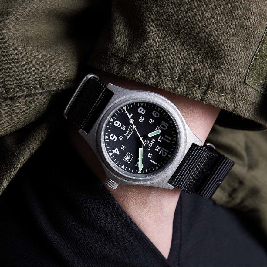 De Military Watch Company G10 modellen in roestvrij staal zijn gemaakt aan de hand van de hoogste militaire eisen voor productie wereldwijd. Dit specifieke G10 model heeft een zeer accuraat quarts uurwerk. Daarnaast maakt dit horloge gebruik van een zogeheten 12/24 wijzerplaat hetgeen het leger gespecificeerd heft om naast de normale (Amerikaanse) tijd ook de legertijd weer te geven. Daarnaast bevat dit horloge een datum functie. Specificaties: Kast diameter: 39mm Dikte: 11mm Bandaanzet: gefixeerd Wijzerplaat: zwart Kast: roestvrij staal 316L Achterkant kast: roestvrij staal 316L Waterdichtheid: 50 meter Uurwerk: Quartz Lichtgevend materiaal: Super Luminova Bandje: 18mm NATO band Batterijduur: 36 maanden Garantie: 24 maanden Komt in MWC blik Levertijd 1-2 dagen Over Military Watch Company Military Watch Company is een in Zwitserland gebaseerd horlogebedrijf, opgericht in 1974 door Wolfgang Obrigheimer, die zijn hele leven militaire horloges heeft verzameld, ontworpen en geproduceerd. Sinds de oprichting richt het bedrijf zich uitsluitend op het ontwerpen en produceren van horloges met militaire specificaties. Military Watch Company produceert momenteel voor de defensies van verschillende landen horloges alsmede het re-produceren van de exacte horloges gebruikt door militairen in de jaren 1930-1980.