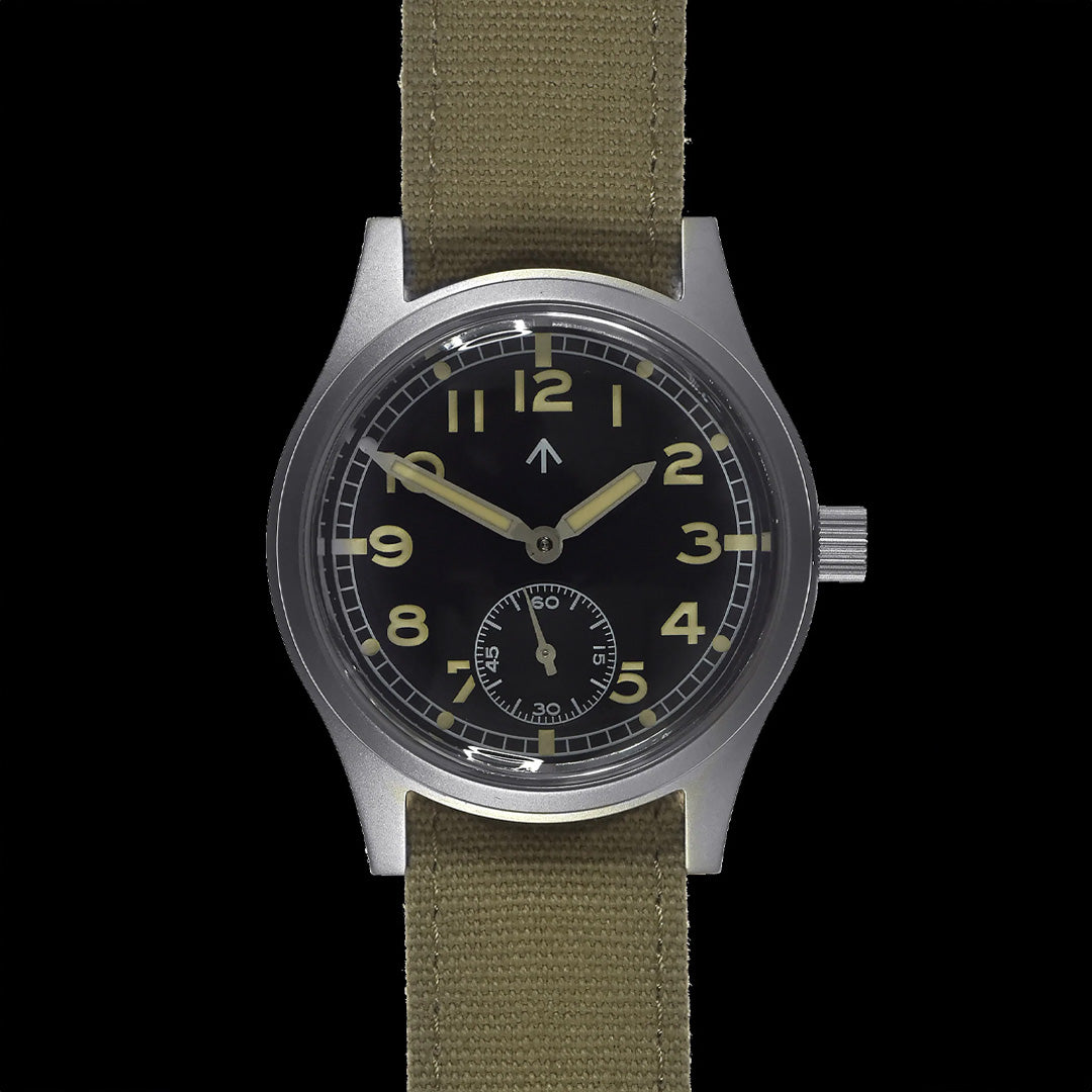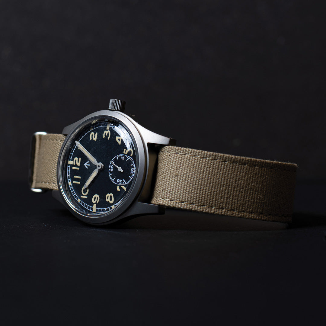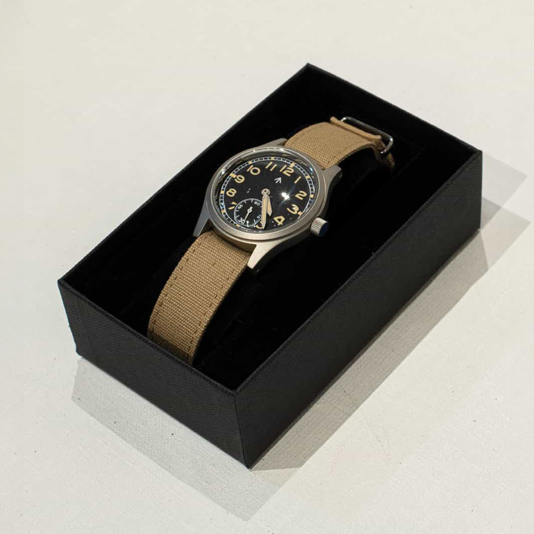 Deze automatische klassieker uit de jaren 1940 / 1950 met een kleine seconde is gebaseerd op het iconische ontwerp gebruikt door het Britse leger. Het horloge is zo dicht mogelijk naar het origineel gemaakt met het originele plexiglas. Het originele hand opwindbare uurwerk is vervangen door een automatisch uurwerk, welke ook met de hand kan worden opgewonden indien gewenst. Van de buitenkant dus onafscheidbaar van het origineel, maar van de binnenkant sterk verbeterd. Het horloge bevat een militaire roestvrij stalen kast gemaakt van 316L roestvrij staal, een kleine seconde (ook wel petit seconde genoemd), secondestop, een zwarte wijzerplaat en lichtgevende cijfers. Het horloge komt met een historisch accurate canvas horlogeband, zoals gebruikt in de jaren 1940 / 1950. Specificaties: Kast diameter: 39mm Dikte: 13,5mm Bandaanzet: gefixeerd Wijzerplaat: zwart Kast: roestvrij staal 316L Achterkant kast: roestvrij staal 316L Waterdichtheid: 5 ATM (50 meter) Uurwerk: 21 juwelen hoogwaardig automatisch uurwerk Glas: plexiglas Lichtgevend materiaal: Luminova Bandje: 18mm 1950 canvas horlogeband Kroon: schroefkroon 24 maanden garantie Komt in MWC doos Levertijd 3-5 dagen Over Military Watch Company Military Watch Company is een in Zwitserland gebaseerd horlogebedrijf, opgericht in 1974 door Wolfgang Obrigheimer, die zijn hele leven militaire horloges heeft verzameld, ontworpen en geproduceerd. Sinds de oprichting richt het bedrijf zich uitsluitend op het ontwerpen en produceren van horloges met militaire specificaties. Military Watch Company produceert momenteel voor de defensies van verschillende landen horloges alsmede het re-produceren van de exacte horloges gebruikt door militairen in de jaren 1930-1980.