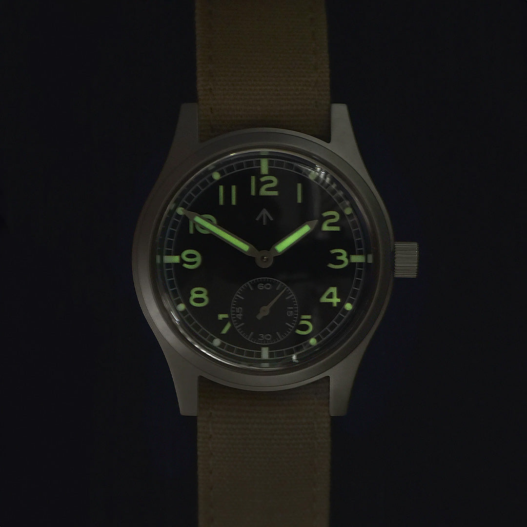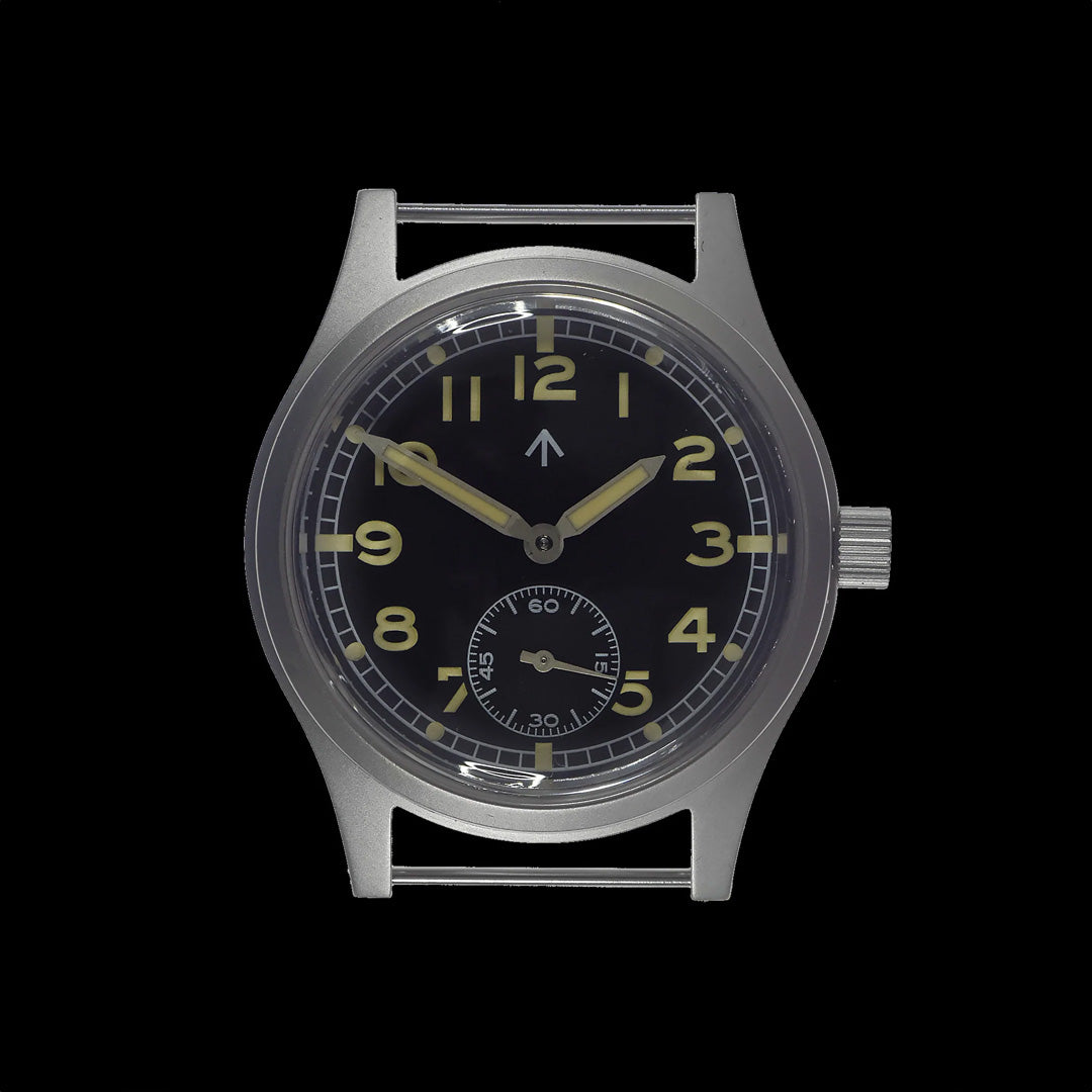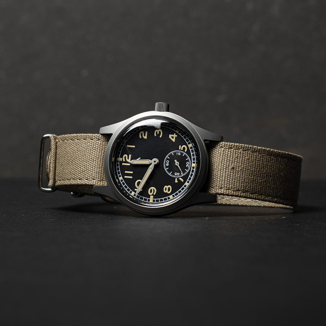 Deze automatische klassieker uit de jaren 1940 / 1950 met een kleine seconde is gebaseerd op het iconische ontwerp gebruikt door het Britse leger. Het horloge is zo dicht mogelijk naar het origineel gemaakt met het originele plexiglas. Het originele hand opwindbare uurwerk is vervangen door een automatisch uurwerk, welke ook met de hand kan worden opgewonden indien gewenst. Van de buitenkant dus onafscheidbaar van het origineel, maar van de binnenkant sterk verbeterd. Het horloge bevat een militaire roestvrij stalen kast gemaakt van 316L roestvrij staal, een kleine seconde (ook wel petit seconde genoemd), secondestop, een zwarte wijzerplaat en lichtgevende cijfers. Het horloge komt met een historisch accurate canvas horlogeband, zoals gebruikt in de jaren 1940 / 1950. Specificaties: Kast diameter: 39mm Dikte: 13,5mm Bandaanzet: gefixeerd Wijzerplaat: zwart Kast: roestvrij staal 316L Achterkant kast: roestvrij staal 316L Waterdichtheid: 5 ATM (50 meter) Uurwerk: 21 juwelen hoogwaardig automatisch uurwerk Glas: plexiglas Lichtgevend materiaal: Luminova Bandje: 18mm 1950 canvas horlogeband Kroon: schroefkroon 24 maanden garantie Komt in MWC doos Levertijd 3-5 dagen Over Military Watch Company Military Watch Company is een in Zwitserland gebaseerd horlogebedrijf, opgericht in 1974 door Wolfgang Obrigheimer, die zijn hele leven militaire horloges heeft verzameld, ontworpen en geproduceerd. Sinds de oprichting richt het bedrijf zich uitsluitend op het ontwerpen en produceren van horloges met militaire specificaties. Military Watch Company produceert momenteel voor de defensies van verschillende landen horloges alsmede het re-produceren van de exacte horloges gebruikt door militairen in de jaren 1930-1980.