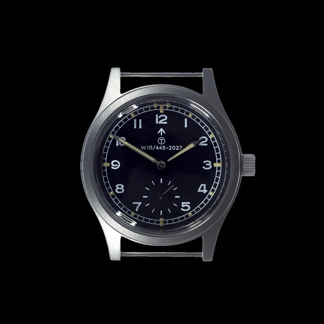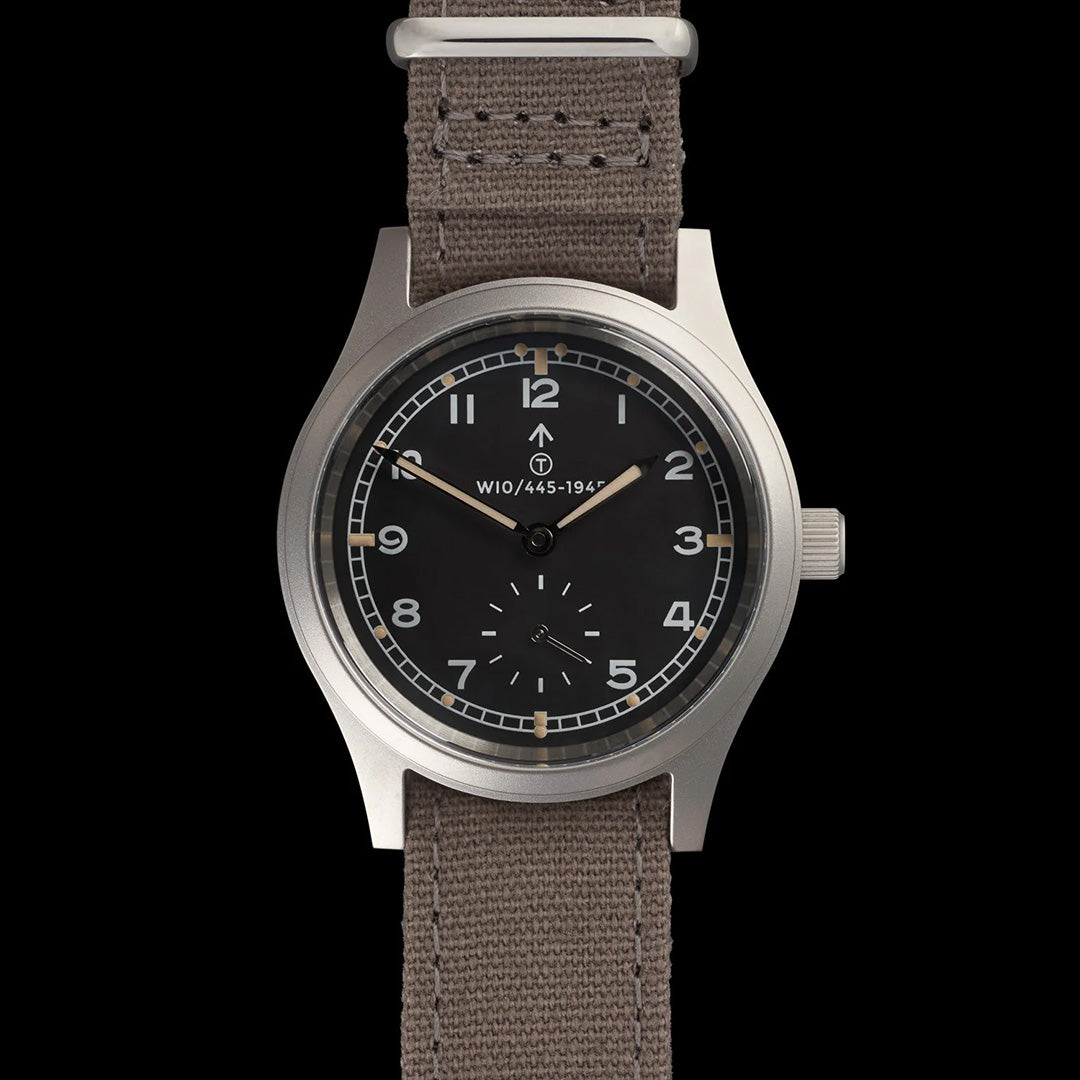 In onze optiek misschien wel dé mooiste van de onze shop: deze Dirty Dozen klassieker met originele legermarkering "w10/445-1945" . Het horloge is een identiek replica uit de jaren 1940 / 1950 en is gebaseerd op het iconische ontwerp gebruikt door het Britse leger en samen met de prachtige donkerbruine band een absolute favoriet onder ons. Het horloge is van de buitenkant zo dicht mogelijk naar het origineel gemaakt met maar van binnen flink ge-upgrade. Deze 2024 versie komt met een Zwitsers Sellita uurwerk en anti-reflectief saffierglas. Het Sellita SW216 uurwerk staat bekend om zijn compacte formaat, betrouwbaarheid en robuustheid. Het Zwitserse uurwerk heeft 24 Juwelen, een gangreserve van 42 uur, is hand opgewonden én heeft een "hack" functie (secondestop). Daarnaast komt het horloge met een hoogwaardig anti-reflectief saffier kristallen glas dat voor historische reden op een dusdanig manier geconstrueerd is dat het lijkt op saffierglas om echt de originele look na te bootsen, maar dan met super hoogwaardig glas (en dus geen plexiglas!). Van de buitenkant dus onafscheidbaar van het origineel, maar van de binnenkant sterk verbeterd. Het horloge bevat een militaire roestvrij stalen kast gemaakt van 316L roestvrij staal, een kleine seconde (ook wel petit seconde genoemd), secondestop, een zwarte wijzerplaat en lichtgevende cijfers. Het horloge komt met een geweldig mooie donkerbruine canvas horlogeband, zoals ook exact gebruikt in de jaren 1940 / 1950. Specificaties: Kast diameter: 39mm inclusief kroon Dikte: 12,5mm Bandaanzet: gefixeerd Wijzerplaat: zwart Kast: roestvrij staal 316L met satijnen finish Achterkant kast: roestvrij staal 316L Waterdichtheid: 10 ATM (100 meter) Uurwerk: Zwitsers Sellita SW216 uurwerk Glas: Hoogwaardig saffierglas met anti-reflectieve coating Lichtgevend materiaal: Luminova Bandje: donkerbruin 18mm 1940/1950 canvas horlogeband Kroon: schroefkroon 24 maanden garantie Komt in MWC doos Levertijd 1-3 dagen Over Military Watch Company Military Watch Company is een in Zwitserland gebaseerd horlogebedrijf, opgericht in 1974 door Wolfgang Obrigheimer, die zijn hele leven militaire horloges heeft verzameld, ontworpen en geproduceerd. Sinds de oprichting richt het bedrijf zich uitsluitend op het ontwerpen en produceren van horloges met militaire specificaties. Military Watch Company produceert momenteel voor de defensies van verschillende landen horloges alsmede het re-produceren van de exacte horloges gebruikt door militairen in de jaren 1930-1980.
