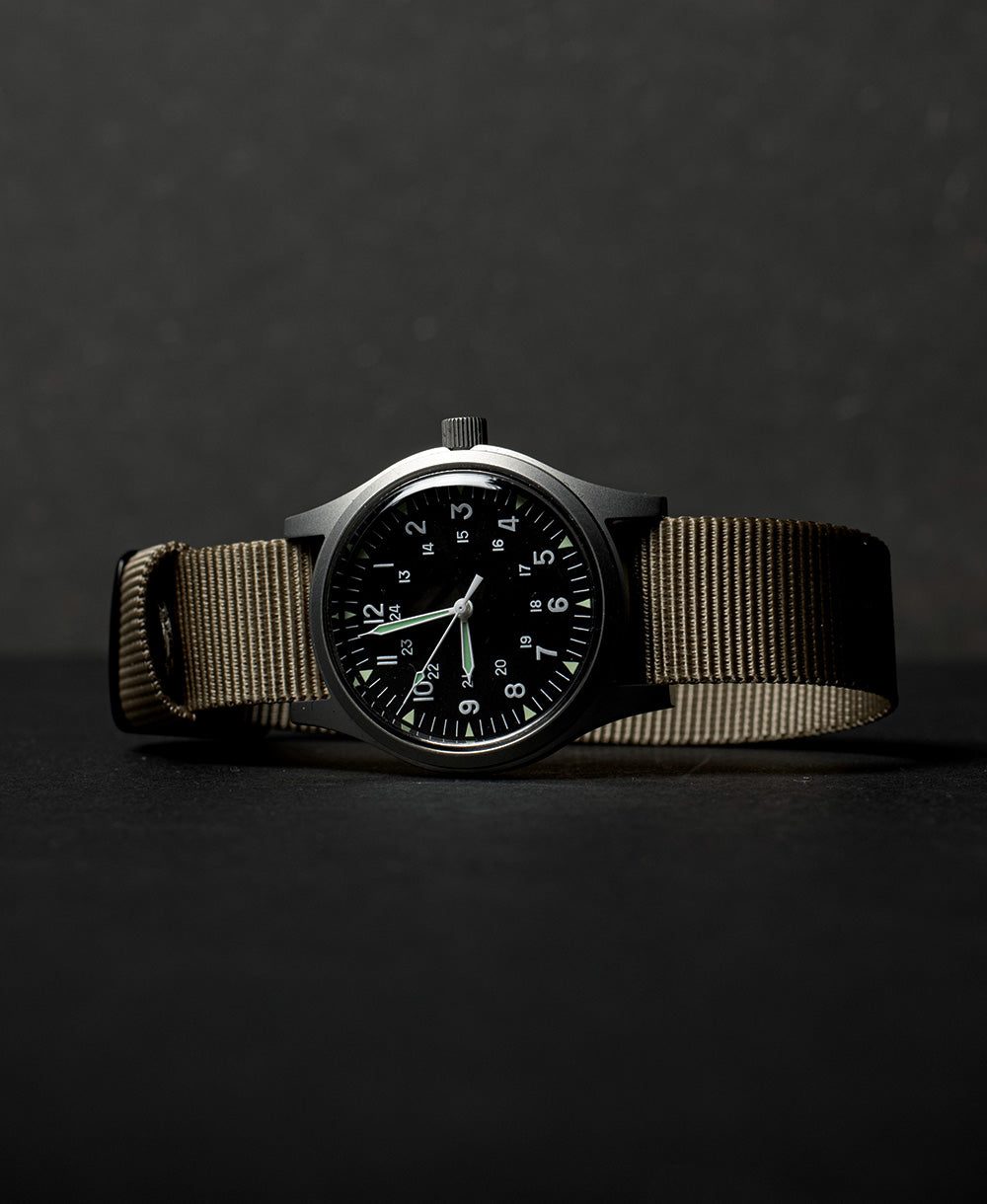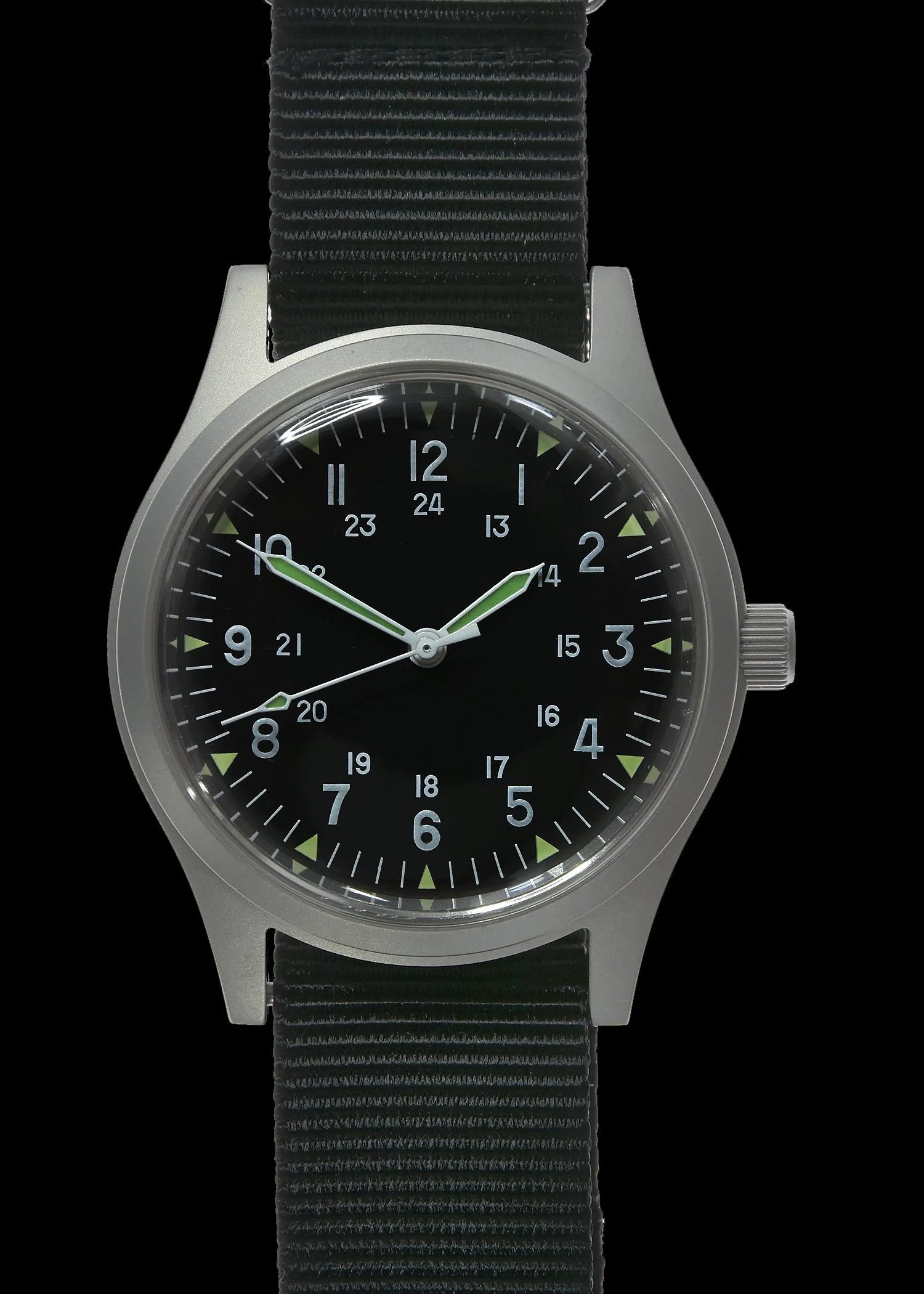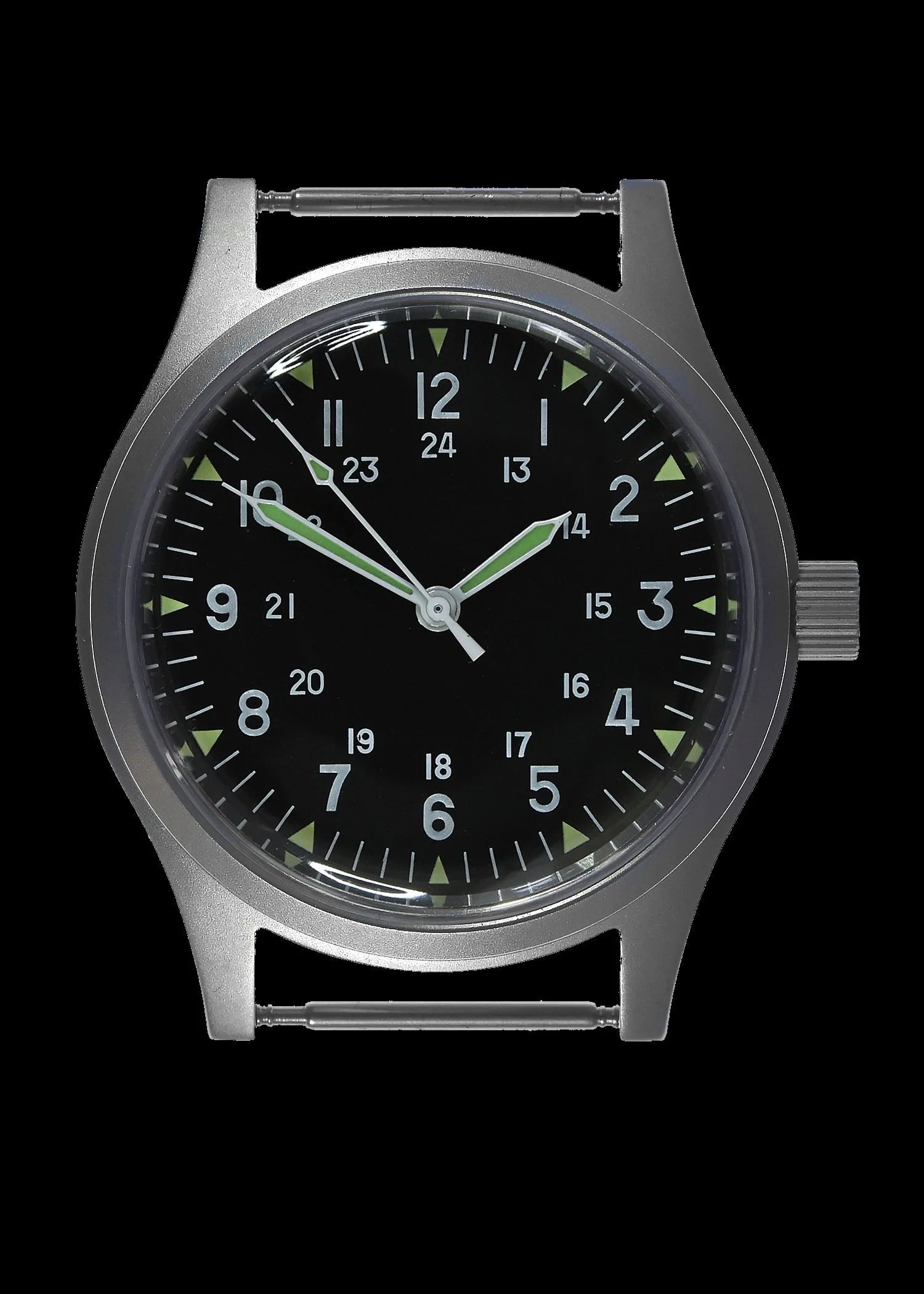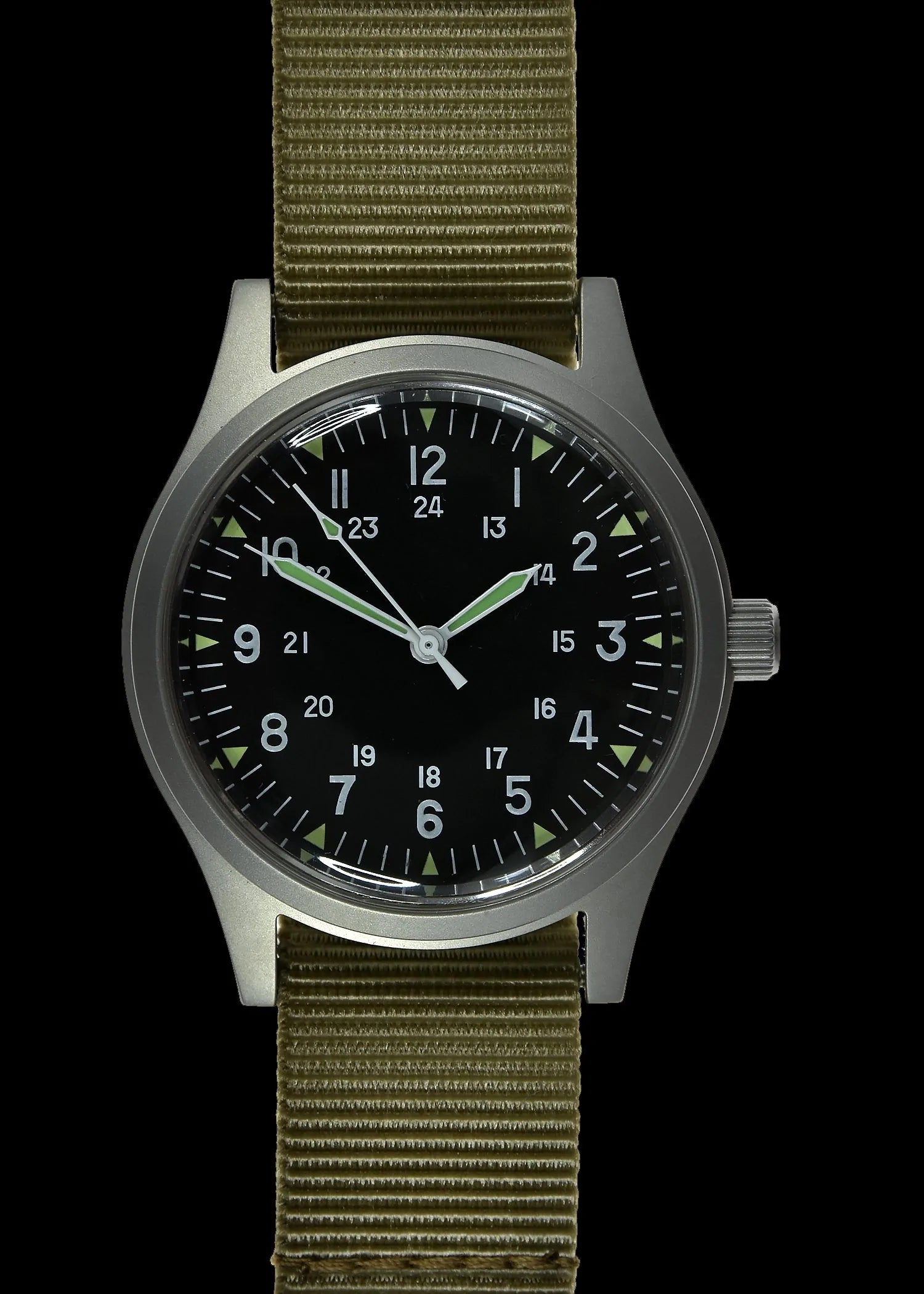 In Oktober 1962 ontwikkelde de Amerikaanse overheid een nieuwe horloge standaard genaamd GG-W-113. In de laatste foto is een schets te zien van het originele document geschreven door het Amerikaanse leger. De Military Watch Company heeft het origineel exact nagemaakt volgens de specificaties uit 1962, maar heeft tegelijkertijd het uurwerk een flinke upgrade gegeven; het is een sterk verbeterd horloge van binnen met exact hetzelfde uiterlijk. Het uurwerk is een 24-juwelen automatisch uurwerk met secondestop functie en vloeiende sceondewijzer voor een premium uitstraling. In tegenstelling tot het origineel is dit een automatisch uurwerk (welke óók manueel opgewonden kan worden) en moesten de soldaten uit 1962 het enkel met een manueel opwindbaar uurwerk doen. Een mooie specificatie van dit horloge is het gebruik van het plexiglas, dit maakt de look exact identiek aan het origineel en is zeker iets wat horlogekenners zullen herkennen. Over Military Watch Company Military Watch Company is een in Zwitserland gebaseerd horlogebedrijf, opgericht in 1974 door Wolfgang Obrigheimer, die zijn hele leven militaire horloges heeft verzameld, ontworpen en geproduceerd. Sinds de oprichting richt het bedrijf zich uitsluitend op het ontwerpen en produceren van horloges met militaire specificaties. Military Watch Company produceert momenteel voor de defensies van verschillende landen horloges alsmede het re-produceren van de exacte horloges gebruikt door militairen in de jaren 1930-1980. Specificaties: Kast diameter: 38mm (inclusief kroon) Dikte: 12,9mm Bandaanzet: Veerpennen Wijzerplaat: zwart Kast: roestvrij staal 316L Achterkant kast: roestvrij staal 316L met schroef Waterdichtheid: 30 meter Uurwerk: 24 Juwelen Automatisch uurwerk Lichtgevend materiaal: Luminova Bandje: 2 x 18mm NATO band Garantie: 24 maanden Glas: Plexiglas Levertijd 1-2 dagen