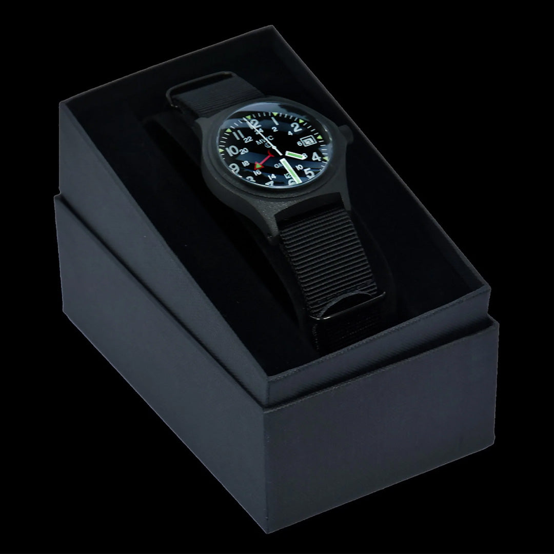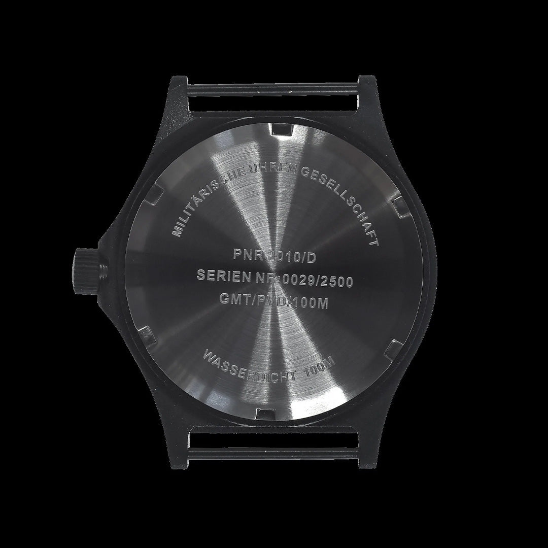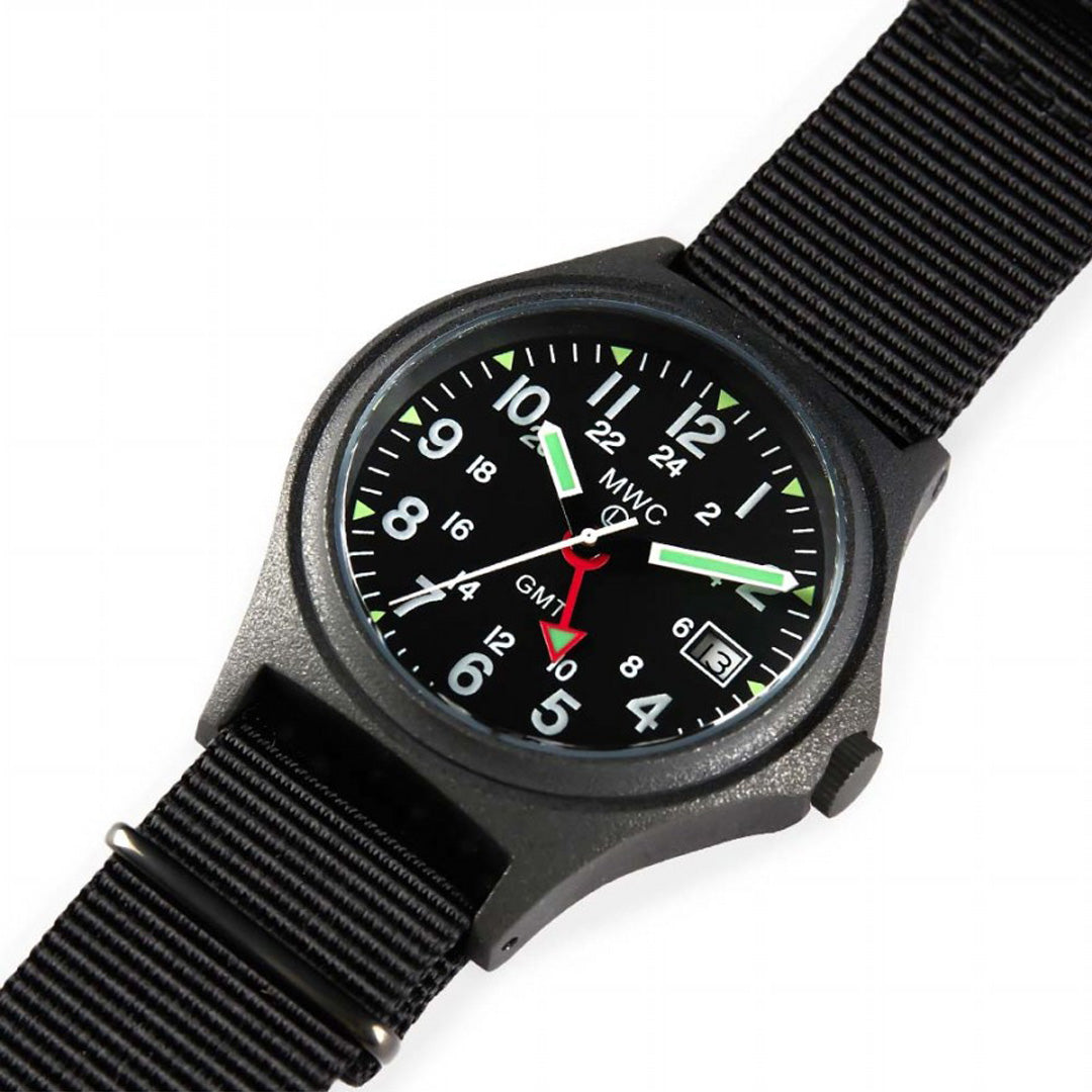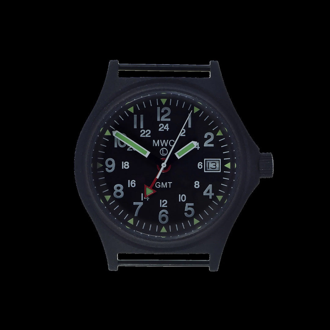 Dit GMT militaire horloge in roestvrij staal bevat een hoge kwaliteit RONDA 515.24 uurwerk in een 100 meter waterdichte kast met een datum functie. Het GMT principe is een zeer slim principe omdat het idee erachter zo simpel is; door een dubbele tijdsaanduiding kan de gebruiker de tijd in twee verschillende tijdzones tegelijkertijd zien. De PVD afwerking van de kast wordt vaak gespecificeerd in militaire contracten, en dit betreft een speciaal behandeld roestvrije stalen materiaal dat anti-reflectief is. De kleur van het staal wordt hierin gewijzigd op moleculair niveau waardoor de kleur niet zal veranderen gedurende de levensduur. Military Watch Company produceerde deze horloges in eerste instantie enkel voor militaire piloten maar heeft besoten deze nu ook voor het algemene publiek aan te bieden. Het GMT horloges is erg robuust gemaakt om de meest extreme condities te overleven. De achterkant van de kast bevat verscheidene contractuele markeringen, uniek aan ieder horloge. Specificaties: Kast diameter: 40mm Dikte: 13mm Bandaanzet: gefixeerd Wijzerplaat: zwart Kast: roestvrij staal 316L met militaire anti-reflectieve PVD coating in Matzwart Achterkant kast: roestvrij staal 316L Waterdichtheid: 10 ATM (100 meter) Uurwerk: RONDA 515.24 met datum functie Glas: gehard mineraal glas Lichtgevend materiaal: Super Luminova Bandje: 2x 20mm NATO band, zwart en grijs Levertijd 1-2 dagen Over Military Watch Company Military Watch Company is een in Zwitserland gebaseerd horlogebedrijf, opgericht in 1974 door Wolfgang Obrigheimer, die zijn hele leven militaire horloges heeft verzameld, ontworpen en geproduceerd. Sinds de oprichting richt het bedrijf zich uitsluitend op het ontwerpen en produceren van horloges met militaire specificaties. Military Watch Company produceert momenteel voor de defensies van verschillende landen horloges alsmede het re-produceren van de exacte horloges gebruikt door militairen in de jaren 1930-1980.
