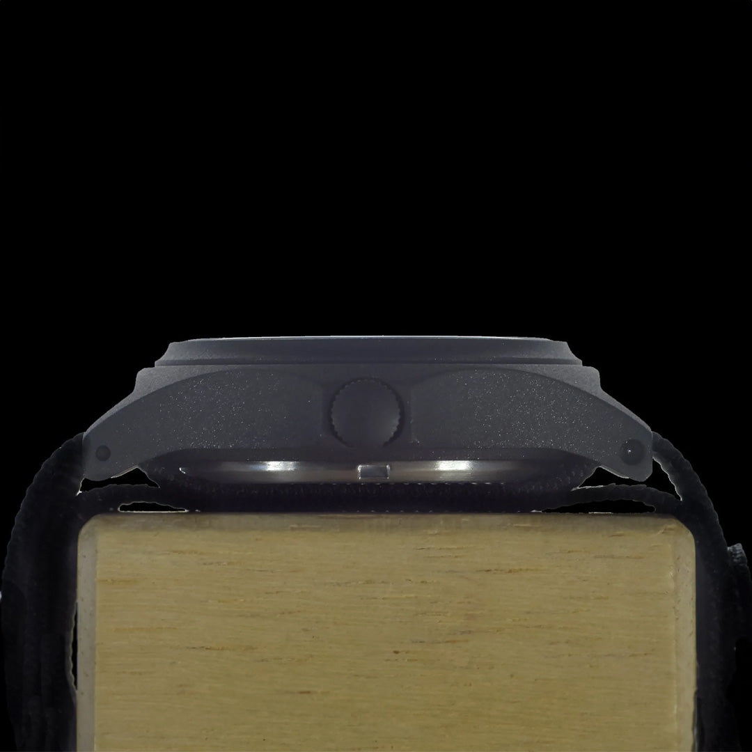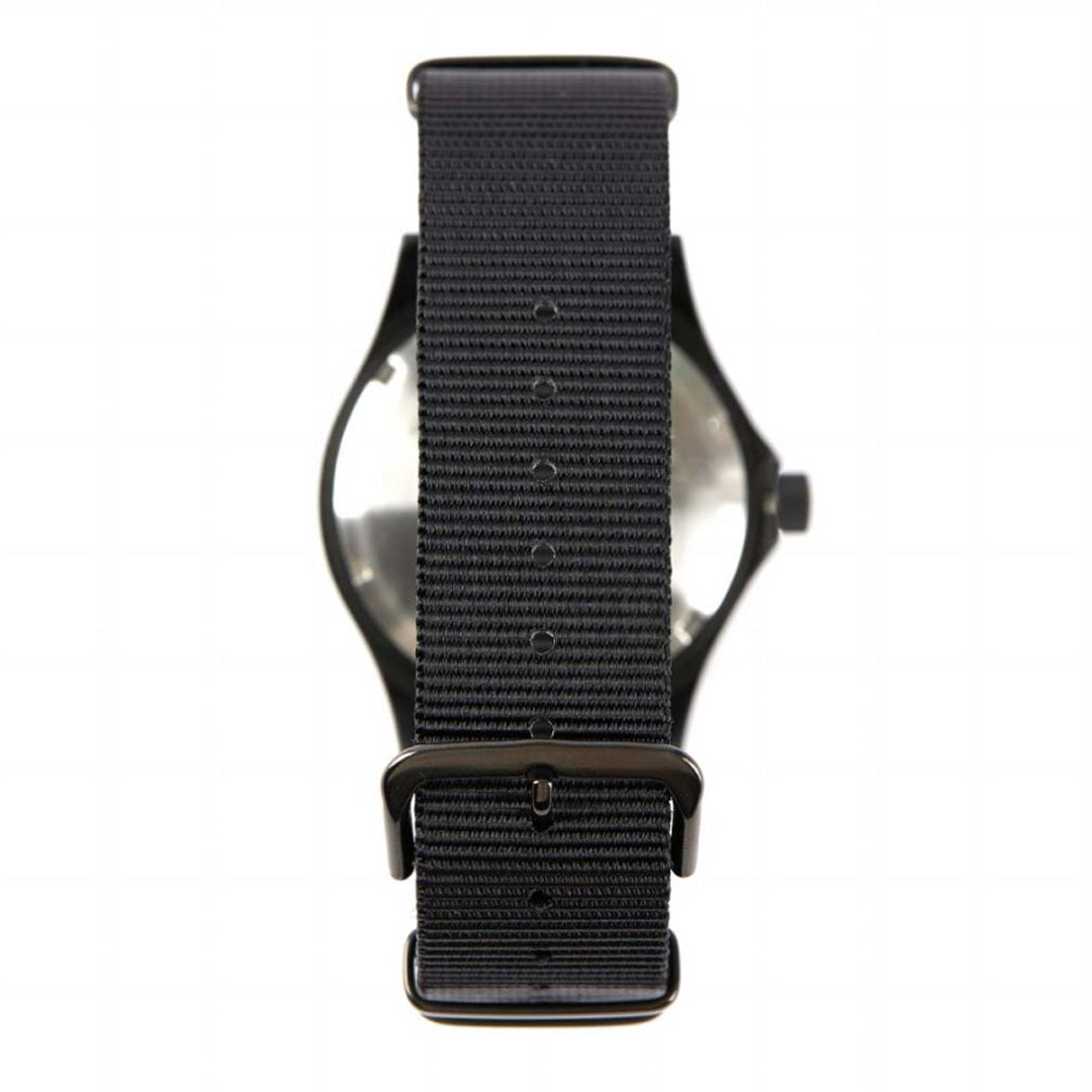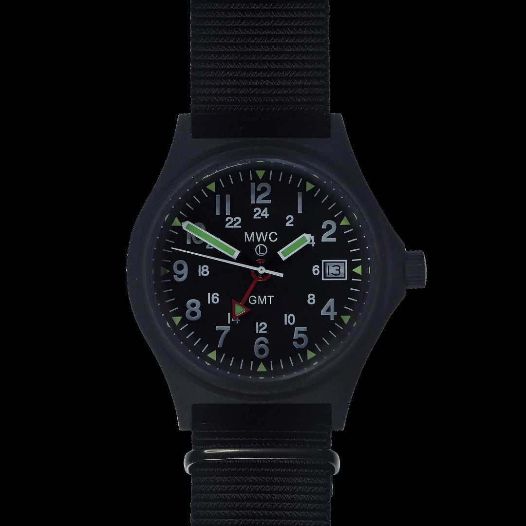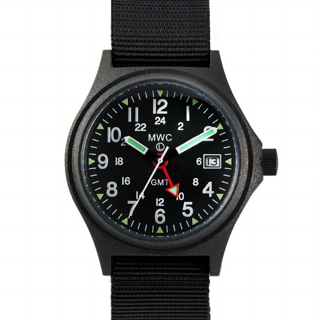 Dit GMT militaire horloge in roestvrij staal bevat een hoge kwaliteit RONDA 515.24 uurwerk in een 100 meter waterdichte kast met een datum functie. Het GMT principe is een zeer slim principe omdat het idee erachter zo simpel is; door een dubbele tijdsaanduiding kan de gebruiker de tijd in twee verschillende tijdzones tegelijkertijd zien. De PVD afwerking van de kast wordt vaak gespecificeerd in militaire contracten, en dit betreft een speciaal behandeld roestvrije stalen materiaal dat anti-reflectief is. De kleur van het staal wordt hierin gewijzigd op moleculair niveau waardoor de kleur niet zal veranderen gedurende de levensduur. Military Watch Company produceerde deze horloges in eerste instantie enkel voor militaire piloten maar heeft besoten deze nu ook voor het algemene publiek aan te bieden. Het GMT horloges is erg robuust gemaakt om de meest extreme condities te overleven. De achterkant van de kast bevat verscheidene contractuele markeringen, uniek aan ieder horloge. Specificaties: Kast diameter: 40mm Dikte: 13mm Bandaanzet: gefixeerd Wijzerplaat: zwart Kast: roestvrij staal 316L met militaire anti-reflectieve PVD coating in Matzwart Achterkant kast: roestvrij staal 316L Waterdichtheid: 10 ATM (100 meter) Uurwerk: RONDA 515.24 met datum functie Glas: gehard mineraal glas Lichtgevend materiaal: Super Luminova Bandje: 2x 20mm NATO band, zwart en grijs Levertijd 1-2 dagen Over Military Watch Company Military Watch Company is een in Zwitserland gebaseerd horlogebedrijf, opgericht in 1974 door Wolfgang Obrigheimer, die zijn hele leven militaire horloges heeft verzameld, ontworpen en geproduceerd. Sinds de oprichting richt het bedrijf zich uitsluitend op het ontwerpen en produceren van horloges met militaire specificaties. Military Watch Company produceert momenteel voor de defensies van verschillende landen horloges alsmede het re-produceren van de exacte horloges gebruikt door militairen in de jaren 1930-1980.