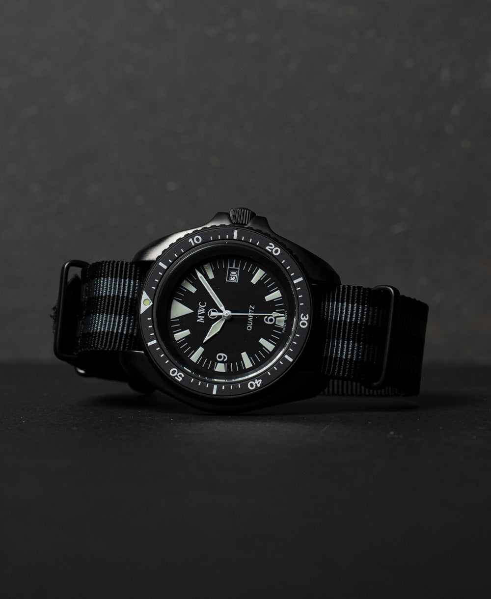 Dit model is ontworpen in 1990, en bevat een Zwitsers “Ronda” 705/715 uurwerk met een waterdichtheid tot 300 meter en 24 maanden garantie. De PVD afwerking van de kast wordt vaak gespecificeerd in militaire contracten, en dit betreft een speciaal behandeld roestvrije stalen materiaal dat anti-reflectief is. De kleur van het staal wordt hierin gewijzigd op moleculair niveau waardoor de kleur niet zal veranderen gedurende de levensduur. Het ontwerp is gelijkwaardig aan een militaire productie tientallen jaren geleden gespecificeerd door het Britse leger (zoals te zien in de laatste foto). Het horloge is 45mm inclusief de kroon en wordt geleverd met een 20mm NATO horlogeband. Specificaties: Kast diameter: 40mm Dikte: 12mm Bandaanzet: veerpennen Wijzerplaat: zwart Kast: roestvrij staal 316L Achterkant kast: roestvrij staal 316L met militaire anti-reflectieve PVD coating Waterdichtheid: 300 meter Uurwerk: Swiss Ronda 705/715 met 60 maanden batterij duur Lichtgevend materiaal: Luminova Bandje: 2 x 20mm NATO band, zwart en "James bond" Kroon: schroefkroon Garantie: 24 maanden Levertijd 1-2 dagen Over Military Watch Company Military Watch Company is een in Zwitserland gebaseerd horlogebedrijf, opgericht in 1974 door Wolfgang Obrigheimer, die zijn hele leven militaire horloges heeft verzameld, ontworpen en geproduceerd. Sinds de oprichting richt het bedrijf zich uitsluitend op het ontwerpen en produceren van horloges met militaire specificaties. Military Watch Company produceert momenteel voor de defensies van verschillende landen horloges alsmede het re-produceren van de exacte horloges gebruikt door militairen in de jaren 1930-1980.