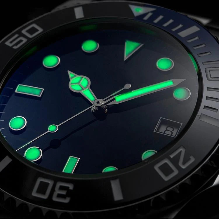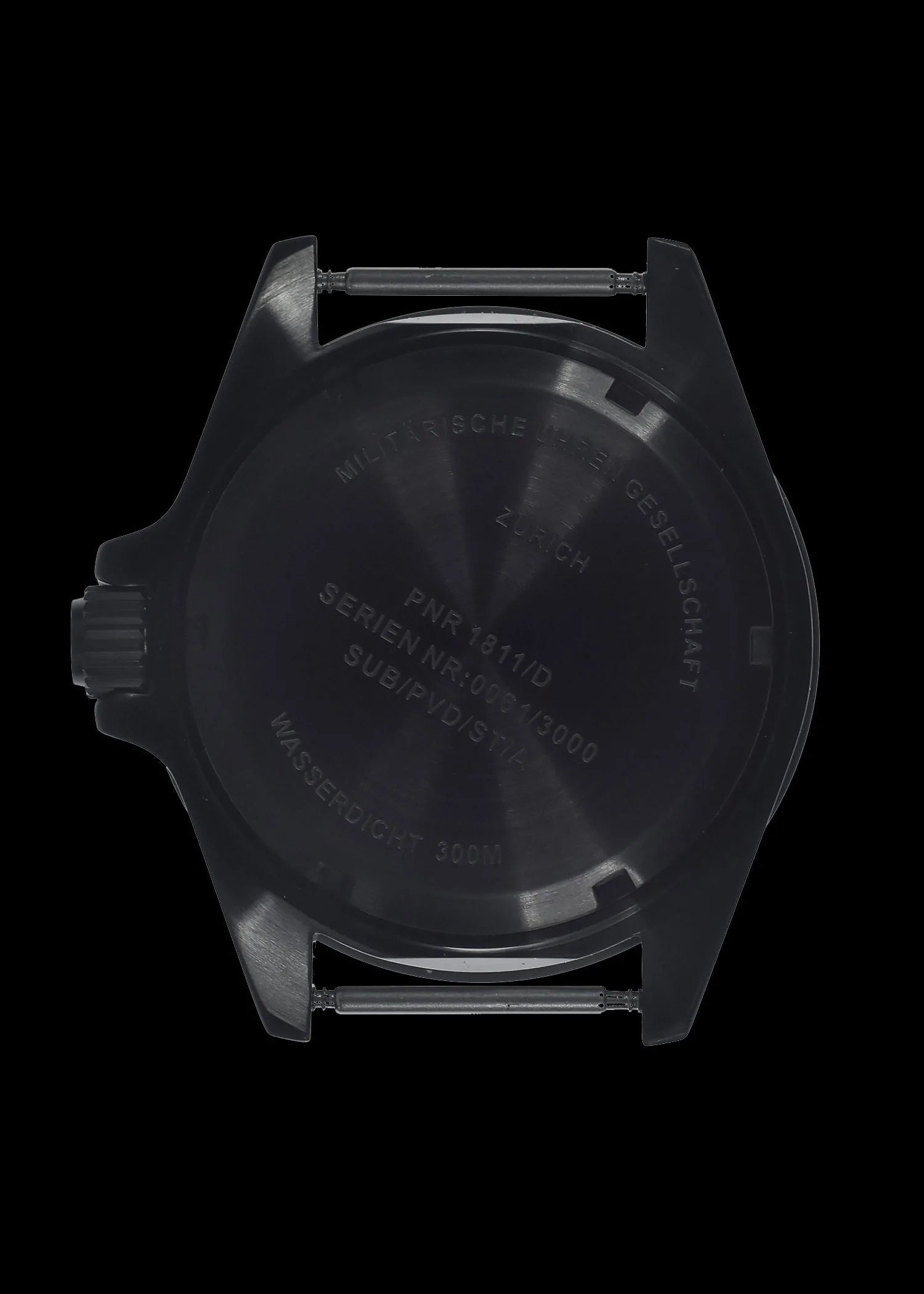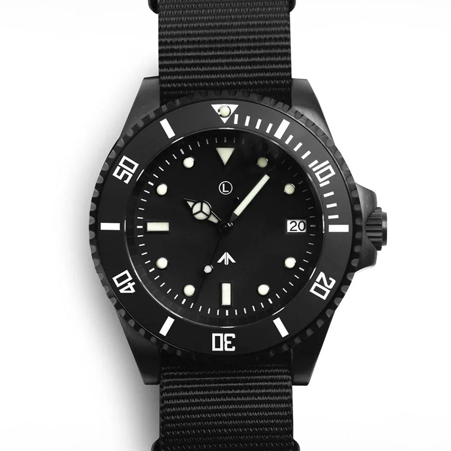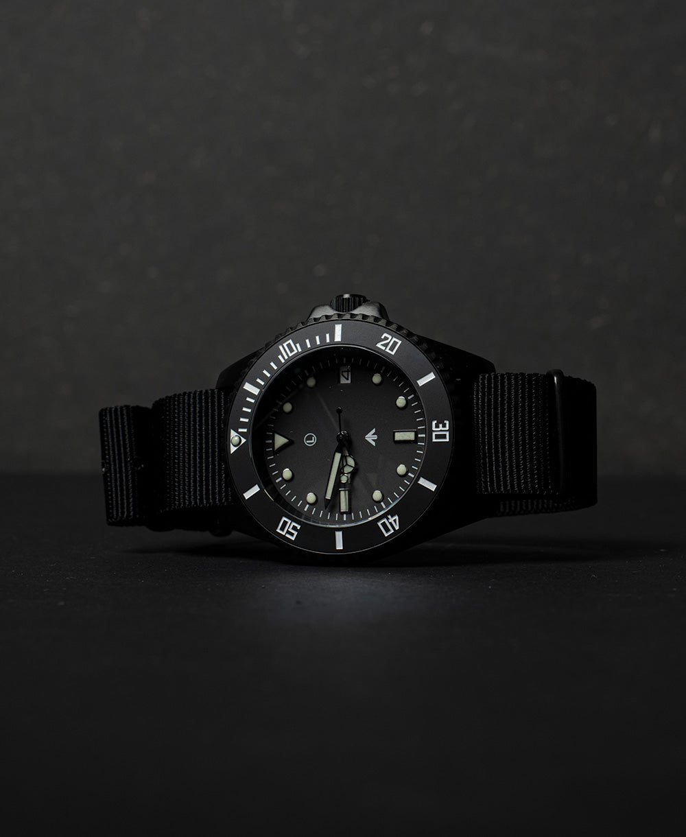 Dit horloge is een van onze militair gespecificeerde duik horloges in een matzwarte PVD coating met keramische lunette en saffierglas met een automatisch uurwerk met een gangreserve tot 41 uur. Het is een exceptionele hoeveelheid kwaliteit voor deze prijs. De PVD afwerking van de kast wordt vaak gespecificeerd in militaire contracten, en dit betreft een speciaal behandeld roestvrije stalen materiaal dat anti-reflectief is. De kleur van het staal wordt hierin gewijzigd op moleculair niveau waardoor de kleur niet zal veranderen gedurende de levensduur. Specificaties: Kast diameter: 40mm exclusief kroon Dikte: 15mm Kroon: Schroefkroon Wijzerplaat: zwart Kast: roestvrij staal 316L Achterkant kast: roestvrij staal 316L Waterdichtheid: 300 meter Uurwerk: NH35A 24-juwelen automatisch uurwerk met een 41-uurs gangreserve Glas: Non-reflectief kraswerend Saffierglas Lichtgevend materiaal: Super Luminova Bandje: 20mm NATO band in zwart