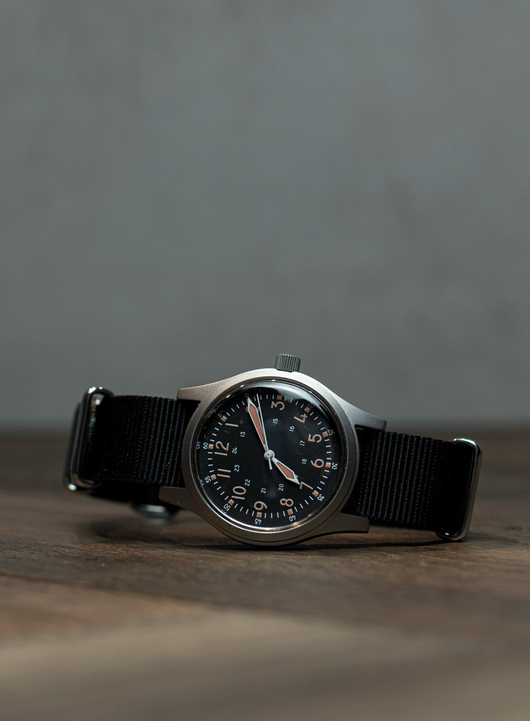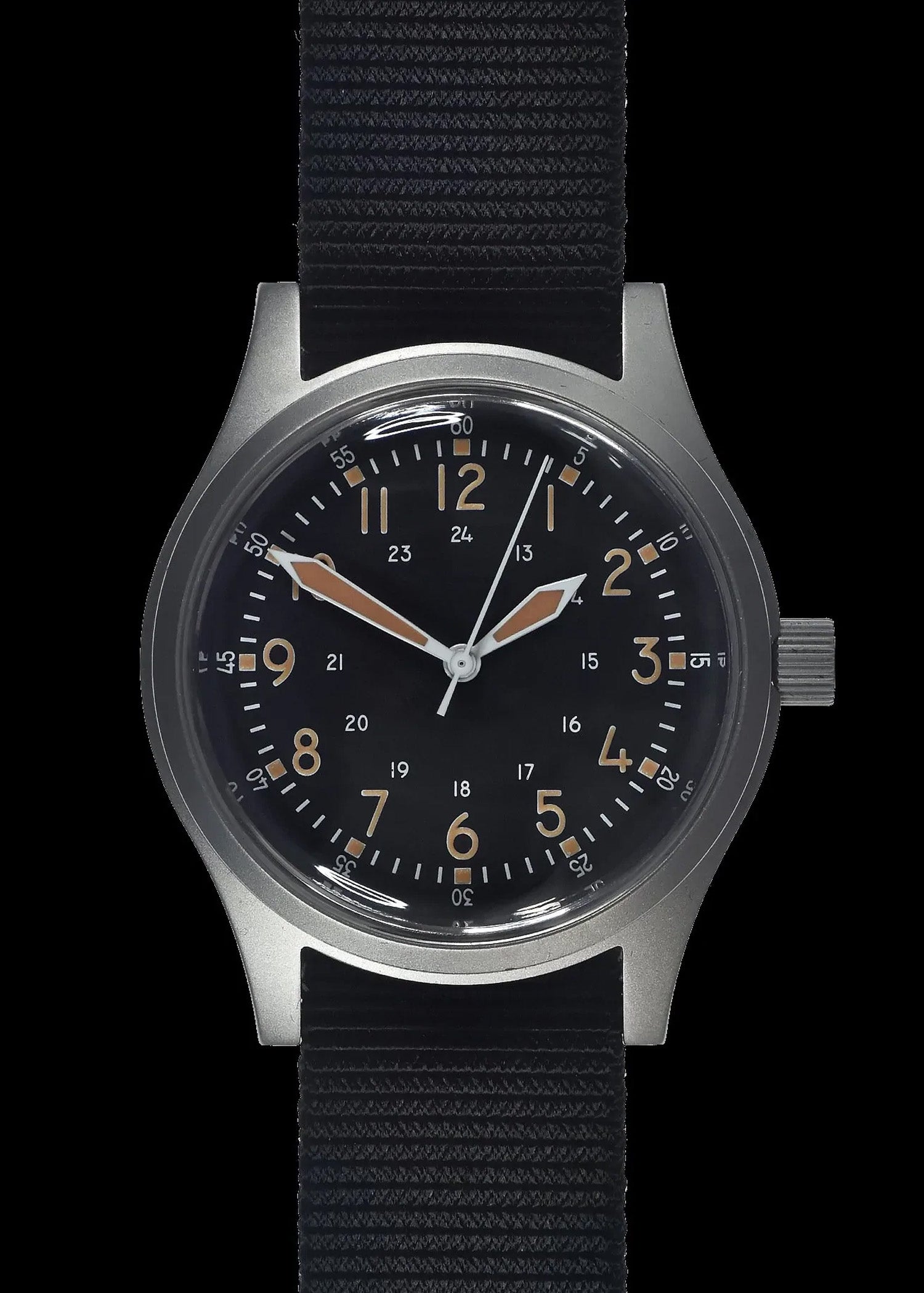 Dit automatische A-17 horloge is gebaseerd op het exacte design dat gebruikt werd in de Korea oorlog in 1950 inclusief het originele gebruik van plexiglas met een toevoeging van een automatisch uurwerk. Dichterbij het originele design is niet mogelijk. Het horloge heeft een roestvrij stalen kast met satijnen afwerking gemaakt van 316L militair roestvrij staal, het heeft een secondestop en Luminova glow-in-the-dark cijfers. Over Military Watch Company Military Watch Company is een in Zwitserland gebaseerd horlogebedrijf, opgericht in 1974 door Wolfgang Obrigheimer, die zijn hele leven militaire horloges heeft verzameld, ontworpen en geproduceerd. Sinds de oprichting richt het bedrijf zich uitsluitend op het ontwerpen en produceren van horloges met militaire specificaties. Military Watch Company produceert momenteel voor de defensies van verschillende landen horloges alsmede het re-produceren van de exacte horloges gebruikt door militairen in de jaren 1930-1980. Specificaties: Kast diameter: 38mm (inclusief kroon) Dikte: 12,9mm Bandaanzet: Veerpennen Wijzerplaat: zwart Kast: roestvrij staal 316L Achterkant kast: roestvrij staal 316L Uurwerk: 24 Juwelen Automatisch uurwerk Lichtgevend materiaal: Luminova Bandje: Zwarte Nylon horlogeband Garantie: 24 maanden Glas: Plexiglas Levertijd 1-2 dagen