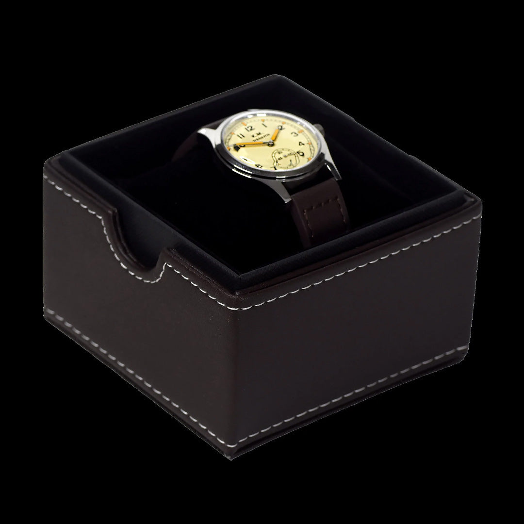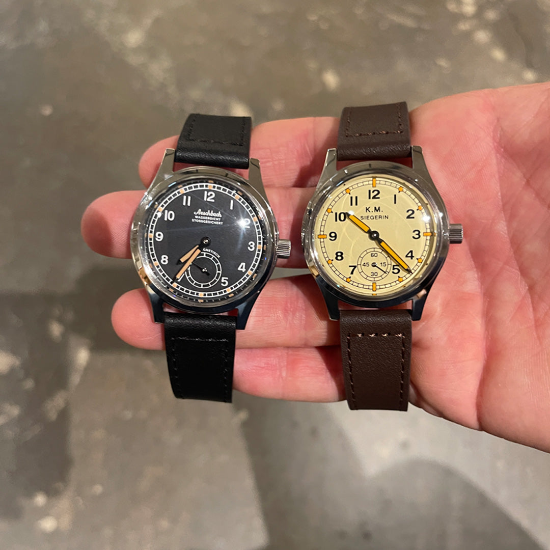 Dit automatische en zelf-opwindende horloge is gebaseerd op een klassiek WW2 design met een kleine tweede klok onderaan de wijzerplaat. De soldaten waren nooit eigenaar van de horloges maar krijgen ze per missie mee op zak, waarnaar ze het horloge weer moesten terugg geven aan de organisatie. Dit horloge is identiek aan de Aeschbach WW2 ontwerpen, hoewel de originele horloges nu extreem zeldzaam zijn en in ieder geval extreem veel waard zijn geworden. Aan de buitenkant is dit horloge vrijwel niet te onderscheiden van het origineel en heeft zelfs het plexiglas zoals het origineel voor een mooi retro uiterlijk. Het 15 juwelen uurwerk is vervangen door ons 21 juwelen uurwerk dat zichzelf opwindt maar ook opgewonden kan worden door de gebruiker. Van de buitenkant dus onafscheidbaar van het origineel, maar van de binnenkant sterk verbeterd. De kast is gemaakt van een 316L roestvrij staal, zoals opgegeven door het leger destijds, kleine seconde, secondestop, zwarte wijzerplaat met cijfers die lichtgeven in het donker. Specificaties: Kast diameter: 39mm inclusief kroon Dikte: 13,5mm Bandaanzet: veerpennen Wijzerplaat: off-white Kast: roestvrij staal 316L Achterkant kast: roestvrij staal 316L Waterdichtheid: 5 ATM (50 meter) Uurwerk: 21 juwelen automatisch Glas: Plexiglas Lichtgevend materiaal: Luminova Serienummer op de achterkant Bandje: zwart leder Met MWC doos 24 maanden garantie Levertijd 3-5 dagen Over Military Watch Company Military Watch Company is een in Zwitserland gebaseerd horlogebedrijf, opgericht in 1974 door Wolfgang Obrigheimer, die zijn hele leven militaire horloges heeft verzameld, ontworpen en geproduceerd. Sinds de oprichting richt het bedrijf zich uitsluitend op het ontwerpen en produceren van horloges met militaire specificaties. Military Watch Company produceert momenteel voor de defensies van verschillende landen horloges alsmede het re-produceren van de exacte horloges gebruikt door militairen in de jaren 1930-1980.