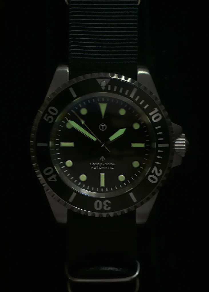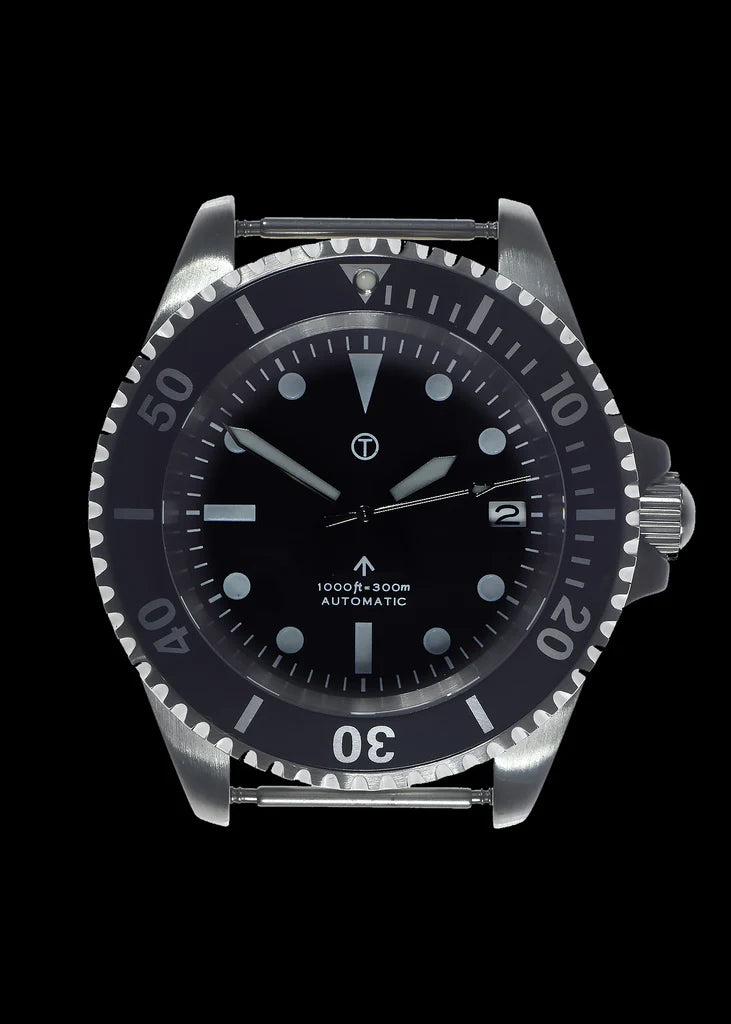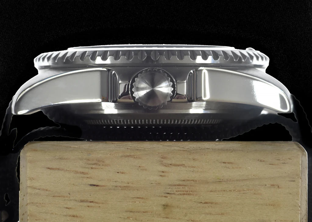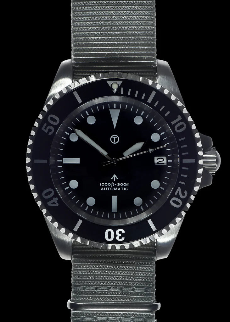 Deze duikershorloges zijn een moderne remake van ons model uit 1980, speciaal gemaakt voor een Amerikaanse aannemer die een grote verkoop aan een van zijn klanten binnenhaalde. Het horloge heeft een robuuste roestvrijstalen kast en is uitgerust met een hoogwaardig automatisch 24-jazzige zelfopwindend uurwerk. Er zijn verschillende verbeteringen aangebracht aan het originele ontwerp, waaronder een breuk- en krasbestendig saffierglas en een verhoogde waterbestendigheid. De wijzerplaat is merkloos (in het leger steriel genoemd), waardoor het horloge er erg schoon en overzichtelijk uitziet. Historische en technische achtergrondDit horloge is gebaseerd op een MOD-specificatie uit 1980 voor automatische duikershorloges (DEF STAN 66-4 [Part 1] Issue 3), waarin een unidirectionele lunette en een duidelijk gemarkeerde wijzerplaat met tritiumverf en een mineraalglas werden gespecificeerd. Het MOD document uit 1980 is te zien in de laatste twee afbeeldingen. Hoewel dit horloge de geest van het ontwerp uit 1980 behoudt, bevat het moderne verbeteringen zoals een saffierglas voor verbeterde duurzaamheid.Belangrijkste functies en upgradesUurwerk: Hoogwaardig automatisch 24-jr. NH35A zelfopwindend uurwerk met 41 uur reserveKristal: Splinter- en krasbestendig saffierglas met antireflecterende coatingWaterbestendigheid: 300m / 1000ftOntwerp: Steriele wijzerplaat voor een schoon, opgeruimd uiterlijkZichtbaarheid: Gebruikt Luminova voor uitstekende zichtbaarheid 's nachtsRiem: Geleverd met 2 x 20mm NATO webbing riemen voor veelzijdigheid en maatwerkSpecificaties:Waterbestendigheid: 300m / 1000ftKroon: SchroefvergrendelingCaseback: Schroef casebackAfmetingen:Breedte: 45mm inclusief kroon, 40mm exclusief kroonDikte: 15mmDiameter kristal: 31mmSchacht tot schacht: 49mmGewicht: 89.5gBeweging: 24-juwelen NH35A met 41-uurs reserveBand: 2 x 20mm NATO bandenVerpakking: Inclusief geschenkverpakking