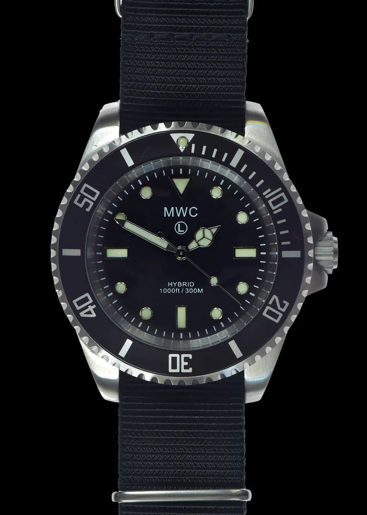 Dit militaire duikershorloge heeft een indrukwekkende waterdichtheid van 300 meter (1000 ft), een schroefkroon, een schroefkast met achterkant en Luminova-verlichting. Het heeft een geavanceerd hybride uurwerk dat de kenmerken van een automatisch horloge, zoals een sweep secondewijzer, combineert met de hoge nauwkeurigheid van een quartz uurwerk. Bovendien heeft het horloge een hackingfunctie voor synchronisatie of om het horloge te stoppen en energie te besparen tijdens langere perioden van niet-gebruik. Het MWC hybride duikershorloge integreert het beste van zowel moderne als traditionele horlogetechnologie. Het bevat functies van zowel onze conventionele automatische als quartz modellen, wat resulteert in een zeer onderhoudsarm hybride uurwerk. Dit hybride uurwerk maakt gebruik van een batterij om het uurwerk aan te drijven via spoelen en een kwartsoscillator, terwijl de wijzers mechanisch worden aangedreven en gecontroleerd. In wezen is het uurwerk mechanisch, wordt het aangedreven door een batterij en geregeld door een kristal. Onze standaard MWC duikershorloges in zowel automatisch als quartz behoren tot onze meest beproefde en geteste modellen. Dit hybride horloge is de perfecte keuze voor kopers die de voorkeur geven aan de sweep secondewijzer van een automatisch horloge met de probleemloze onderhoudsvoordelen van een kwartshorloge. Het horloge wordt geleverd met twee NATO banden, één in grijs en één in zwart. Op de achterkant van de kast staan verschillende contractmarkeringen. Afmetingen en specificaties: Waterbestendigheid: 300m / 1000ftBeweging: Hybride mechanisch/kwartsKroon: Schroef:Achterkant kast: SchroefKristal: Gehard MineraalBreedte: Inclusief kroon 45mm (Exclusief kroon 40mm)Dikte: 15mmDiameter kristal: 31mmSchacht tot schacht: 49mmGewicht: 89.5gRiem: 20mm NATO band (geleverd met 1 x grijze en 1 x zwarte riem)