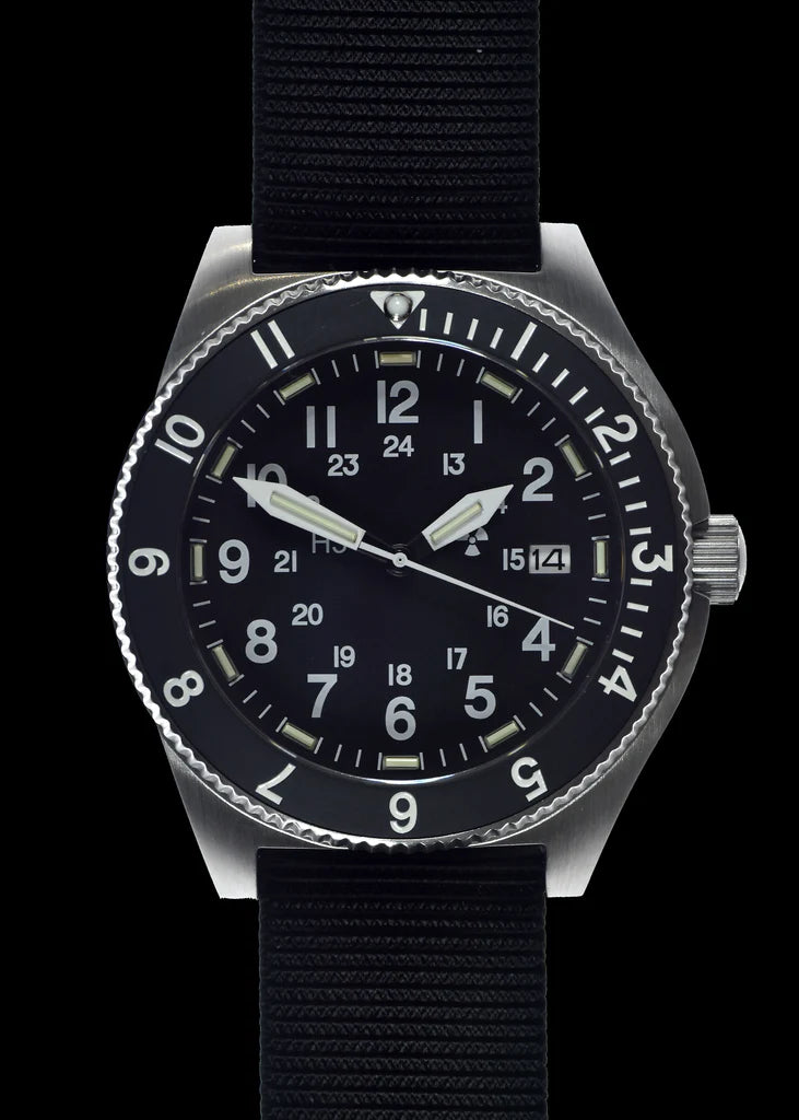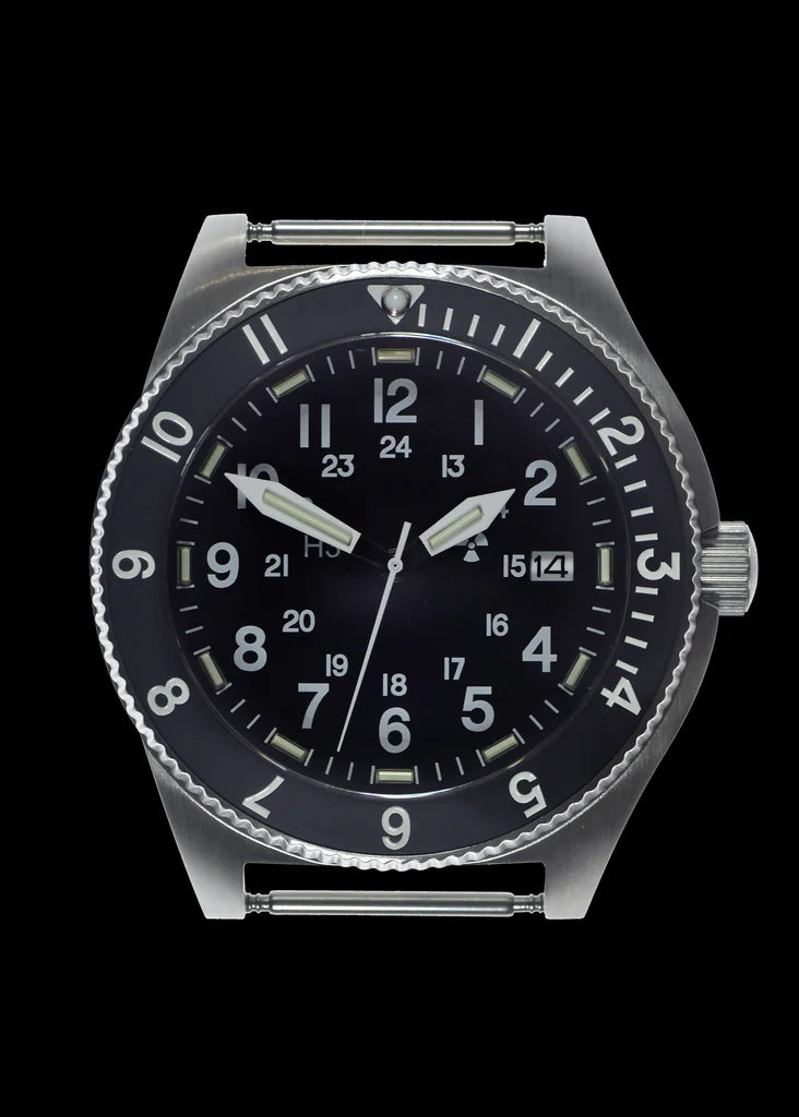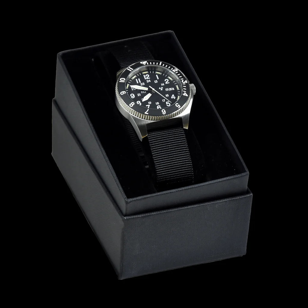 Deze robuuste 300m waterbestendige horloges zijn speciaal ontworpen voor navigatietoepassingen op zee, op het land en in de lucht, en voldoen aan de Amerikaanse MIL-PRF-46374G-specificaties. Elk horloge heeft een keramische bezel van 12 uur voor het eenvoudig en ongecompliceerd volgen van een tweede tijdzone. De bezel heeft cijfers met een hoge zichtbaarheid en de wijzerplaat is duidelijk en gemakkelijk af te lezen, zelfs bij slechte lichtomstandigheden. Het horloge maakt gebruik van Tritium GTLS (Gaseous Tritium Light Sources), die aanzienlijk helderder zijn dan conventionele lichtgevende horloges. Belangrijkste kenmerken: Uurwerk : Hoogwaardig automatisch NH35A-uurwerk, ontworpen om hoge G-krachten te weerstaan. Waterbestendigheid : 30 ATM (1000 ft/300 m), met dezelfde waterbestendigheid als onze duikmodellen, voorzien van een geschroefde kroon en kastbodem. Dubbele tijdzones : Dankzij de draaibare keramische buitenring kan het horloge de tijd in twee verschillende tijdzones tegelijkertijd weergeven. Hoogte nauwkeurigheid : Behoudt een hoge nauwkeurigheid op hoogtes tot 12.000 m / 40.000 ft zonder compenserende druk. Verlichting : Maakt gebruik van Tritium GTLS voor superieure zichtbaarheid 's nachts. Kast en glas: Materiaal : roestvrijstalen kast Kristal : Saffier van militaire kwaliteit, zeer krasbestendig, met twee interne lagen niet-reflecterende coating. Afmetingen en specificaties: Waterbestendigheid : 300m / 1000 ft Uurwerk : NH35A 24 Jewel Automatisch Verlichting : GTLS Tritium lichtbronnen Kastbreedte exclusief kroon : 40 mm Kastbreedte inclusief kroon : 45 mm Dikte : 14,4 mm Kristaldiameter : 30,5 mm Kristaltype : Saffier met antireflectiecoating Lunette : Krasbestendige keramische lunette met 120 klikken Nok tot nok : 48mm Kroon : Geschroefde kroon van 5,5 mm Band : 20 mm NATO-band Achterkant van de kast : Geschroefde achterkant van de kast Tritium en veiligheid: De wijzerplaat is voorzien van een radioactief tritiumsymbool. Tritium, een radioactieve isotoop van waterstof, zendt bètadeeltjes uit die niet door de huid, plastic of glas heen dringen. De flesjes bevatten minder dan de persoonlijke limiet van 25 millicurie, volgens de voorschriften van de US Nuclear Regulatory Commission (10 CFR 30.15). Voordelen van saffierkristal: Synthetische saffier is het beste materiaal voor horlogekristallen vanwege de uitzonderlijke sterkte en weerstand tegen breken en krassen. Dit maakt het ideaal voor militairen, beveiligingspersoneel, politieagenten en actieve buitensporters, die meer dan 70% van onze klanten uitmaken. Meer dan 90% van de gebarsten kristallen in horloges van klanten zijn mineraalglas, zelfs wanneer ze gehard zijn. Saffierkristallen, hittebehandeld om interne spanningen te verwijderen en gecoat met twee lagen antireflectiemateriaal, bieden superieure duurzaamheid. Dit is de reden waarom saffierkristal standaard is in high-end horloges en zelfs in de nieuwste iPhone-modellen, ondanks de hogere kosten. Levering