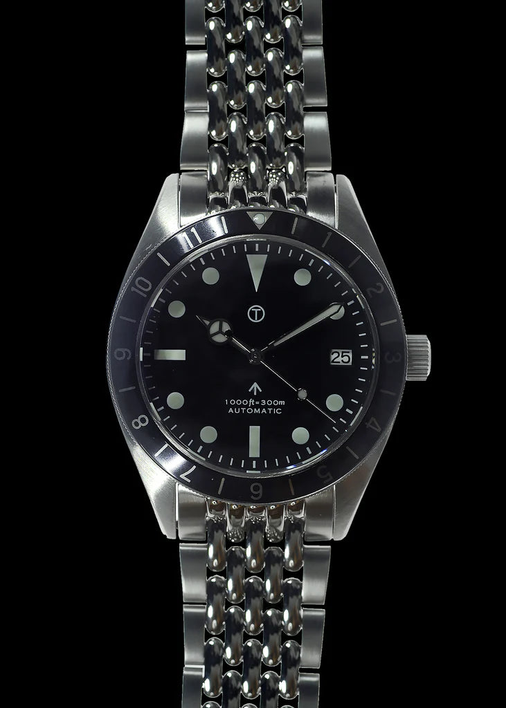 Dit horloge is gebaseerd op een militaire specificatie voor duikhorloges uit de jaren 60, maar bevat moderne upgrades zoals saffierglas en een automatisch zelfopwindend uurwerk. De robuuste roestvrijstalen kast ondersteunt handmatig opwinden indien nodig en heeft een hackfunctie voor synchronisatie. Dit horloge vertegenwoordigt uitzonderlijke waarde voor zijn hoge specificaties.