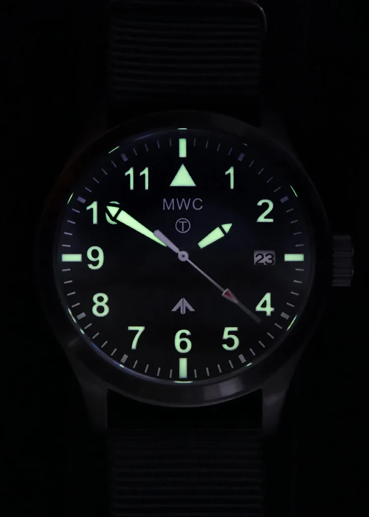 Dit klassieke MWC-pilotenmodel is waterbestendig tot 100 meter en heeft een zwarte, niet-reflecterende roestvrijstalen kast met een geschroefde kroon en achterkant.