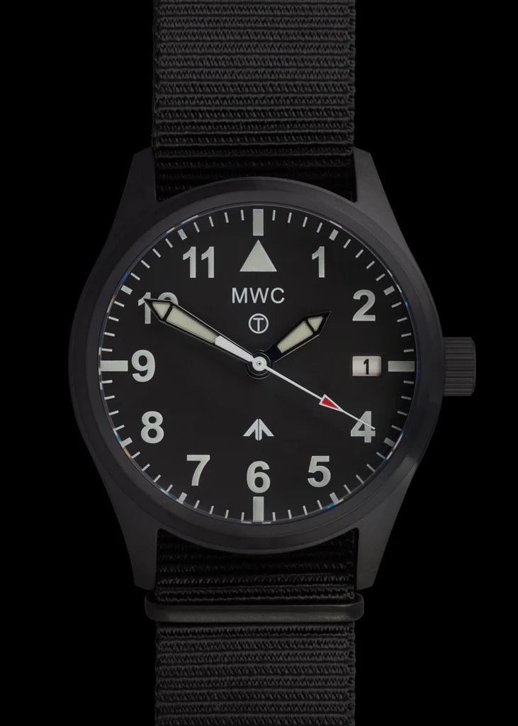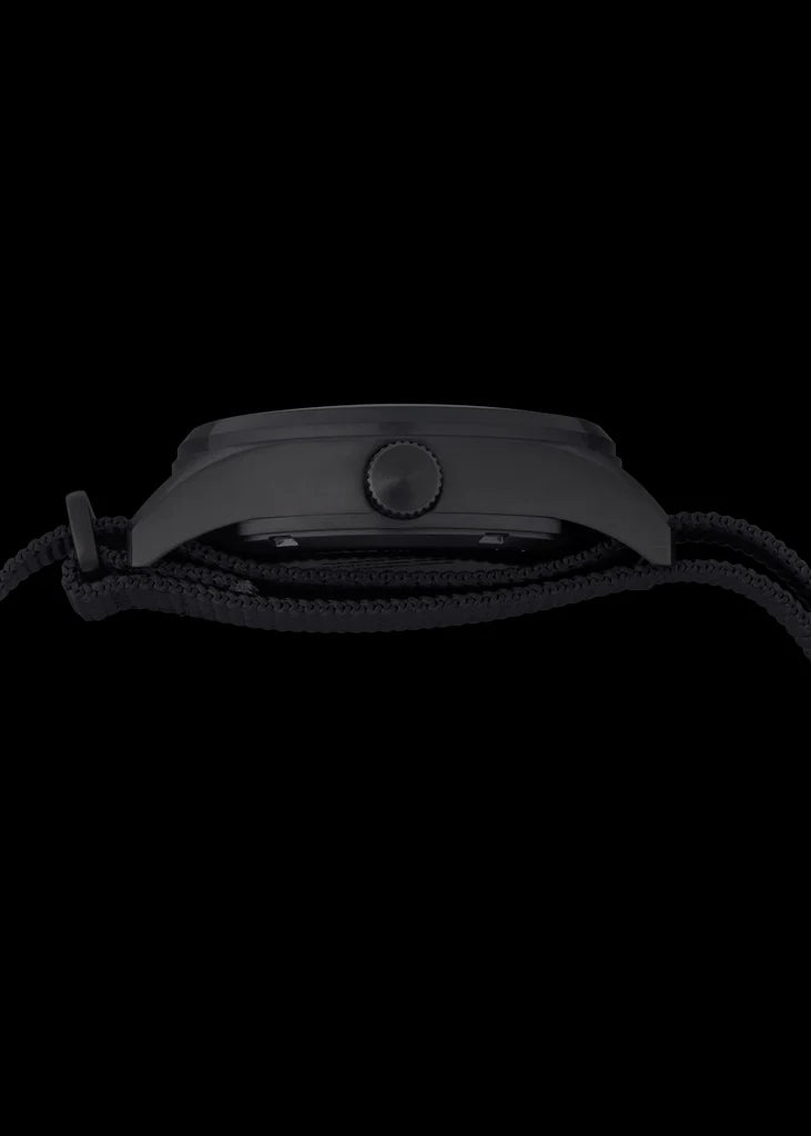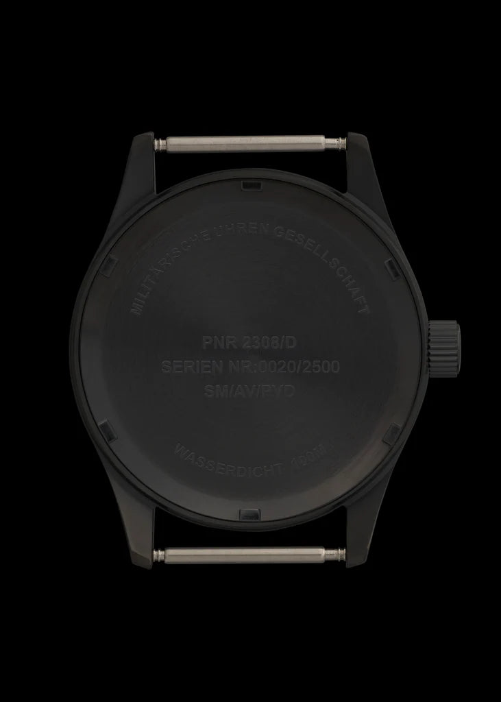 Dit klassieke MWC-pilotenmodel is waterbestendig tot 100 meter en heeft een zwarte, niet-reflecterende roestvrijstalen kast met een geschroefde kroon en achterkant. Hoewel het ontwerp doet denken aan pilotenhorloges uit de jaren 50, is het voorzien van moderne technologie voor verbeterde nauwkeurigheid, waaronder een 24-juwelen NH35 Automatic-uurwerk met een gangreserve van 41 uur en een hackfunctie. Bovendien beschikt het over een breuk- en krasbestendig saffierglas. De speciale matte zwarte niet-reflecterende PVD-afwerking (Physical Vapor Deposition) die op dit horloge wordt gebruikt, wordt vaak gespecificeerd door speciale eenheden, antiterroristische eenheden en politiediensten voor geheime operaties. Het PVD-proces plateert het staal chemisch, waardoor een kleur ontstaat die veel beter is dan geverfde afwerkingen op budgethorloges, die na verloop van tijd kunnen vervagen of afgeven. De PVD-afwerking verandert de kleur van het metaal op moleculair niveau, waardoor het intact blijft, zelfs bij intensief gebruik, hoewel het beschadigd kan raken als de kast wordt gekerfd of zwaar wordt afgeschuurd. Meestal gaat de PVD-afwerking jaren mee; we zien vaak horloges die we 30 jaar geleden hebben gemaakt met intacte PVD-plating die de tand des tijds heeft doorstaan. SPECIFICATIES: Breedte exclusief kroon: 38 mm Breedte inclusief kroon: 40 mm Dikte: 12mm Nok tot nok: 45,5 mm Schroef-omlaag vergrendelingskroon Kristaldiameter: 31,5 mm Waterbestendigheid: 100m / 330ft Uurwerk: 24 Jewel NH35A Automatisch Band: 20 mm zwarte nylon band Verlichting: Luminova Kristal: breuk- en krasbestendig saffier met antireflectiecoating Geleverd in een doos Waarom kiezen voor saffierkristal? Veel klanten vragen naar de voordelen van saffierglas ten opzichte van standaard mineraalglas. Synthetisch saffier is het beste materiaal voor horlogekristallen vanwege de uitzonderlijke sterkte en weerstand tegen breken en krassen. Deze eigenschappen maken het ideaal voor militair en veiligheidspersoneel, politieagenten en personen met een actieve levensstijl buitenshuis, die meer dan 70% van onze klanten uitmaken. Wanneer ongelukken resulteren in gebarsten kristallen, betreft het in meer dan 90% van de gevallen horloges met mineraalglaskristallen. Zelfs gehard mineraalglas is niet te vergelijken met saffier wat betreft duurzaamheid onder ongunstige omstandigheden. Saffierkristallen zijn sterk omdat ze een warmtebehandeling ondergaan die interne spanningen verwijdert, die zwakte kunnen veroorzaken. Na de productie wordt het saffierglas verwerkt tot horlogekristallen en worden er twee lagen antireflectiecoating aangebracht. Interessant is dat saffierkristal nu wordt gebruikt in de nieuwste iPhones. Vanwege de hogere kosten wordt saffierkristal doorgaans alleen aangetroffen in duurdere horloges.