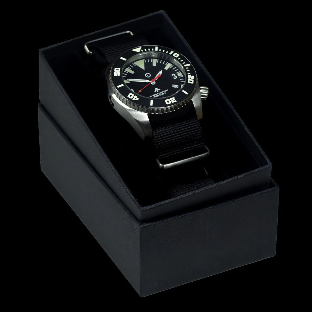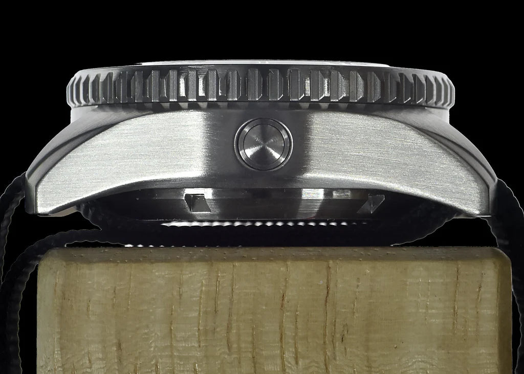 MWC "Depthmaster" Militair Duikermodel De MWC "Depthmaster" Military Diver-modellen zijn MWC's nieuwste heavy-duty-serie. Deze horloges zijn extreem robuust, met saffierglas en een waterbestendigheid van 100 atm, waardoor ze geschikt zijn voor duiken met gemengde gassen op extreme dieptes. Ze worden ook geleverd met een bredere band van 24 mm (de meeste militaire duikhorloges gebruiken een band van 20 mm) en een krasvrije keramische lunette, die gemakkelijker vast te pakken is in extreme kou. Deze horloges zijn speciaal ontworpen voor professionele duikers die onder zeer uitdagende omstandigheden opereren. Helium-ontsnappingsventiel Alle MWC 100ATM-modellen zijn uitgerust met een helium-ontsnappingsventiel. Mensen vragen zich vaak af hoe helium in een duikhorloge terechtkomt. In feite is een heliummolecuul een van de kleinste moleculen van allemaal. Omdat ze zo klein zijn, kunnen heliummoleculen toch het horloge binnendringen, ook al houden de afdichtingen water buiten. Professionele gebruikers van horloges met helium-ontsnappingsventielen zijn saturatieduikers die lange periodes op grote diepte onder hoge druk doorbrengen. Heliummoleculen kunnen zich in het horloge ophopen, waardoor er druk ontstaat die het horloge kan beschadigen of het glas of de kroon kan laten barsten. Dit is extreem gevaarlijk als u de tijd controleert of opnieuw instelt. Het helium-ontsnappingsventiel laat de heliummoleculen ontsnappen tijdens de decompressie wanneer het horloge terugkeert naar de normale druk op zeeniveau. Het ventiel is eenrichtingsverkeer, waardoor helium eruit kan, maar er niets van buitenaf in kan komen. Waarom helium belangrijk is bij diepduiken Helium wordt gebruikt bij diepzeeduiken met gemengd gas omdat het niet de negatieve effecten van stikstof heeft, zoals stikstofnarcose. Helium vervangt stikstof in de meeste diepzeeduiktoepassingen met gemengd gas. Professionele duikers kunnen langdurig op grote dieptes opereren, in droge omgevingen die onder druk staan ​​met een mengsel van zuurstof en helium. Wanneer ze boven water komen en de druk verlagen, moet dit gas worden verwijderd om problemen te voorkomen, zoals het eruit blazen van het kristal of de kroon, wat iemand mogelijk kan verwonden of zelfs blind kan maken. Bijzondere kenmerken van dit model Hoewel dit horloge vergelijkbaar is met onze andere 100ATM-modellen, is het specifiek geproduceerd voor een militair inkoopcontract. De contractant specificeerde dat het horloge een hoge nauwkeurigheid moest behouden op hoogtes tot 12.000 m / 40.000 ft zonder compenserende druk en bestand moest zijn tegen magnetische velden tot 4.800 A/m (ongeveer 60 gauss). Deze veeleisende specificaties maken dit horloge enigszins anders dan andere modellen in het 100ATM-bereik. Bovendien vereiste het contract dat de horloges merkloos moesten zijn met een steriele wijzerplaat. Specificaties Uurwerk: Zwitsers Ronda 715li met een batterijduur van 10 jaar en hackfunctie Waterbestendigheid: 100atm / 3.280ft / 1000m Kroon: Schroefvergrendeling Helium-ontsnappingsventiel: Ja Afmetingen: Breedte: Inclusief kroon 47mm (Exclusief kroon 44mm) Dikte: 18mm Kristaldiameter: 31 mm Nok tot nok: 48 mm Gewicht: 132g Lunette: Unidirectioneel niet-reflecterend met keramische inzet Kristaltype: Saffier met antireflectiecoating* Behuizing: 316L roestvrij staal Verlichting: Luminova op markeringen, wijzers en lunette Band: 24 mm NATO-webbingband (1 x zwart en 1 x grijs) Voordelen van saffierkristal Synthetisch saffier is het beste materiaal voor horlogekristallen vanwege de sterkte en kras- en breukvastheid. Deze eigenschappen maken het zeer aantrekkelijk voor militair en veiligheidspersoneel, politieagenten en mensen die een actieve levensstijl buitenshuis leiden. Deze groepen zijn goed voor meer dan 70% van onze klanten. Meer dan 90% van de incidenten met gebarsten kristal hebben betrekking op horloges met mineraalglaskristallen. Zelfs geharde mineraalkristallen kunnen niet tippen aan de duurzaamheid van saffier onder ongunstige omstandigheden. Saffierkristallen worden hittebehandeld om interne spanningen te verwijderen, waardoor ze sterker worden, en zijn gemaakt met twee lagen antireflectiecoating. Hoewel saffierkristal duurder is, wordt het meestal gemonteerd op duurdere horloges en wordt het nu gebruikt in de nieuwste iPhone-modellen.