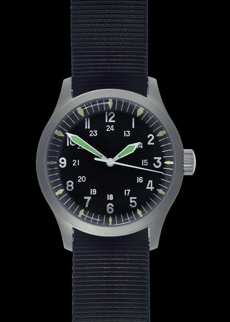 Deze recreatie is nauw gebaseerd op het originele ontwerp uit de Vietnamoorlog uit de jaren zestig, maar heeft het voordeel van een krachtig hybride uurwerk, glaskristal, een geschroefde achterkant van de kast en een waterdichtheid van 100 meter. MWC hybride horloges combineren het beste van zowel nieuwe als traditionele horlogetechnologie. Ze bevatten elementen van zowel conventionele automatische als quartzmodellen, wat resulteert in een hybride uurwerk met ultralaag onderhoud. Het hybride uurwerk maakt gebruik van een batterij om het uurwerk van stroom te voorzien via spoelen en een kwartsoscillator, maar de wijzers worden mechanisch bediend en gecontroleerd. In wezen is het uurwerk mechanisch, behalve dat het wordt aangedreven door een batterij en wordt geregeld door een kristal; het enige wat ontbreekt is een veer. Dit horloge is ideaal voor kopers die de voorkeur geven aan tweedehands automatische horloges, gecombineerd met de probleemloze onderhoudsvoordelen van een quartzhorloge. Moderne verbeteringenTerwijl het klassieke jaren 60-uiterlijk behouden blijft, bevat dit horloge belangrijke updates voor dagelijks gebruik, waaronder een verhoogde waterbestendigheid van 30 tot 100 meter en een geschroefde kroon en achterkant van de kast. De horlogefamilie omvat ook de A-11, gebaseerd op het pilotenhorloge van de USAAF uit de Tweede Wereldoorlog, en de A-17, gebaseerd op het model uit de Koreaanse oorlog. Belangrijkste kenmerkenAlle originele horloges, of het nu A-11, A-17 of GG-W-113 was, gebruikten plexiglas, wat destijds voldoende was, maar niet voldoet aan de moderne normen voor water- of krasbestendigheid. Door de updates is dit horloge, in tegenstelling tot de originele spatwaterdichte modellen, geschikt voor zwemmen en andere wateractiviteiten. Ondanks deze verbeteringen behoudt het zijn historische retro-uiterlijk, bereikt door de vervaardiging van een speciaal gebogen glaskristal dat het origineel nauw nabootst. Specificaties:Breedte inclusief kroon: 40 mmBreedte exclusief kroon: 38 mmKristal: Gehard glasDikte: 11,5 mmGewicht: 52 gLusgrootte: 20 mmLug tot Lug: 45 mmWaterbestendigheid: 100 meterAchterkant en kroon: vastgeschroefdUurwerk: hybride mechanisch/kwarts met "hacksysteem"Band: 20 mm canvasVerpakking: GeschenkdoosGarantie: 24 maanden Historische achtergrondHet volledige assortiment A-11, A-17 en GG-W-113 horloges ontstond in januari 2009 toen MWC werd benaderd door een Amerikaanse veteranenvereniging die geïnteresseerd was in het opnieuw creëren van het GG-W-113 horloge. Dit horloge zou qua uiterlijk identiek zijn aan de originelen gemaakt door Hamilton, Bulova en Benrus tijdens de oorlog in Vietnam. Na onderzoek van monsters en originele specificatiebladen kwam het resulterende horloge zeer dicht bij het origineel en was het voorzien van een hoogwaardig, volledig met juwelen bezet handopwindbaar uurwerk. Dit horloge, de GG-W-113, wordt nog steeds gemaakt door MWC. Na het succes werd er opnieuw een bestelling geplaatst om de A-11, een nog eerder model, opnieuw te creëren. De originele A-11-horloges, gemaakt vanaf 1943, werden vanwege beperkte hulpbronnen in oorlogstijd geproduceerd met goedkope metalen, waardoor ze minder duurzaam waren. Dit A-17-horloge uit de jaren 50 bevindt zich tussen de A-11 uit de jaren 40 en de GG-W-113 uit de jaren 60 en combineert elementen van beide. De nieuwe modellen uit de 100m-serie, ontwikkeld in 2019, combineren een traditioneel uiterlijk met hedendaagse prestatienormen, waardoor ze een perfecte keuze zijn voor verzamelaars en liefhebbers die zowel vintage design als moderne functionaliteit waarderen.