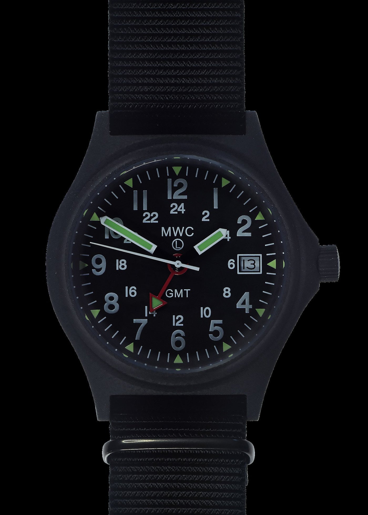Home / MWC - Military Watch Company / MWC GMT (Dual Time Zone) 100m Water resistant Militair Horloge in Black PVD Steel Case with Screw Crown – Authentiek Militair Design