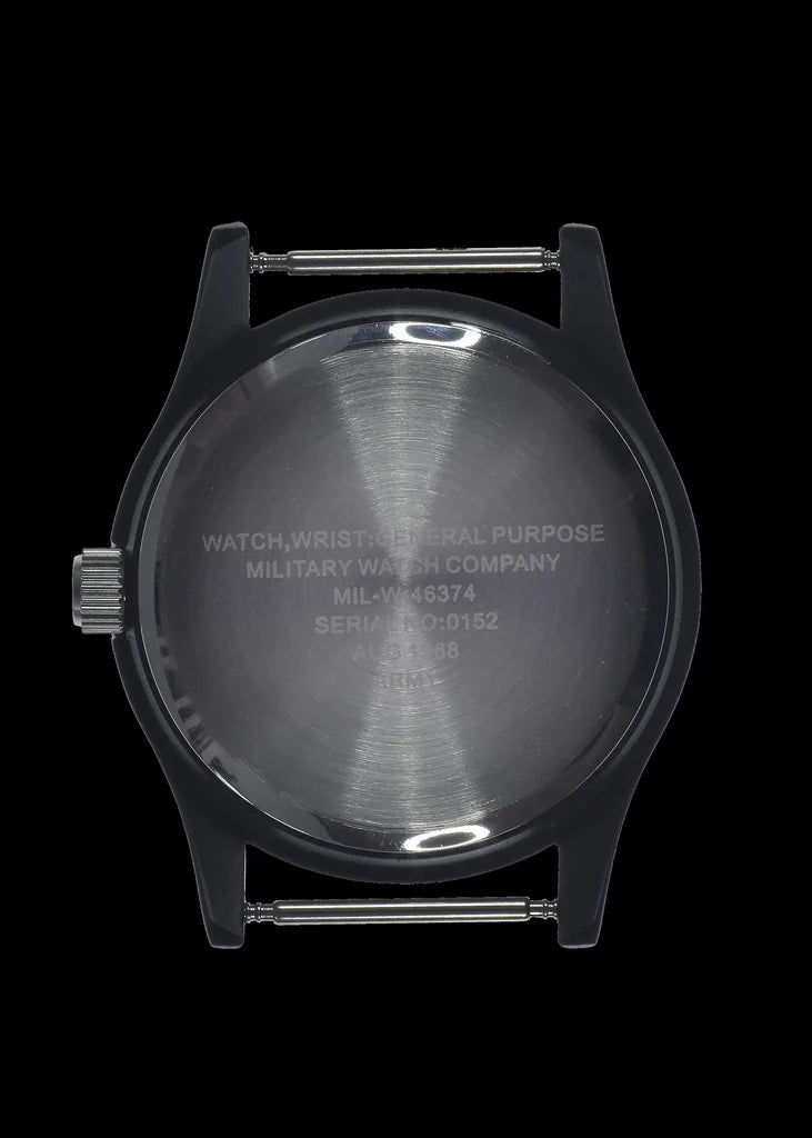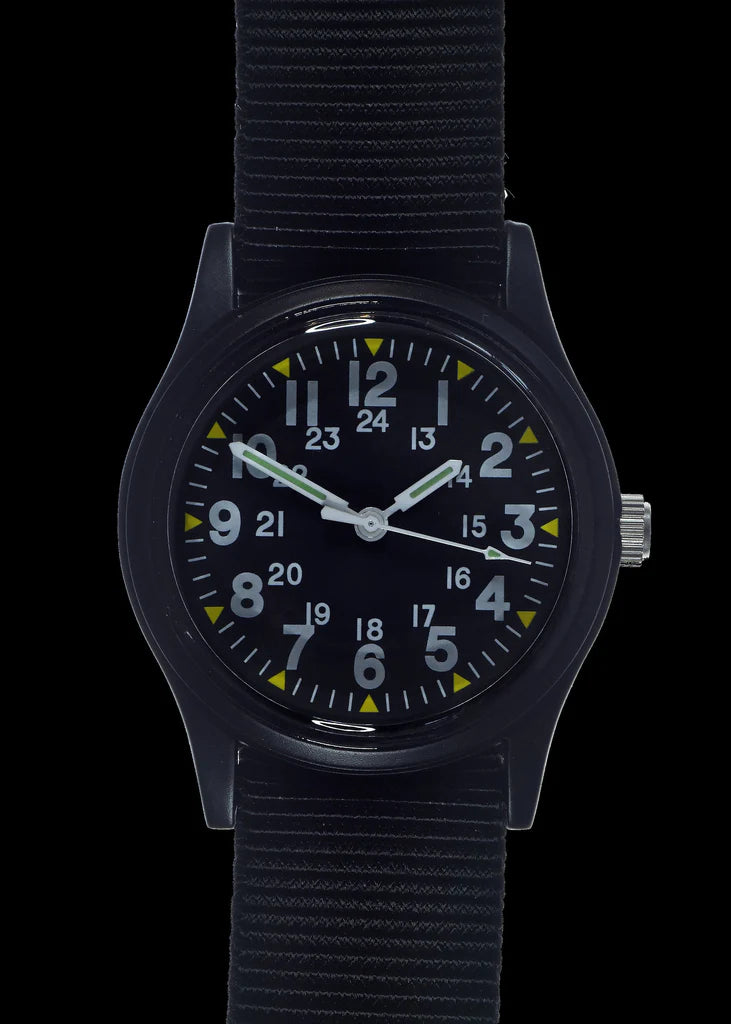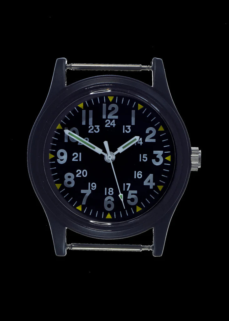 Onze Vietnamhorloges zien er vrijwel identiek uit als de horloges die door Amerikaanse troepen werden gebruikt tijdens de Vietnamoorlog in de jaren 1960 en begin 1970. Hoewel deze horloges sterk lijken op het originele model uit 1968 dat in de laatste afbeelding wordt getoond, waren de originelen van plastic en werden ze door het Amerikaanse leger als wegwerpartikelen beschouwd. De eerste specificatie was bedoeld om een goedkoop en eenvoudig “campagnehorloge” te maken voor de infanterie en andere MOS (Military Occupational Specialties). De specificatie W46374 was een kosteneffectief alternatief voor MIL-W-3818B en vroeg om een niet-onderhoudbaar horloge in een plastic kast, aangedreven door een niet-hackend uurwerk. Het vereiste minimale waterbestendigheid, bescherming tegen schokken en trillingen, extreme temperatuurtolerantie en voldoende lichtsterkte om 's nachts zichtbaar te zijn. De originele 1968 horloges hadden een groene olijfkleurige plastic kast en een diameter van iets minder dan 36 mm, waardoor dit horloge identiek is qua afmetingen en algemene uitstraling. Overgang naar metalen behuizingen: Meer dan 20 jaar geleden besloten we over te stappen van een plastic naar een metalen constructie voor het hele assortiment van deze horloges. Deze verandering pakte de tekortkomingen van de oorspronkelijke plastic modellen aan. Het MWC-ontwerpteam heeft het horloge opnieuw uitgedacht met behoud van het oorspronkelijke uiterlijk. Deze upgrade naar een metalen kast en een uurwerk dat gehackt kan worden, resulteerde in horloges die qua duurzaamheid en algemene kwaliteit veel beter zijn dan de originelen uit 1968, terwijl het uiterlijk van het oorspronkelijke horloge behouden is gebleven. Specificaties: Dikte: 8 mmAfmetingen bandje: 18 mmRiemtype: US Patroon Militaire BandBreedte inclusief kroon: 36 mmBreedte zonder kroon: 33 mmDiameter kristal: 29 mmBeweging: QuartzType batterij: R626SW, Energizer 377, of gelijkwaardigGeleverd in blikDe laatste afbeelding toont een van de originele horloges uit 1968.