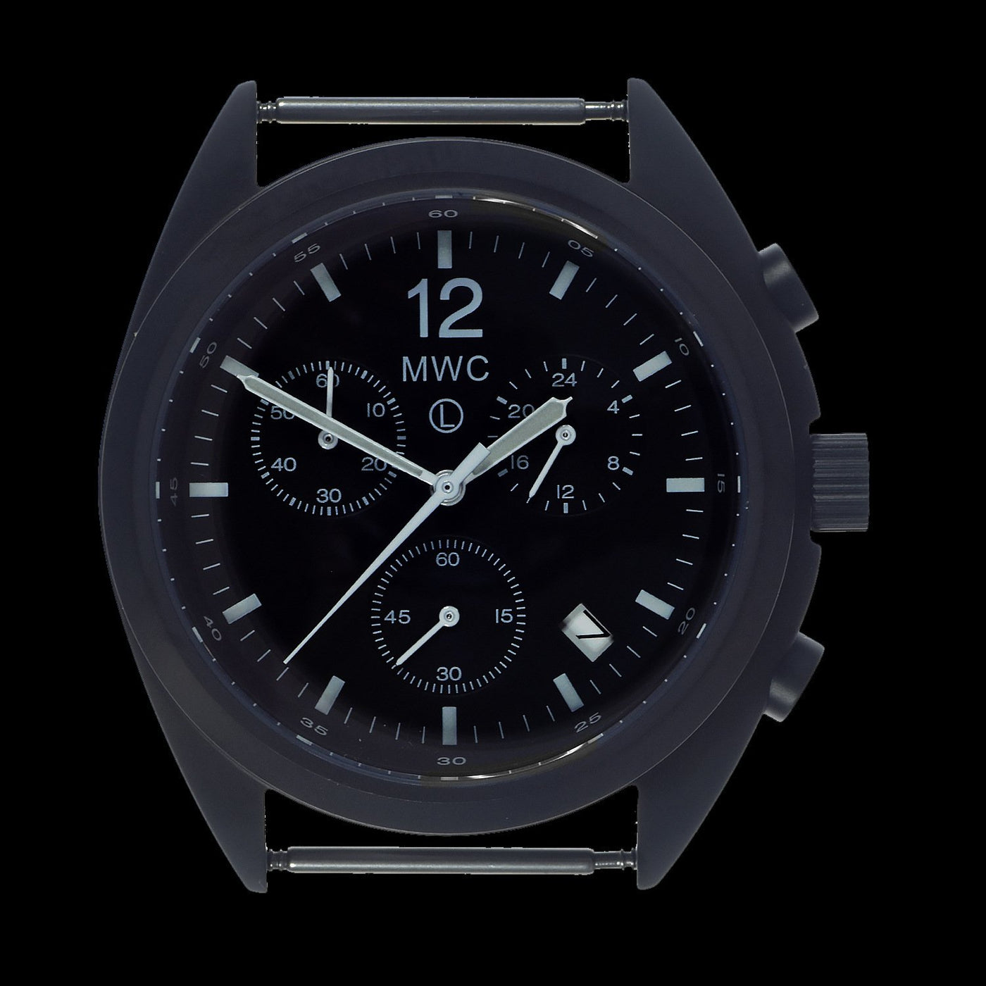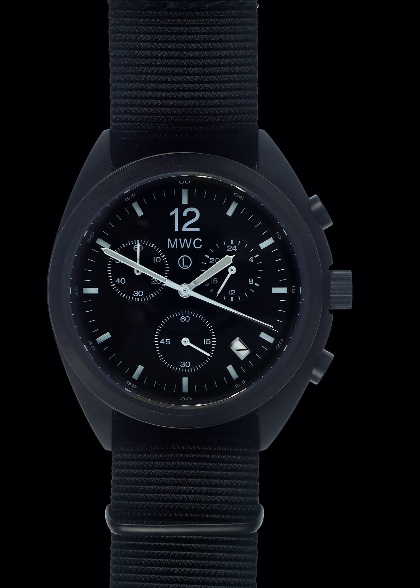 MWC Mechanical/Quartz Hybrid NATO Pattern Militair Pilots Chronograph in Non Reflective Black PVD Finish – Authentiek Militair Design is een duurzaam chronograaf militair horloge met robuust design en betrouwbare prestaties.