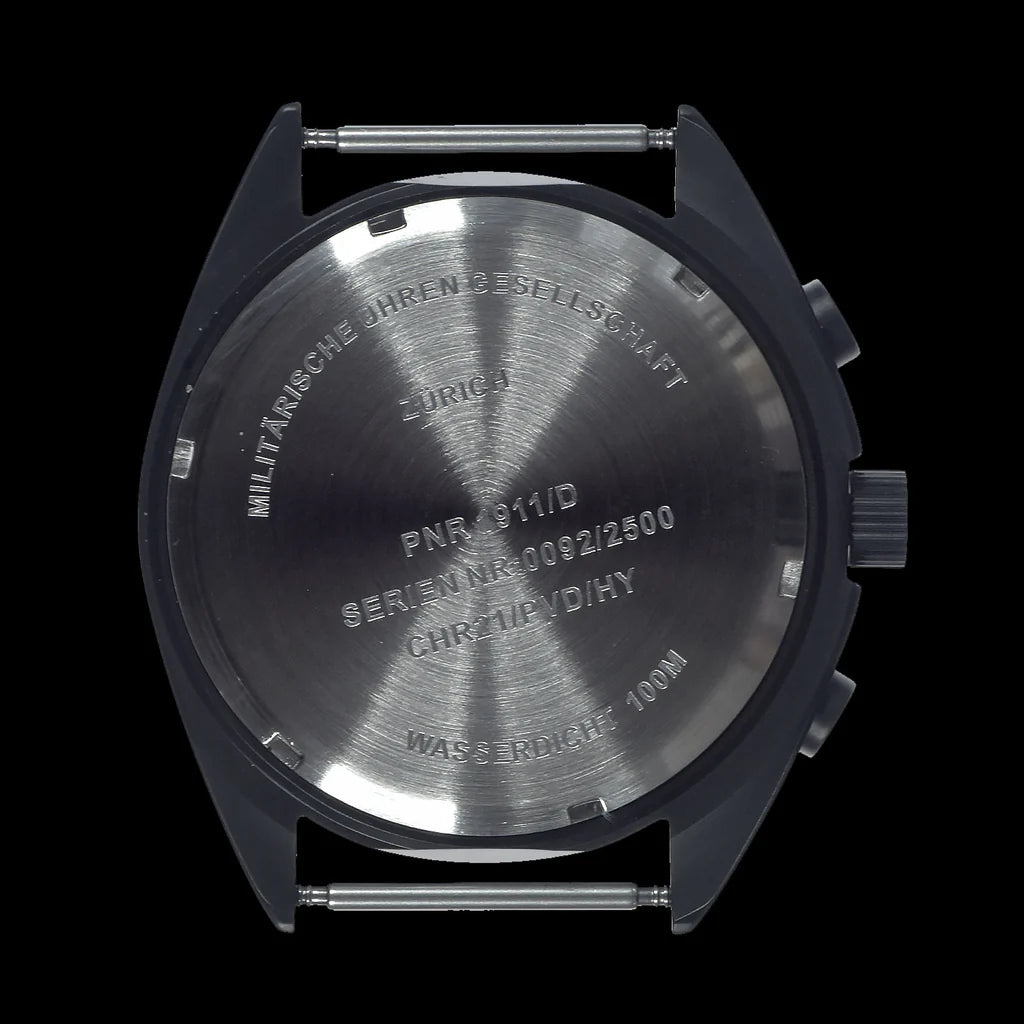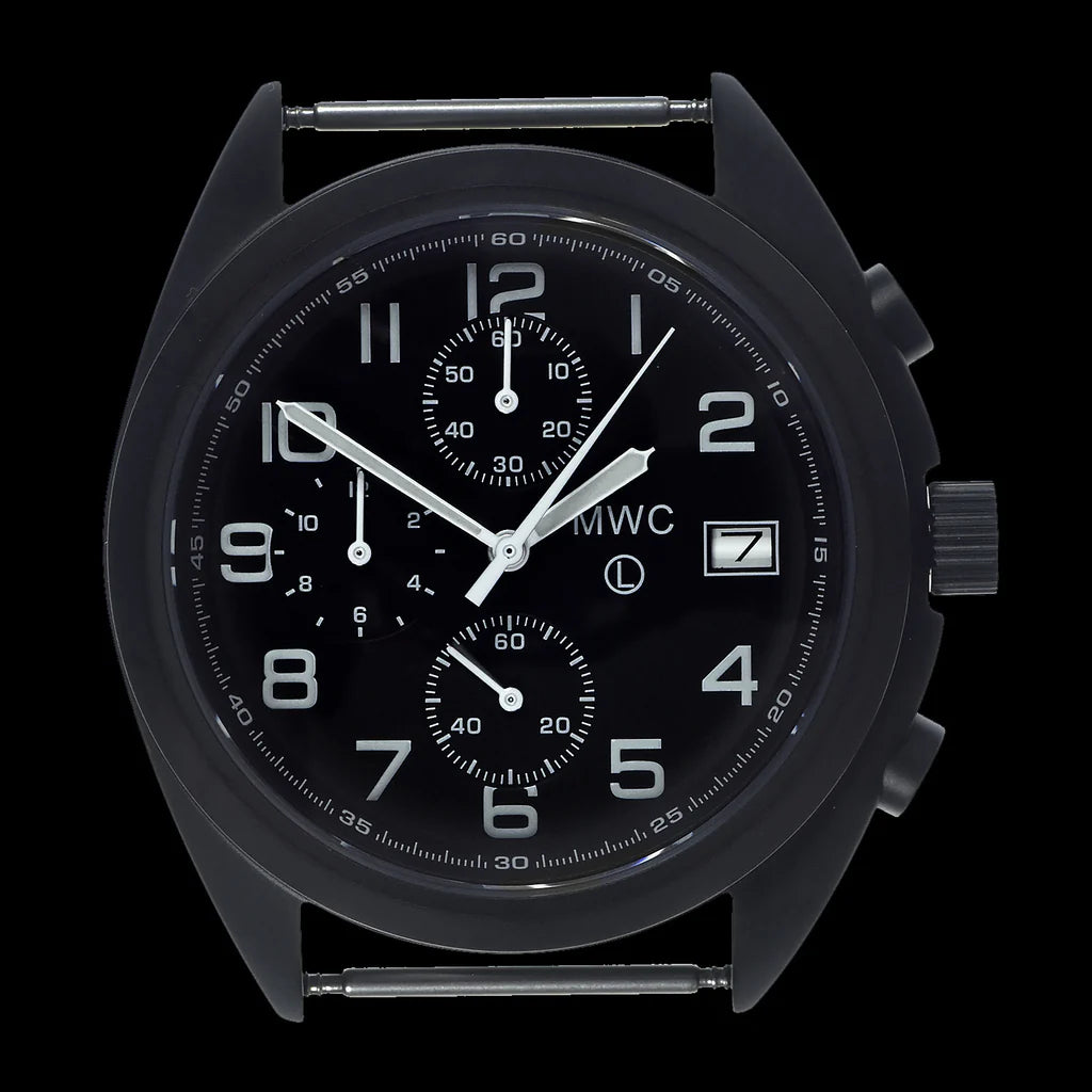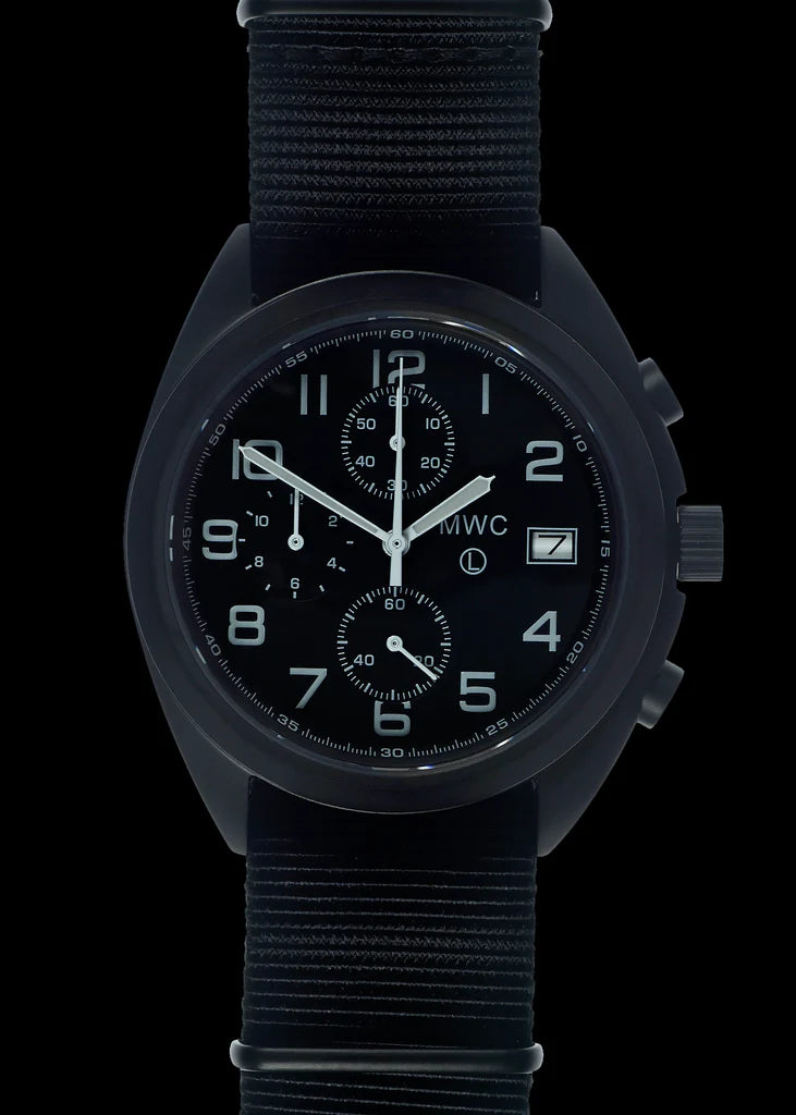 De MWC PVD NATO chronograaf is gebaseerd op de specificaties die worden gebruikt door toonaangevende fabrikanten van NATO chronografen, verbeterd met diverse verbeteringen voor een betere werking en zichtbaarheid. Hoewel hij is ontworpen om te voldoen aan de behoeften van militaire vliegtuigbemanningen, is hij ook ideaal voor piloten van luchtvaartmaatschappijen en GA-piloten. De kastmaat is 45,5 mm en de chronograaf maakt gebruik van een VK68 hybride uurwerk. Belangrijkste functies:Deze chronograaf heeft een 24-uurs (Militaire Tijd) subwijzerplaat, zodat gebruikers de tijd in 24-uurs indeling kunnen volgen. Deze functie is cruciaal voor personeel dat langere perioden zonder daglicht werkt. Het belangrijkste verschil tussen hybride horloges en mechanische chronografen is hun krachtbron. Mechanische modellen worden aangedreven door een hoofdveer die wordt geregeld door een balanswiel en bestuurd door precisiehefbomen, hamers en tandwielen. Hybride chronografen worden daarentegen aangedreven door een batterij, geregeld door een kwartskristal en bestuurd door mechanische precisiecomponenten. Deze combinatie biedt het uiterlijk en het gevoel van een mechanisch horloge met de nauwkeurigheid van quartz. Voordelen van hybride beweging:Werking: Hybride horloges functioneren uiterlijk net als mechanische horloges. De bovenste knop geeft een scherpe reactie en zet de wijzer aan in stappen van 1/5 seconde. De stopknop op 5 uur voelt net zo scherp aan en de wijzer springt bij het terugzetten terug naar 12.Nauwkeurigheid: De fabrieksclassificatie voor nauwkeurigheid is +/-20 seconden per maand, superieur aan mechanische chronografen, die meestal nauwkeurig zijn tot +/-2 of 3 seconden per dag.Onderhoud: Hybrides hebben aanzienlijk minder onderhoud nodig en zijn betrouwbaarder op de lange termijn.Gemak: Ideaal voor mensen die meerdere horloges bezitten, want hybriden hoeven niet te worden opgewonden voor gebruik. Om de paar jaar de batterij vervangen en de waterbestendigheid controleren is alles wat nodig is. Covert matzwarte PVD-afwerkingDe speciale matzwarte niet-reflecterende PVD afwerking wordt vaak gespecificeerd in militaire contracten voor speciale strijdkrachten en antiterroristische eenheden. Het PVD proces verandert de kleur van het staal op moleculair niveau, waardoor het niet zal vervagen bij intensief gebruik, in tegenstelling tot geverfde afwerkingen die kunnen vervagen of afschuren. Technische specificaties:Kastdiameter: 44 mm exclusief kroon, 45,5 mm inclusief kroonSchacht tot schacht: 49mmDikte: 13,5mmKleur wijzerplaat: ZwartKroon: Schroef-down vergrendelingMateriaal kast: 316L PVD staalAchterkant kast: 316L roestvrij staalWaterbestendigheid: 10 atm (100m of 330ft)Kristal: Saffier met antireflecterende coating*.Verlichting: Super Luminova voor maximale prestaties 's nachtsBeweging: VK68 mechanisch/kwarts hybrideBand: 22mm NATO (NATO Nylon Webbing Band)Batterij: Zilveroxide SR936SWLevensduur batterij: Ca. 3 jaarGarantie: 24 maanden Voordelen van saffierkristal:Synthetisch saffier is extreem sterk, breukvast en krasbestendig, waardoor het ideaal is voor militair en veiligheidspersoneel, politieagenten en actieve outdoor-enthousiastelingen. Deze groepen vormen meer dan 70% van ons klantenbestand. Meer dan 90% van de incidenten met gebarsten kristallen vindt plaats met mineraalglas. Zelfs geharde minerale kristallen kunnen niet tippen aan de duurzaamheid van saffier. Het saffierkristal heeft een warmtebehandeling ondergaan om interne spanningen te verwijderen en is voorzien van twee lagen antireflecterende coating. Hoewel het duurder is, rechtvaardigen de superieure levensduur, veerkracht en prestaties het gebruik ervan in horloges uit het hogere segment. Deze MWC PVD NATO chronograaf combineert de betrouwbaarheid en precisie van moderne technologie met het robuuste ontwerp en de functionaliteit die nodig zijn voor professioneel gebruik. De robuuste functies en het gebruiksvriendelijke ontwerp maken het een uitzonderlijke keuze voor zowel professionals als liefhebbers.