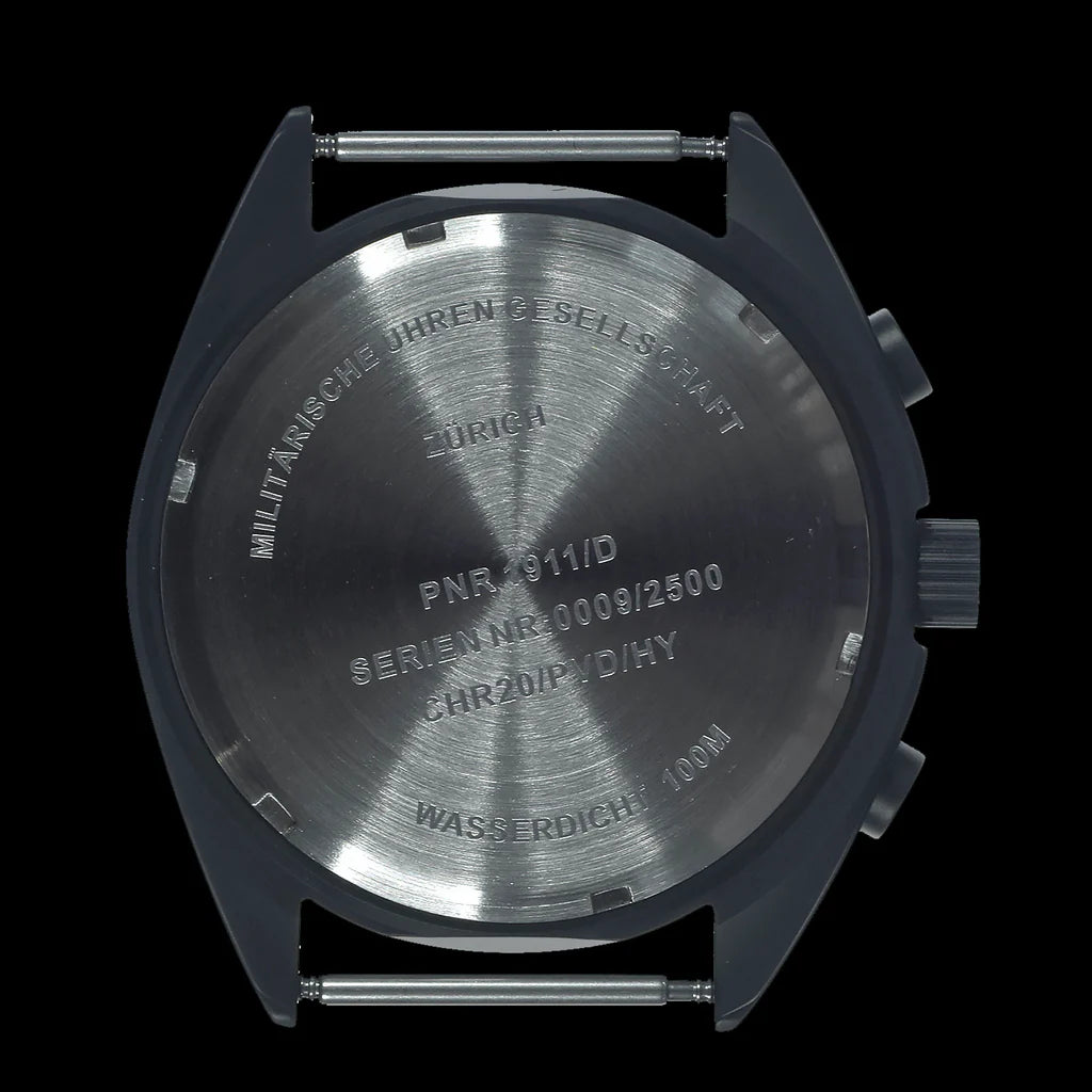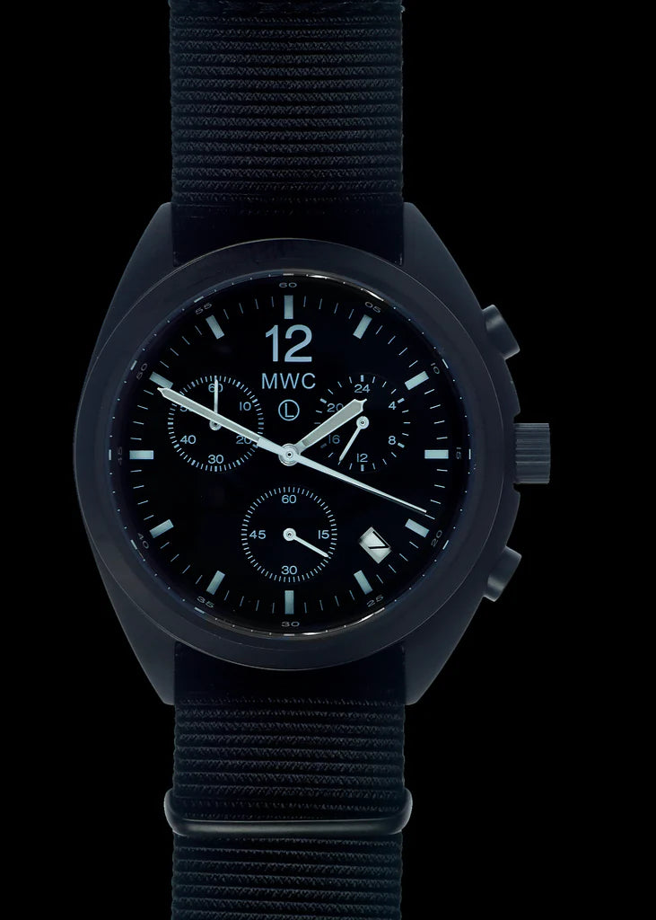 De MWC PVD NATO chronograaf is gebaseerd op de specificaties die worden gebruikt door toonaangevende fabrikanten van NATO chronografen, verbeterd met diverse verbeteringen voor een betere werking en zichtbaarheid. Hoewel hij is ontworpen om te voldoen aan de behoeften van militaire vliegtuigbemanningen, is hij ook ideaal voor piloten van luchtvaartmaatschappijen en GA-piloten. De kastmaat is 45,5 mm en de chronograaf maakt gebruik van een VK68 hybride uurwerk. Belangrijkste functies:Deze chronograaf heeft een 24-uurs (Militaire Tijd) subwijzerplaat, zodat gebruikers de tijd in 24-uurs indeling kunnen volgen. Deze functie is cruciaal voor personeel dat langere perioden zonder daglicht werkt. Het belangrijkste verschil tussen hybride horloges en mechanische chronografen is hun krachtbron. Mechanische modellen worden aangedreven door een hoofdveer die wordt geregeld door een balanswiel en bestuurd door precisiehefbomen, hamers en tandwielen. Hybride chronografen worden daarentegen aangedreven door een batterij, geregeld door een kwartskristal en bestuurd door mechanische precisiecomponenten. Deze combinatie biedt het uiterlijk en het gevoel van een mechanisch horloge met de nauwkeurigheid van quartz. Voordelen van hybride uurwerken:Werking: Hybride horloges functioneren aan de buitenkant als mechanische horloges. De bovenste knop geeft een scherpe reactie en start de tijdwijzer in stappen van 1/5 seconde. De stopknop op 5 uur voelt net zo scherp aan en de wijzer springt terug naar 12 als hij opnieuw wordt ingesteld.Nauwkeurigheid: De fabrieksclassificatie voor nauwkeurigheid is +/-20 seconden per maand, superieur aan mechanische chronografen, die meestal nauwkeurig zijn tot +/-2 of 3 seconden per dag. Technische specificaties:Kastdiameter: 44 mm exclusief kroon, 45,5 mm inclusief kroonSchacht tot schacht: 49mmDikte: 13,5mmKleur wijzerplaat: ZwartKroon: Schroef-down vergrendelingMateriaal kast: 316L PVD staalAchterkant kast: 316L roestvrij staalWaterbestendigheid: 10 atm (100m of 330ft)Kristal: Saffier met antireflecterende coating*.Verlichting: Super Luminova voor maximale prestaties 's nachtsBeweging: VK68 mechanisch/kwarts hybrideBand: 22mm NATO (NATO Nylon Webbing Band)Batterij: Zilveroxide SR936SWLevensduur batterij: Ca. 3 jaarGarantie: 24 maandenVoordelen van saffierkristalSynthetisch saffier is extreem sterk, breukvast en krasbestendig, waardoor het ideaal is voor militair en veiligheidspersoneel, politieagenten en actieve outdoor-enthousiastelingen. Deze groepen vormen meer dan 70% van ons klantenbestand. Meer dan 90% van de incidenten met gebarsten kristallen vindt plaats met mineraalglas. Zelfs geharde minerale kristallen kunnen niet tippen aan de duurzaamheid van saffier. Het saffierkristal heeft een warmtebehandeling ondergaan om interne spanningen te verwijderen en is voorzien van twee lagen antireflecterende coating. Hoewel het duurder is, rechtvaardigen de superieure levensduur, veerkracht en prestaties het gebruik ervan in horloges uit het hogere segment. Deze MWC PVD NATO chronograaf combineert de betrouwbaarheid en precisie van moderne technologie met het robuuste ontwerp en de functionaliteit die nodig zijn voor professioneel gebruik. De robuuste functies en het gebruiksvriendelijke ontwerp maken het een uitzonderlijke keuze voor zowel professionals als liefhebbers.