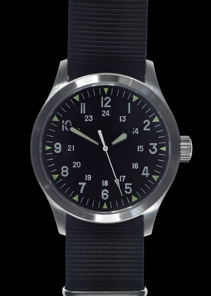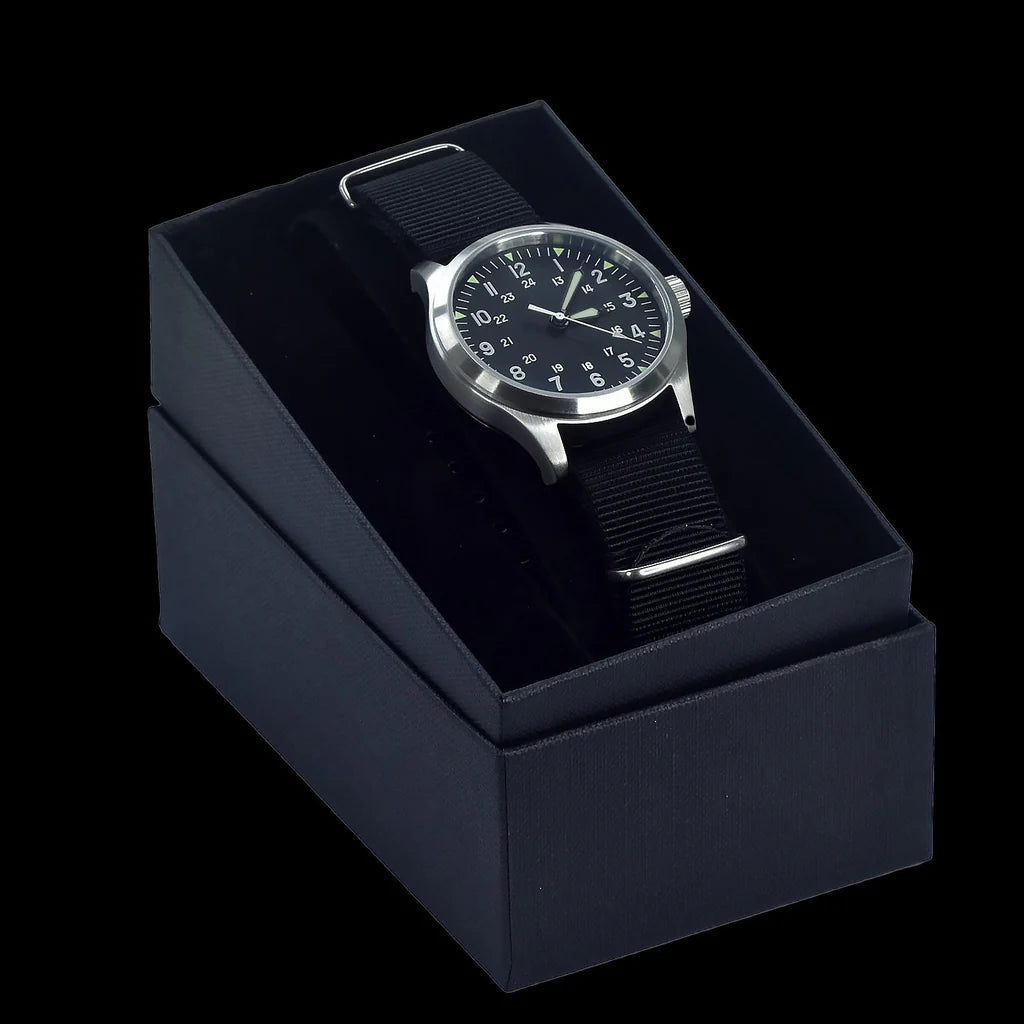 Deze MKIII-variant heeft een merkloze wijzerplaat, een populaire aanvraag onder veel MWC-klanten. De MKIII Automatic is een moderne recreatie van de klassieke NATO-specificatiehorloges uit de jaren 50, oorspronkelijk gemaakt onder de referentie 6B/346 Mk XI van het Britse Ministerie van Defensie. Hoewel het de vintage stijl van die horloges behoudt, bevat het een modern automatisch uurwerk met 24 juwelen met een gangreserve van 41 uur en een hackfunctie, wat een sterk verbeterde nauwkeurigheid biedt. Vanwege budgetbeperkingen kunnen moderne militaire troepen zich geen horloges van deze kwaliteit meer veroorloven en kiezen ze in plaats daarvan voor goedkopere modellen die aan hun behoeften voldoen. Historisch gezien kochten troepen wereldwijd horloges van merken als Rolex, IWC, Omega en Longines. Die dagen zijn voorbij, maar velen willen nog steeds een horloge met een militair patroon en hogere specificaties. De MKIII voldoet aan deze behoefte en spaart geen kosten om een product van superieure kwaliteit te creëren. Van het hoogwaardige uurwerk tot de geborstelde roestvrijstalen kast uit de jaren 50/60, vervaardigd en met de hand afgewerkt in Zürich, dit model vertegenwoordigt uitzonderlijk vakmanschap. Het beschikt ook over een geüpgraded kras- en breukbestendig saffierglas met een niet-reflecterende coating. Het horloge heeft een geschroefde achterkant en een geschroefde kroon, waardoor het zeer nauwkeurig, robuust en waterbestendig is tot 100 m (330 ft). Specificaties: Diameter: 38 mm (exclusief kroon), 40 mm (inclusief kroon) Nok tot nok: 45 mm Waterbestendigheid: 100 m / 330 ft Lichtgevend materiaal: Super Luminova Uurwerk: 24 Jewel NH35A Automatisch Uurwerk Gangreserve: 41 uur Kroon: Geschroefd Achterkant: geschroefd Kristal: breuk- en krasbestendig saffierkristal Dikte: 11,3 mm Gewicht: 73 gram Band: 20 mm NATO-webbingband Voordelen van saffierkristal: Veel mensen vragen naar de voordelen van saffierglas ten opzichte van standaard mineraalglas. Synthetisch saffier is het beste materiaal voor horlogekristallen vanwege de sterkte en weerstand tegen breken en krassen. Deze eigenschappen maken het zeer aantrekkelijk voor militair en veiligheidspersoneel, politieagenten en mensen die een actieve levensstijl buitenshuis hebben, die meer dan 70% van onze klanten uitmaken. Wanneer klanten ongelukken meemaken die resulteren in gebarsten kristallen, betreft het in meer dan 90% van de gevallen horloges met mineraalglas, ook al gebruiken wij gehard mineraalglas. Saffierkristallen worden hittebehandeld om interne spanningen te verwijderen, waardoor ze sterker worden. Ze hebben ook twee lagen antireflectiecoating. Interessant is dat saffierkristal nu wordt gebruikt in de nieuwste iPhone-modellen. Hoewel saffierkristal duurder is, wordt het doorgaans aangetroffen in duurdere horloges vanwege de superieure duurzaamheid.