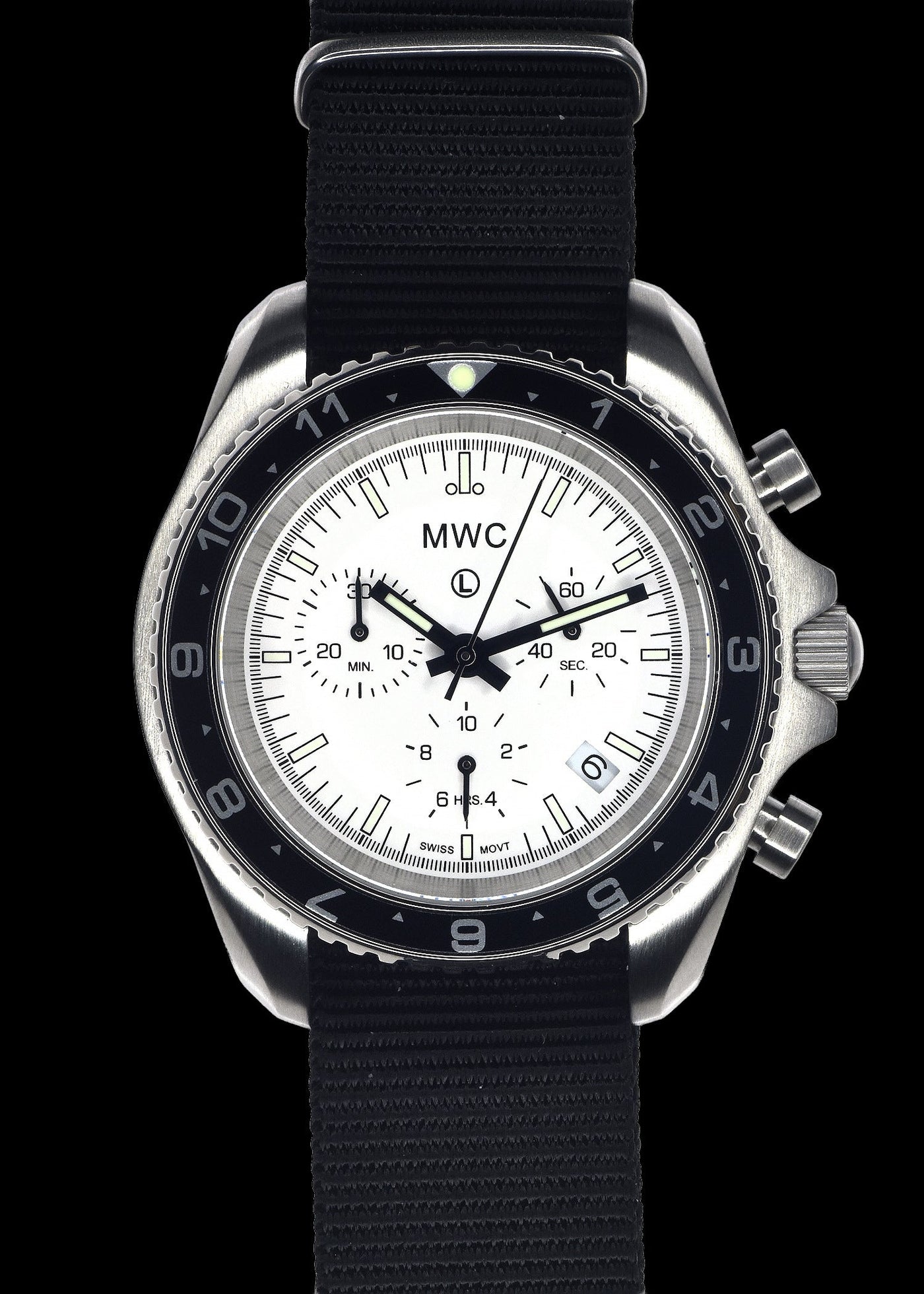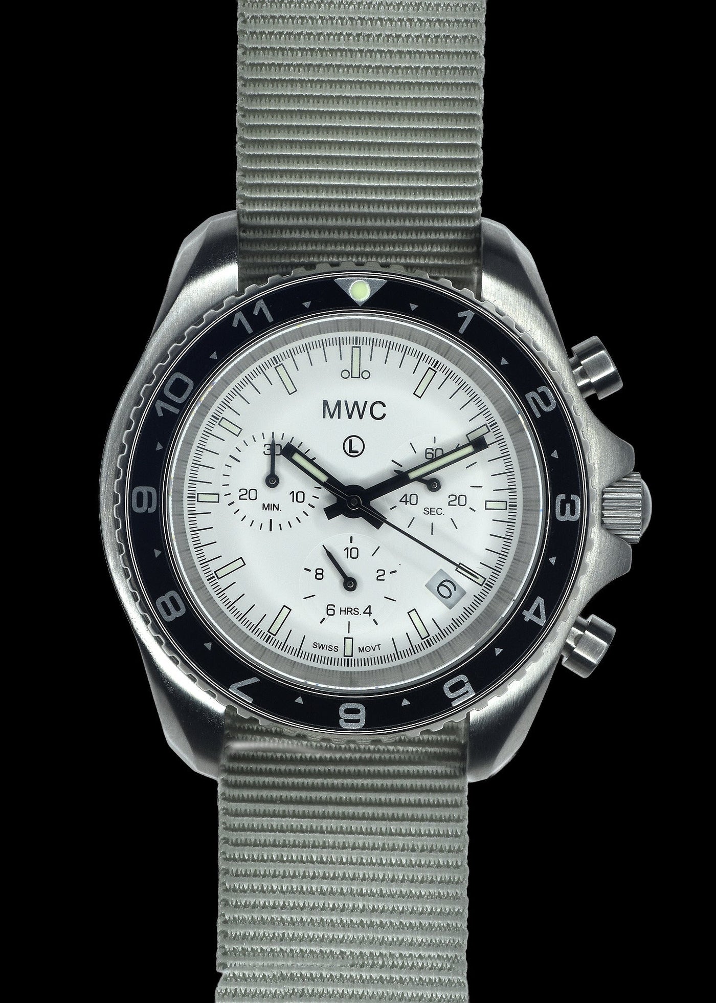 MWC NATO Pattern Stainless Steel Militair Pilots Chronograph with Sapphire Crystal and Swiss Ronda Movement – 12 Hour GMT Bezel – Authentiek Militair Design is een duurzaam chronograaf militair horloge met robuust design en betrouwbare prestaties.