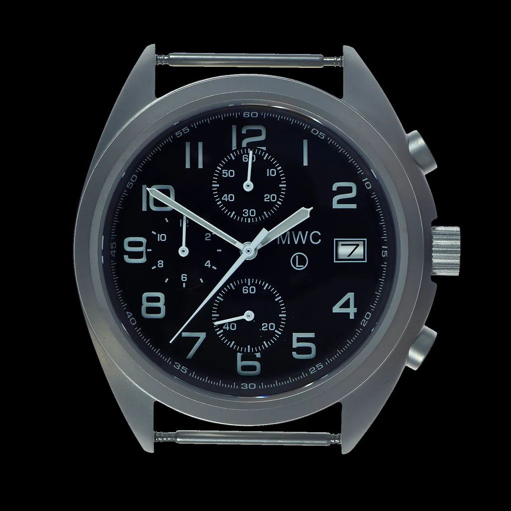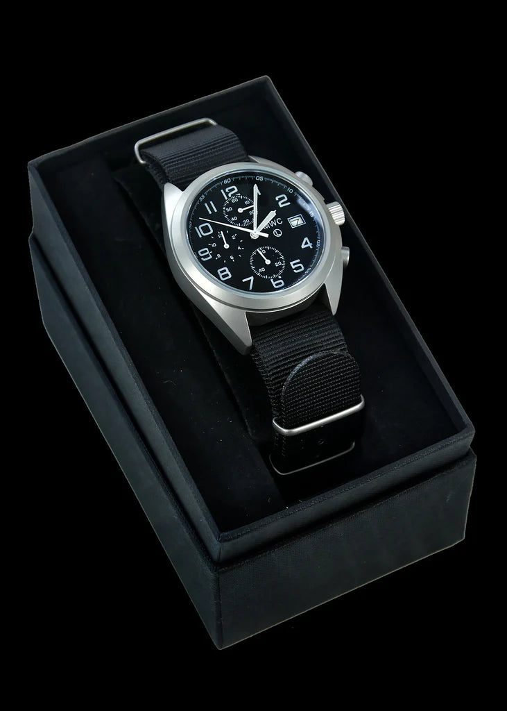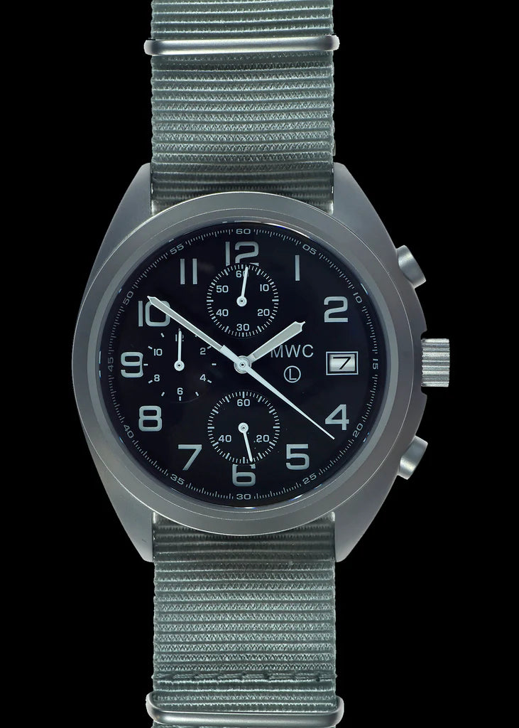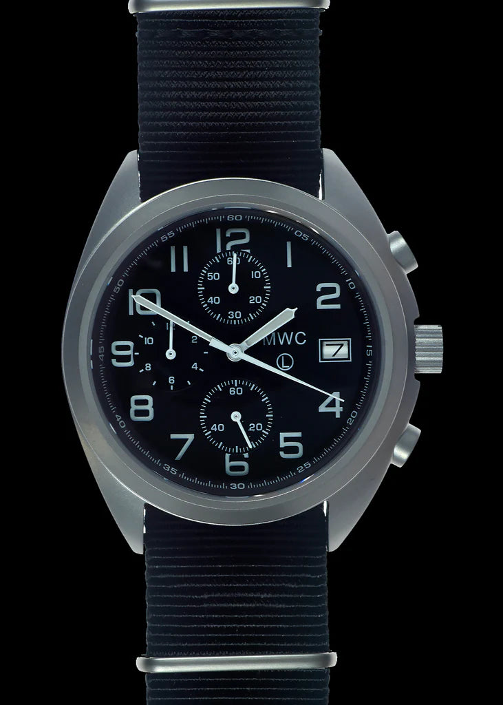 De MWC NATO chronograaf in een roestvrijstalen kast is ontworpen om te voldoen aan de behoeften van militair boordpersoneel, piloten van luchtvaartmaatschappijen en GA-piloten. Hoewel dit horloge is gebaseerd op de specificaties die worden gebruikt door andere toonaangevende fabrikanten van NATO chronografen, bevat het verschillende verbeteringen voor een betere werking en zichtbaarheid. De kastmaat is 45,5 mm en de chronograaf maakt gebruik van een hoogwaardig VK68 hybride uurwerk. Belangrijkste kenmerken:24-uurs subwijzerplaat: Deze chronograaf heeft een 24-uurs (militaire tijd) subwijzerplaat, zodat gebruikers de tijd in 24-uurs indeling kunnen volgen. Deze functie is essentieel voor personeel dat langere perioden zonder daglicht werkt.Hybride uurwerk: Het VK68 hybride uurwerk combineert de kenmerken van een automatisch horloge, zoals een sweep secondewijzer, met de nauwkeurigheid van een quartz uurwerk. Deze opzet biedt het uiterlijk en het gevoel van een mechanisch horloge met de precisie van een quartz uurwerk.Onderhoud en nauwkeurigheid: Het hybride uurwerk vereist aanzienlijk minder onderhoud dan mechanische chronografen en is veel minder gevoelig voor betrouwbaarheidsproblemen op de lange termijn. De fabrieksnauwkeurigheid is +/-20 seconden per maand, wat veel beter is dan mechanische chronografen die tot +/- 2 of 3 seconden per dag nauwkeurig zijn. Werking:Als je op de bovenste knop drukt, krijg je een scherpe reactie en de tijdwijzer begint te tikken in stappen van 1/5 seconde, net als bij een mechanische chronograaf. De stopknop op 5 uur geeft hetzelfde scherpe gevoel bij het stoppen van de chronograaf en als je er nogmaals op drukt, springt de wijzer direct terug naar 12. Het hybride uurwerk wordt aangedreven door een batterij, geregeld door een kwartskristal en aangestuurd door mechanische precisiecomponenten. Praktische voordelen:Deze modellen zijn ideaal voor mensen met meerdere horloges omdat ze niet opgewonden hoeven te worden voordat ze gedragen worden. Het enige wat nodig is, is om de paar jaar de batterij vervangen en de waterbestendigheid controleren. Een uniek aspect is de afwezigheid van een tik, waardoor het alleen al op basis van gedrag niet te onderscheiden is van een mechanisch horloge. Technische specificaties:Kastdiameter: 44mm (exclusief kroon) en 45,5mm (inclusief kroon)Schacht tot schacht: 49mmDikte: 13,5mmKroon: Schroef naar beneden vergrendeling kroonKleur wijzerplaat: ZwartMateriaal kast: 316L roestvrij staalCaseback: 316L roestvrij staalWaterbestendigheid: 10 atm (100m of 330ft)Kristal: Saffierglas met antireflecterende coating*.Band: 22mm NATO (geleverd met 1 x zwarte en 1 x grijze NATO nylon banden)Verlichting: Super Luminova voor maximale prestaties 's nachtsBeweging: VK68 Meca-kwartsBatterij: Zilveroxide SR936SWLevensduur batterij: Ca. 3 jaarVoordelen van saffierkristal:Synthetisch saffier is extreem sterk, breukvast en krasbestendig, waardoor het ideaal is voor militair en veiligheidspersoneel, politieagenten en actieve outdoor-enthousiastelingen. Deze groepen vormen meer dan 70% van ons klantenbestand. Uit onze waarnemingen blijkt dat meer dan 90% van de incidenten met gebarsten horlogekristallen plaatsvindt met mineraalglas. Zelfs geharde minerale kristallen kunnen niet tippen aan de duurzaamheid van saffier. Saffierkristallen worden versterkt door een warmtebehandeling om interne spanningen te verwijderen en worden gecoat met twee lagen antireflectiecoating. Hoewel saffierkristallen duurder zijn, bieden ze een superieure levensduur, veerkracht en prestaties, waardoor het gebruik ervan in horloges uit het hogere segment gerechtvaardigd is.
