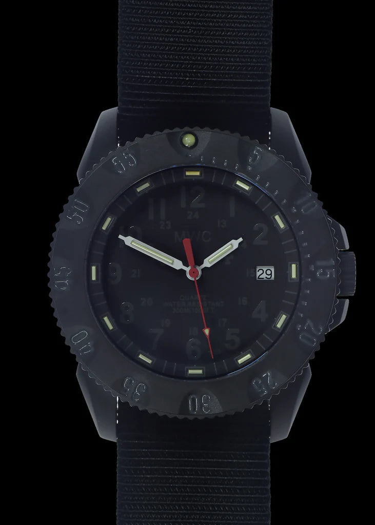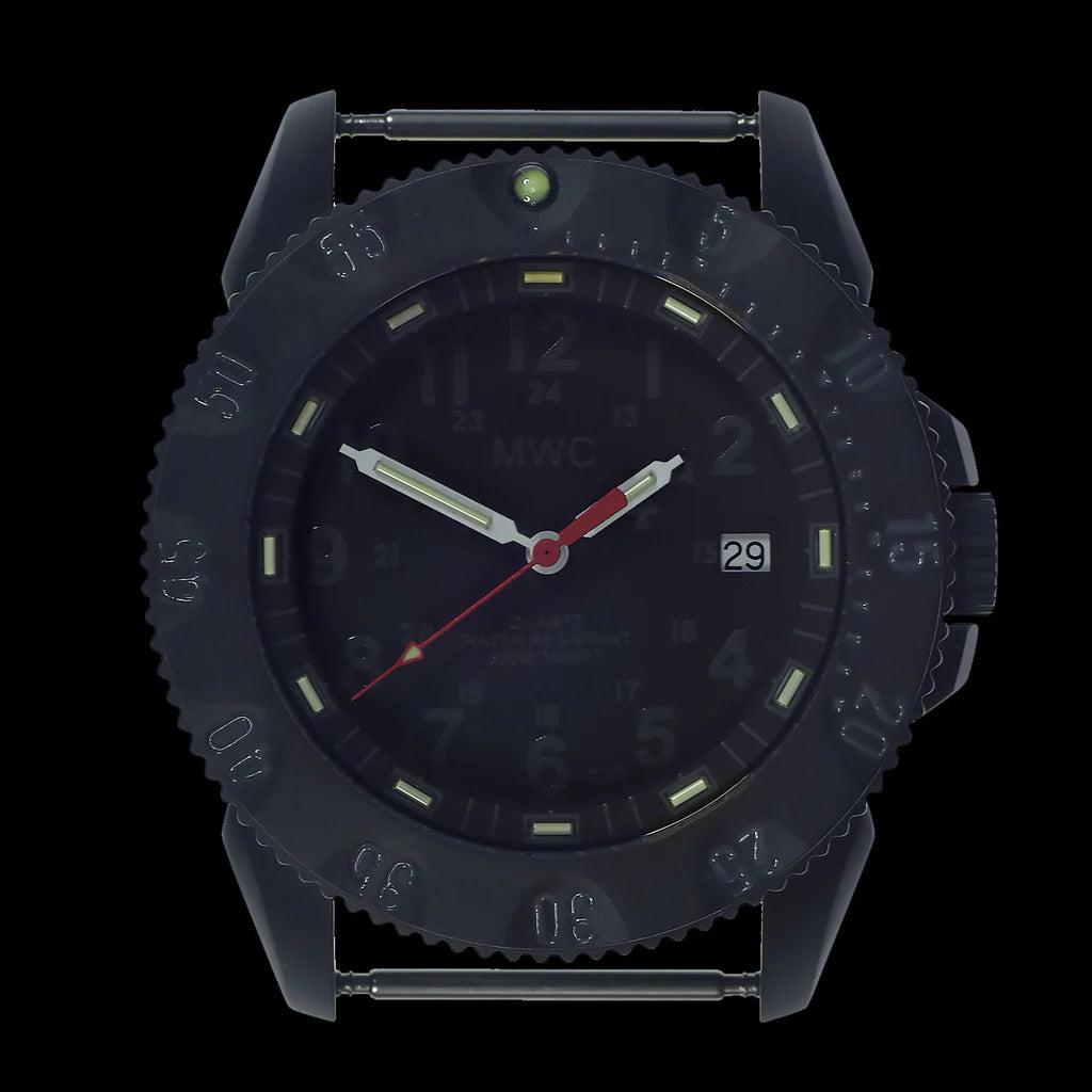 De MWC Tactical Series horloges, gebouwd met robuuste titanium kasten en 300m waterbestendigheid, zijn ontworpen voor wetshandhaving en maritieme, oppervlakte- en luchttoepassingen. Deze horloges overtreffen de US W-46374F Type 6 specificaties en worden regelmatig besteld door een bulkcontractklant die jaarlijks aanzienlijke bestellingen plaatst voor varianten van dit specifieke ontwerp. Gebaseerd op ontwerpen uit het midden van de jaren 90, bevat het huidige model belangrijke upgrades zoals een solide titanium kast en lunette, breukvast saffierglas en verbeterde waterbestendigheid verhoogd van 30m tot 300m (99ft tot 1000ft). Extra functies zijn onder andere een schroefbare vergrendelbare kroon en achterkant, goed zichtbare cijfers op de lunette en een duidelijke, gemakkelijk af te lezen wijzerplaat onder ongunstige lichtomstandigheden. Het horloge maakt gebruik van Zwitserse Tritium GTLS (Gaseous Tritium Light Sources), die aanzienlijk helderder zijn dan conventionele lichtgevende horloges. De speciale, verborgen, matzwarte, niet-reflecterende PVD-afwerking (Physical Vapor Deposition) die op dit horloge wordt gebruikt, wordt vaak gespecificeerd voor speciale eenheden, antiterroristische eenheden en politiediensten voor geheime operaties. Het PVD-proces bindt de kleur chemisch aan het titanium op moleculair niveau, wat zorgt voor een langdurige duurzaamheid die veel beter presteert dan geverfde afwerkingen. Hoewel extreme slijtage de afwerking kan beschadigen, blijft deze over het algemeen vele jaren intact, zelfs onder zware omstandigheden. Belangrijkste kenmerken: Uurwerk : Zeer nauwkeurig Ronda Quartz-uurwerk (Ronda-kaliber 715li) dat bestand is tegen hoge G-krachten, met een batterijduur van 10 jaar en een indicator voor het einde van de batterijduur. Waterbestendigheid : 30 ATM (1000 ft/300 m), geschikt voor gebruik op het land en op zee, met dezelfde waterbestendigheid als onze duikmodellen. Hoogte nauwkeurigheid : Ontworpen om een hoge nauwkeurigheid te behouden op hoogtes tot 12.000 m / 40.000 ft zonder compenserende druk. Tritiumsymbool : De wijzerplaat is voorzien van een radioactief tritiumsymbool, conform de voorschriften van de Amerikaanse Nuclear Regulatory Commission (10 CFR 30.15). Afmetingen: Behuizing : Titanium Diameter exclusief kroon : 42 mm Diameter inclusief kroon : 44mm Nok tot nok : 49 mm Kristaldiameter : 32 mm Waterbestendigheid : 300m Lichtgevend materiaal : Zwitserse GTLS Tritiumbuizen Uurwerk : Ronda 715li met 10 jaar batterijduur Kroon en achterkant : geschroefd Kristal : Krasbestendig saffier met antireflectiecoating Dikte : 14mm Band : 22 mm Amerikaanse militaire band met weefpatroon Garantie : 24 maanden Voordelen van saffierkristal: Synthetische saffier is het beste materiaal voor horlogekristallen vanwege de sterkte en weerstand tegen breken en krassen, waardoor het ideaal is voor militairen, beveiligingspersoneel, politieagenten en actieve buitenenthousiastelingen. Deze groepen vormen meer dan 70% van onze klanten. Meer dan 90% van de gebarsten kristallen in horloges van klanten zijn mineraalglas, zelfs wanneer ze gehard zijn. Saffierkristallen worden hittebehandeld om interne spanningen te verwijderen en gecoat met twee lagen antireflectiemateriaal. Ondanks de hogere kosten is saffierkristal een standaardfunctie in high-end horloges en wordt het nu gebruikt in de nieuwste iPhone-modellen vanwege de superieure duurzaamheid.