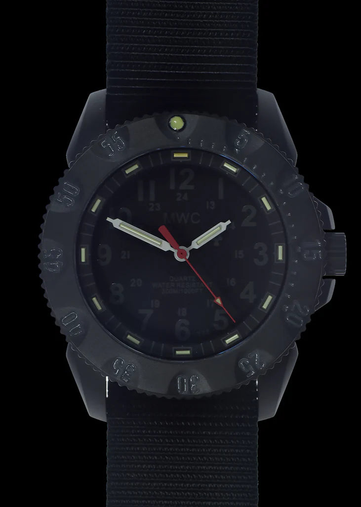 De MWC Tactical Series horloges, gebouwd met robuuste titanium kasten en 300m waterbestendigheid, zijn ontworpen voor wetshandhaving en maritieme, oppervlakte- en luchttoepassingen. Deze horloges overtreffen de US W-46374F Type 6 specificaties en worden regelmatig besteld door een bulkcontractklant die jaarlijks aanzienlijke bestellingen plaatst voor varianten van dit specifieke ontwerp. Gebaseerd op ontwerpen uit het midden van de jaren 90, bevat het huidige model belangrijke upgrades zoals een solide titanium kast en lunette, breukvast saffierglas en verbeterde waterbestendigheid verhoogd van 30m tot 300m (99ft tot 1000ft). Extra functies zijn onder andere een schroefbare vergrendelbare kroon en achterkant, goed zichtbare cijfers op de lunette en een duidelijke, gemakkelijk af te lezen wijzerplaat onder ongunstige lichtomstandigheden. Het horloge maakt gebruik van Zwitserse Tritium GTLS (Gaseous Tritium Light Sources), die aanzienlijk helderder zijn dan conventionele lichtgevende horloges. De speciale, verborgen, matzwarte, niet-reflecterende PVD-afwerking (Physical Vapor Deposition) die op dit horloge wordt gebruikt, wordt vaak gespecificeerd voor speciale eenheden, antiterroristische eenheden en politiediensten voor geheime operaties. Het PVD-proces bindt de kleur chemisch aan het titanium op moleculair niveau, wat zorgt voor een langdurige duurzaamheid die veel beter presteert dan geverfde afwerkingen. Hoewel extreme slijtage de afwerking kan beschadigen, blijft deze over het algemeen vele jaren intact, zelfs onder zware omstandigheden. Belangrijkste kenmerken: Uurwerk : Zeer nauwkeurig Ronda Quartz-uurwerk (Ronda-kaliber 715li) dat bestand is tegen hoge G-krachten, met een batterijduur van 10 jaar en een indicator voor het einde van de batterijduur. Waterbestendigheid : 30 ATM (1000 ft/300 m), geschikt voor gebruik op het land en op zee, met dezelfde waterbestendigheid als onze duikmodellen. Hoogte nauwkeurigheid : Ontworpen om een hoge nauwkeurigheid te behouden op hoogtes tot 12.000 m / 40.000 ft zonder compenserende druk. Tritiumsymbool : De wijzerplaat is voorzien van een radioactief tritiumsymbool, conform de voorschriften van de Amerikaanse Nuclear Regulatory Commission (10 CFR 30.15). Afmetingen: Behuizing : Titanium Diameter exclusief kroon : 42 mm Diameter inclusief kroon : 44mm Nok tot nok : 49 mm Kristaldiameter : 32 mm Waterbestendigheid : 300m Lichtgevend materiaal : Zwitserse GTLS Tritiumbuizen Uurwerk : Ronda 715li met 10 jaar batterijduur Kroon en achterkant : geschroefd Kristal : Krasbestendig saffier met antireflectiecoating Dikte : 14mm Band : 22 mm Amerikaanse militaire band met weefpatroon Garantie : 24 maanden Voordelen van saffierkristal Synthetisch saffier is de beste keuze voor horlogeglas vanwege de duurzaamheid, krasbestendigheid en breukvastheid. Betrouwbaarheid: Ideaal voor militair personeel, politie en buitenliefhebbers, die meer dan 70% van onze klantenkring uitmaken. Verbeterde sterkte: warmtebehandeld saffier biedt een ongeëvenaarde veerkracht vergeleken met plexiglas of mineraalglas. Antireflectiecoating: zorgt voor een helder zicht onder alle omstandigheden. De geschiedenis van MIL-W-46374-G horloges en de P656 De P656-serie bouwt voort op de basis van de MIL-W-46374F-specificaties, die voor het eerst werden gepubliceerd op 14 oktober 1991. De "G"-revisie halverwege de jaren negentig leidde tot de creatie van het Stocker & Yale Type 6 Navigator-horloge, een hoeksteen van horloges van militaire kwaliteit. De laatste afbeelding toont een origineel Amerikaans MIL-W-46374F Type 6 horloge uit 1995 P656: Een moderne evolutie De P656-serie bouwt voort op de erfenis van de Type 6 Navigator, maar introduceert ook roestvrijstalen kasten, verbeterde waterbestendigheid en geavanceerde functies voor zowel militaire als civiele toepassingen. Belangrijkste kenmerken van de originele Type 6 Navigator Hacking Quartz Movement voor precisie. Draaibare GMT-patroonlunette voor navigatie. Bestand tegen grote hoogte tot 35.000 ft. Magnetische bescherming (125±1 gauss). Corrosiebestendigheid tegen zoute mist en transpiratie. Tritiumverlichting met rood/oranje markeringen op 12 uur voor oriëntatie. Productietijdlijn van de originele P650 1995: Eerste batch. 1999: Tweede productierun. 2000: Laatste batch.