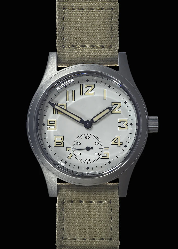 During WWII, Ordnance watches were produced for the US military by Waltham, Hamilton, Bulova, and Elgin. Due to wartime conditions and material shortages, these original watches were made of nickel-plated brass instead of stainless steel, making it difficult to find one in good condition today. The original Ordnance watches were small, measuring 33/34mm, but we have slightly increased the size to 36.5 mm (excluding the crown) and 39 mm (including the crown) for a more contemporary fit. The US Army Ordnance Department watches were designed for non-aviation personnel, while the similar A-11 model, with a black dial, was issued to USAAF aircrew. Interestingly, the British War Office had procured a similar watch design in 1938, two years prior to the introduction of the ORD watches, explaining the near-identical look of both. Historical Context: Before WWII, soldiers, particularly in WWI, often adapted civilian pocket watches or trench watches for military use. It wasn’t until shortly before WWII that the British War Office began procuring watches specifically designed for military use, with the US Army Ordnance Department following suit two years later. The ORD DEPT. issued these watches during the war, with the 1940 Ordnance Department specifications standardizing the timepieces for military personnel. This watch, though automatic, captures the spirit of the original hand-wound design. We also offer a manual hand-winding version for those seeking a closer match to the WWII models. Comparison: The last two images, shared by a watch enthusiast, show original WWII Elgin ORD watches, while the third image displays a Grana ATP British military watch. As seen in the photos, both follow a nearly identical design, with minimal differences. Specifications: Case Diameter: 36.5 mm (excluding crown), 39 mm (including crown) Lug to Lug: 43 mm Thickness: 13.5 mm Lug Type: Spring Bars Dial Color: Off White Case Material: 316L Stainless Steel Caseback: 316L Stainless Steel Crown: 316L Stainless Steel Water Resistance: 5 ATM (50 meters) Movement: 21-jewel automatic with a 36-hour power reserve Hacking Function: Yes Subsidiary Second Hand Glass: Plexiglass / Perspex Luminous Material: Luminova Serial Number: Engraved on caseback Strap: 18 mm canvas Guarantee: 24 months This watch is a tribute to the original US military Ordnance watches, combining a vintage design with modern functionality.
